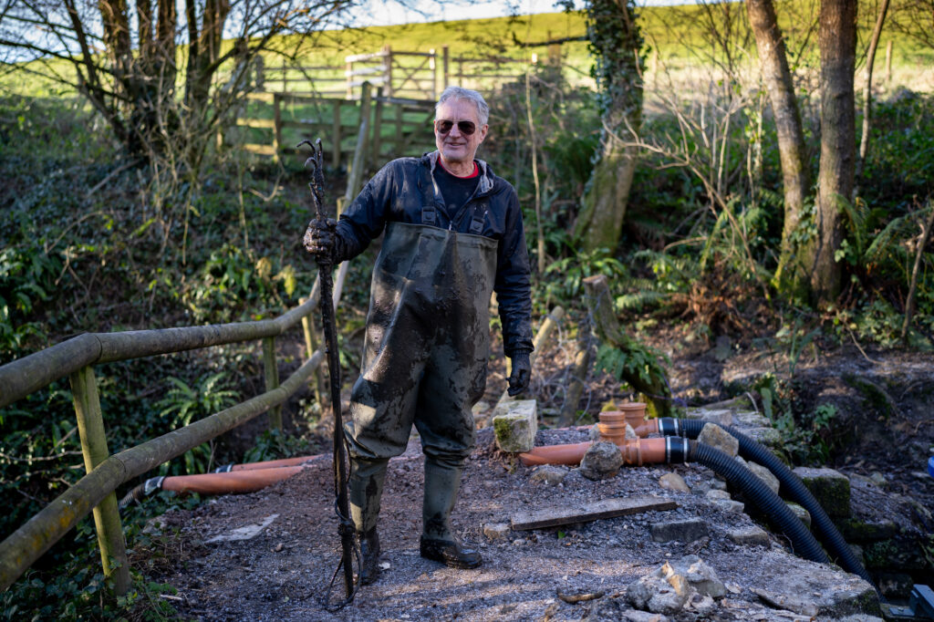 I have been returning to St Aldhelm’s Well and the ponds beyond intermittently since the summer.  I include those images below in a series of galleries.  The weather has been varied,  including very dull days.  Today there has been frost and bright sunshine,  and it was a pleasure making more photographs.  The owner of the ponds,  David Entwisle,   has been busy restoring them,  and i met him today dredging the first pond by hand.  Here is a portrait.