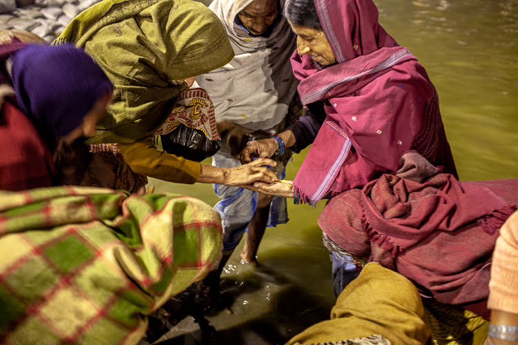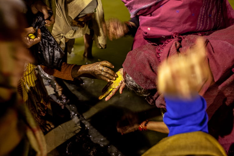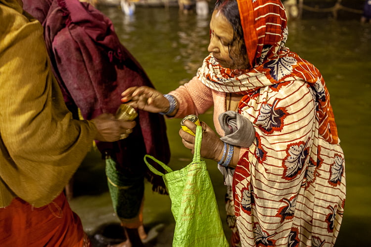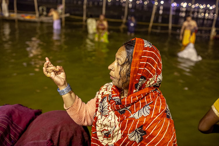Undoubtedly the greatest pleasure of the festival was walking through the multitudes of people at prayer beside the Ganges. That experience was amplified under the artificial sodium lamps at nightime; those thousands in worship were imbued with strange colours and, in the dimmest areas where the lamps were missing or of lower power, resembled ghosts of colour climbing up and down the river’s banks in the darkest parts of the night. In the strange light the fervour of prayer was also amplified.