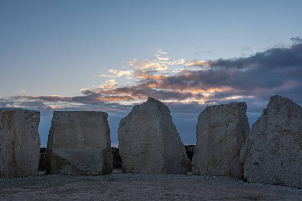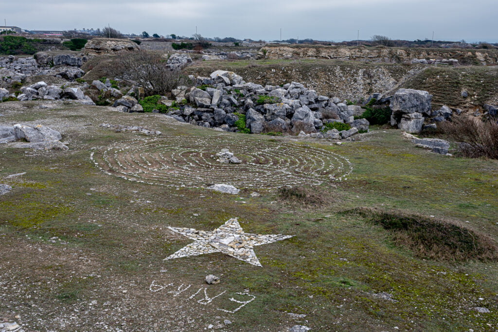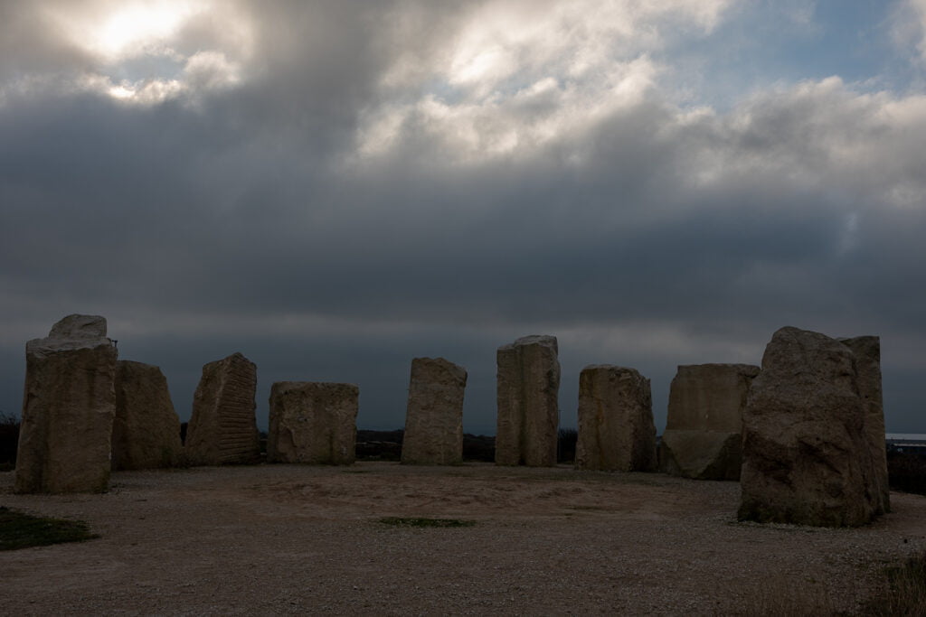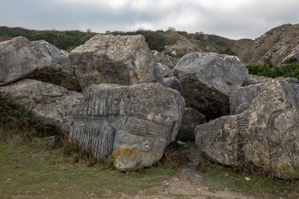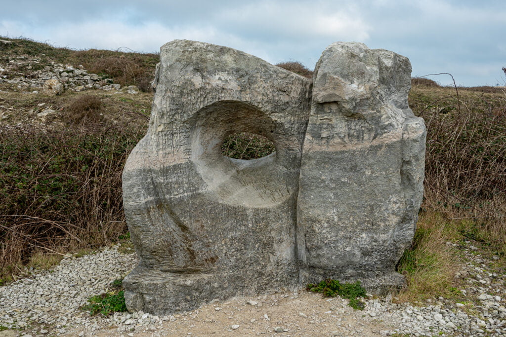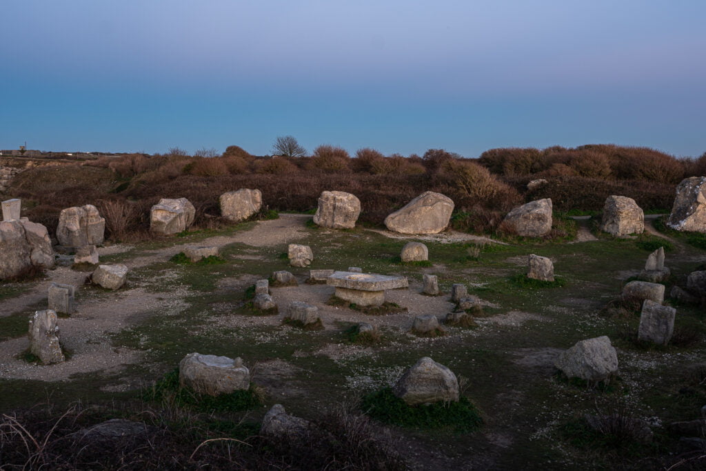 My interest in Portland revolves around The Tout Sculpture Park and Nature Reserve, the recently added Memory Stones ( a faux stone circle added in xxxx to the northern boundary of the Sculpture Park ), the ceremonial/monumental use of Portland stone in its churches particularly St George church and around the world, the High Angle battery foundations found by the Verne prison, and the general landscape which can be described as mostly bleak and windswept.