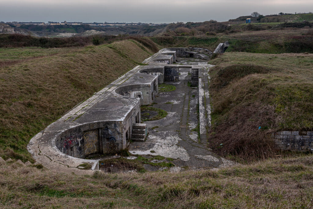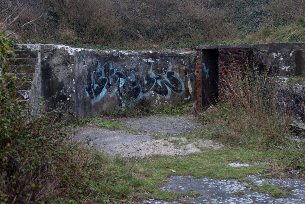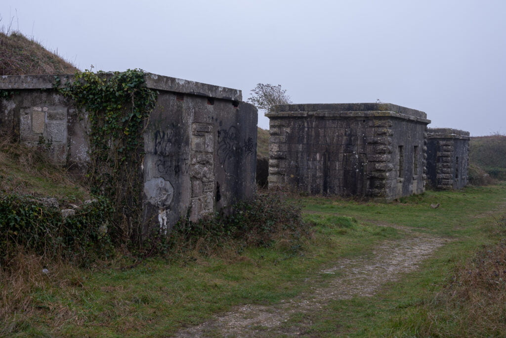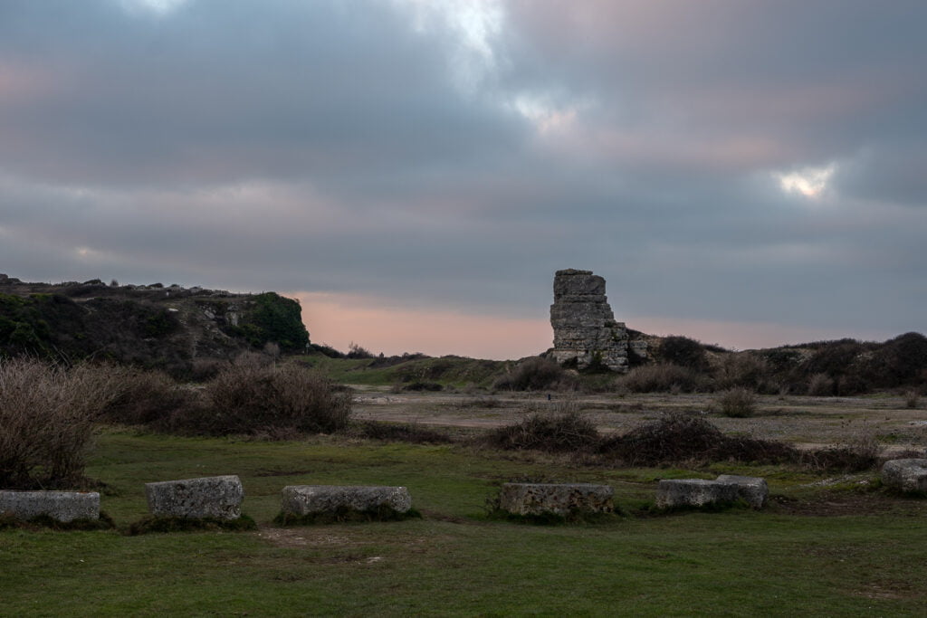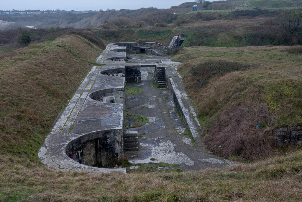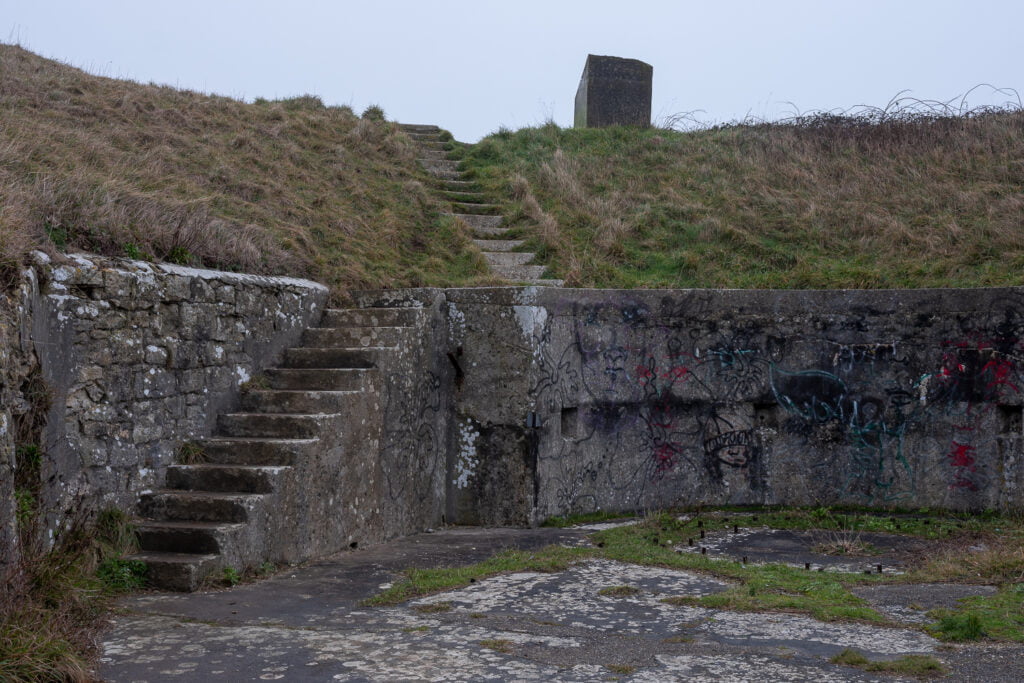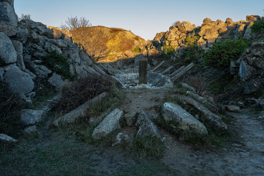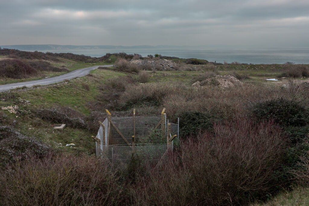 Just before sunset I photographed Nicodemus Knob, a stack of Portland stone some 30 feet high left intact at East Cliff. The top of the stack represents the former level of the ground before the land was purchased by the Crown and the stone quarried from here to build the breakwaters of Portland harbour between 1849-1872. There are an abundance of air vents, entrances and links with the tunnels below, incongruous in the landscape. An open faced working quarry is adjacent to this area. The High Angle Battery remains are also in this area, first photograph below, more of this later.