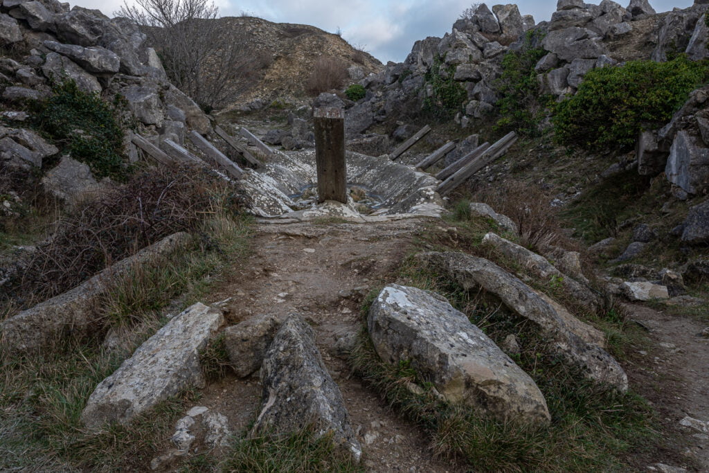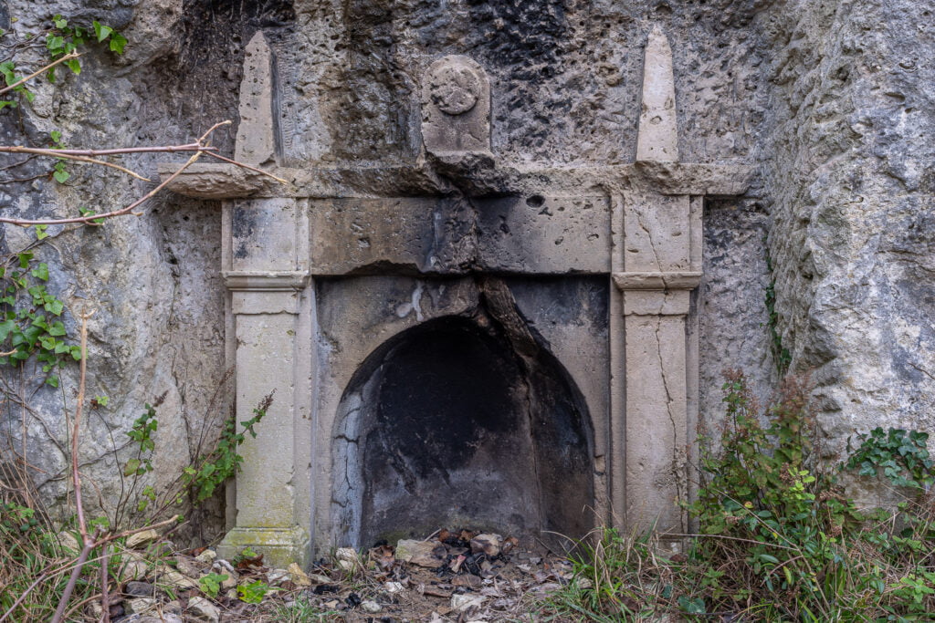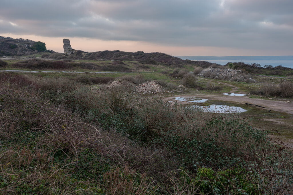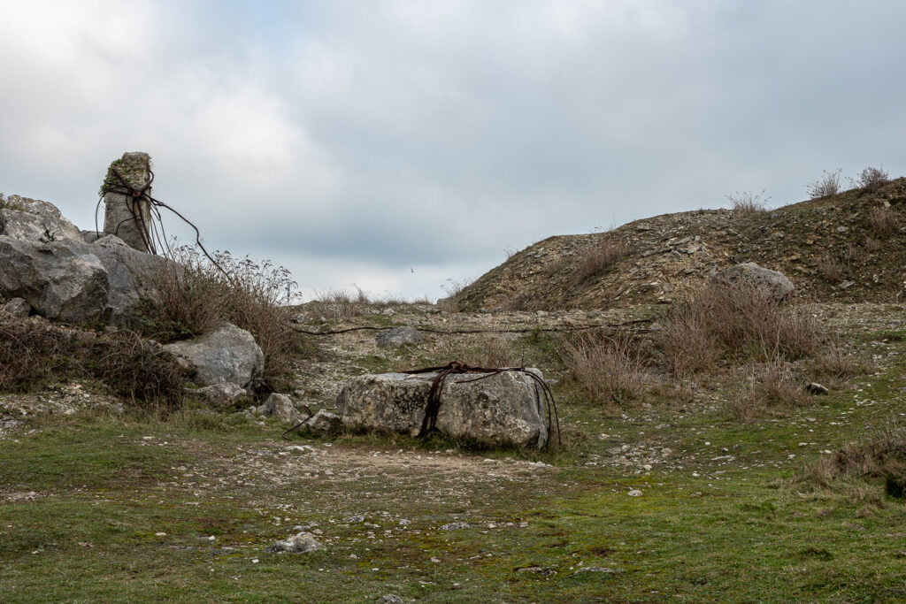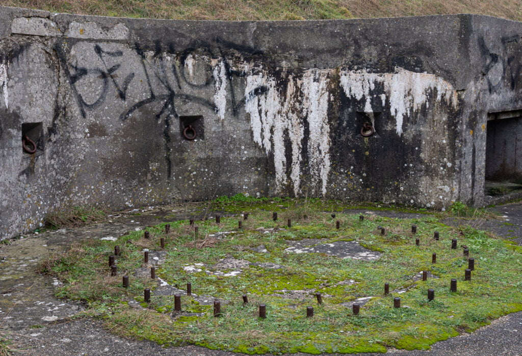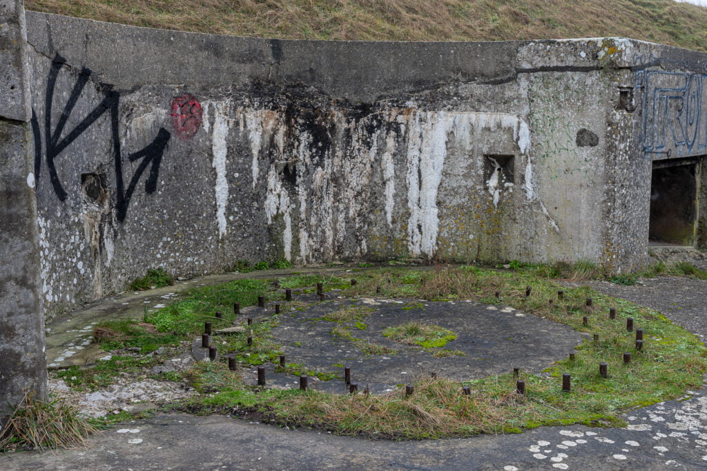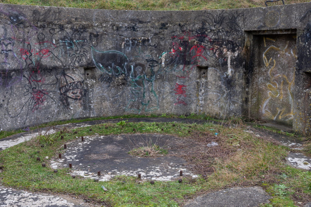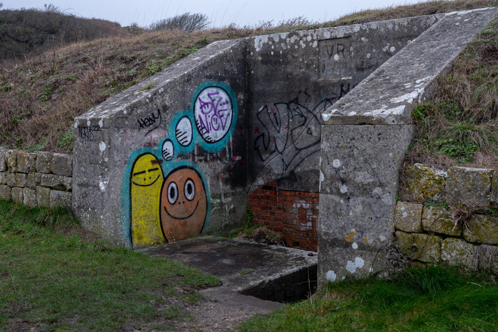 Just before sunset I photographed Nicodemus Knob, a stack of Portland stone some 30 feet high left intact at East Cliff. The top of the stack represents the former level of the ground before the land was purchased by the Crown and the stone quarried from here to build the breakwaters of Portland harbour between 1849-1872. There are an abundance of air vents, entrances and links with the tunnels below, incongruous in the landscape. An open faced working quarry is adjacent to this area. The High Angle Battery remains are also in this area, first photograph below, more of this later.
