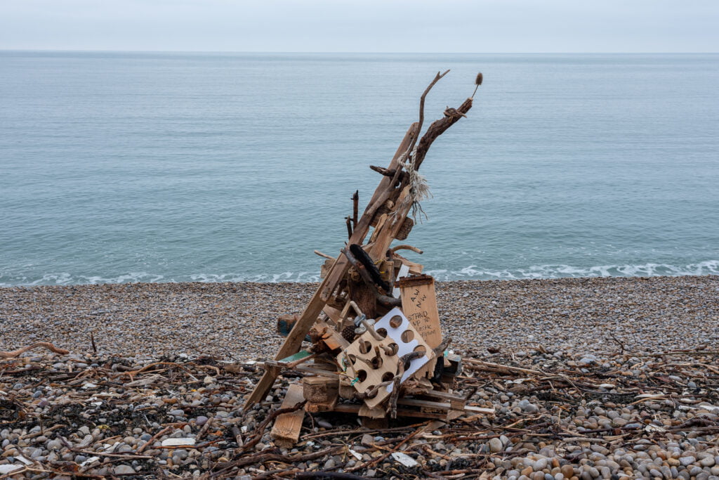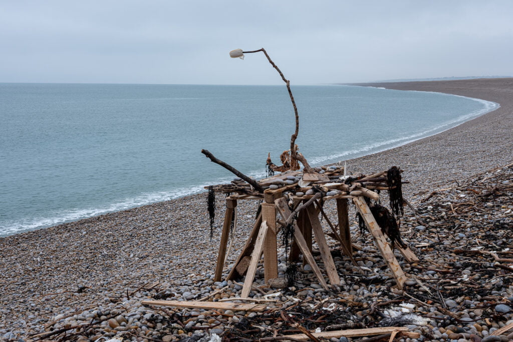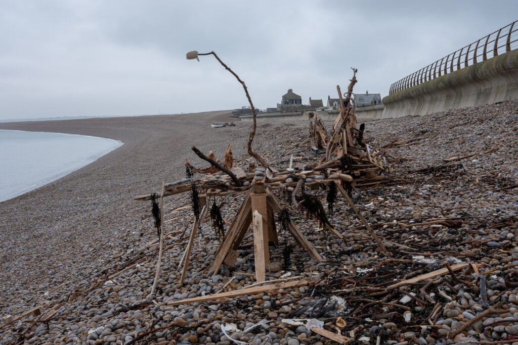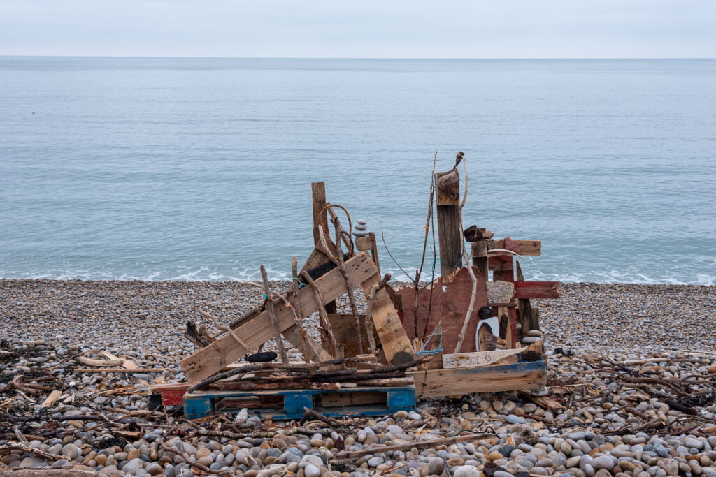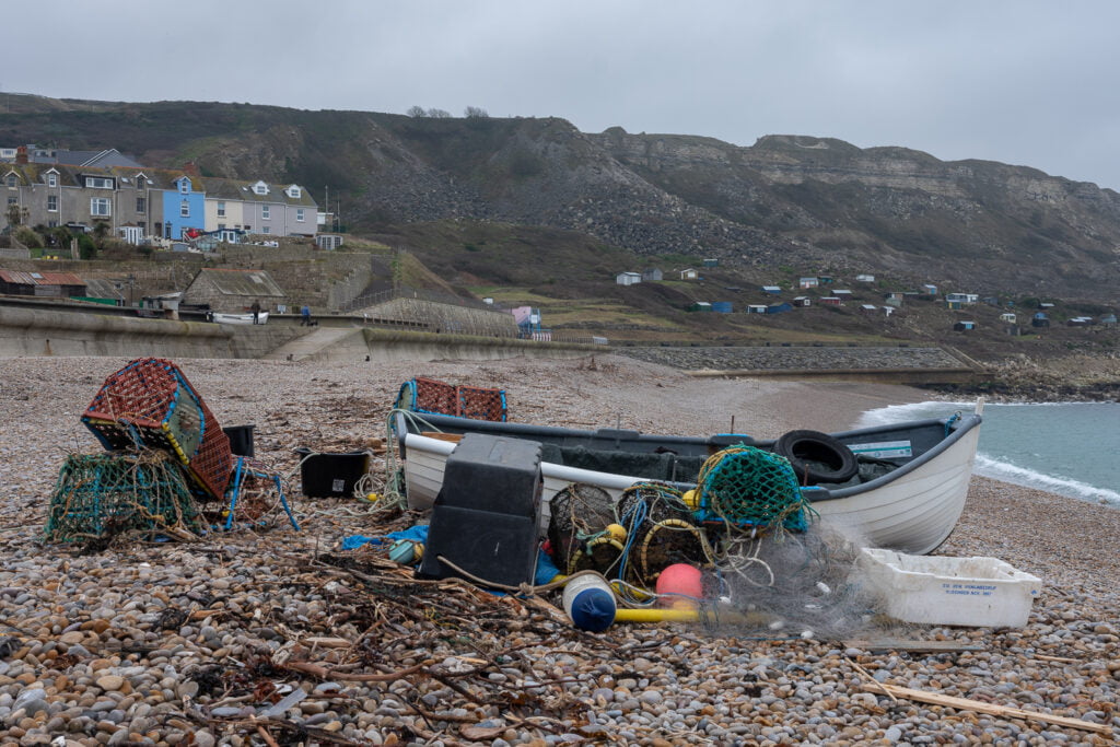 Another bitterly cold day, but a little brighter with initially sun and blue sky. Chesil Beach comes to its southern end at Portland, specifically at Chesil Cove and the small village of Chiswell. After storms, the curved steep bank of pebbles is often covered in driftwood and there were several structures there which had been made from strom-deposited detritis. Small fish had also been washed up, and a small fishing boat and its acoutrements was tethered to the wall some yards up the shingle. Looking back towards Portland and behind the small boat the cliifs rise beyond West Weares to Tout Quarry above, the location of the Sculpture Park.