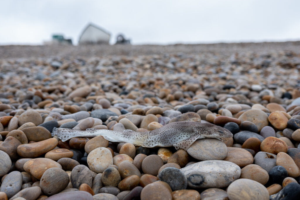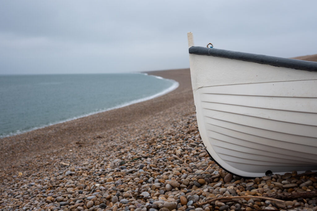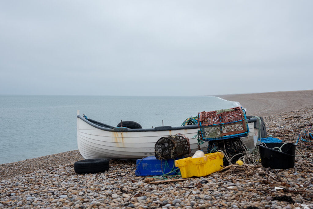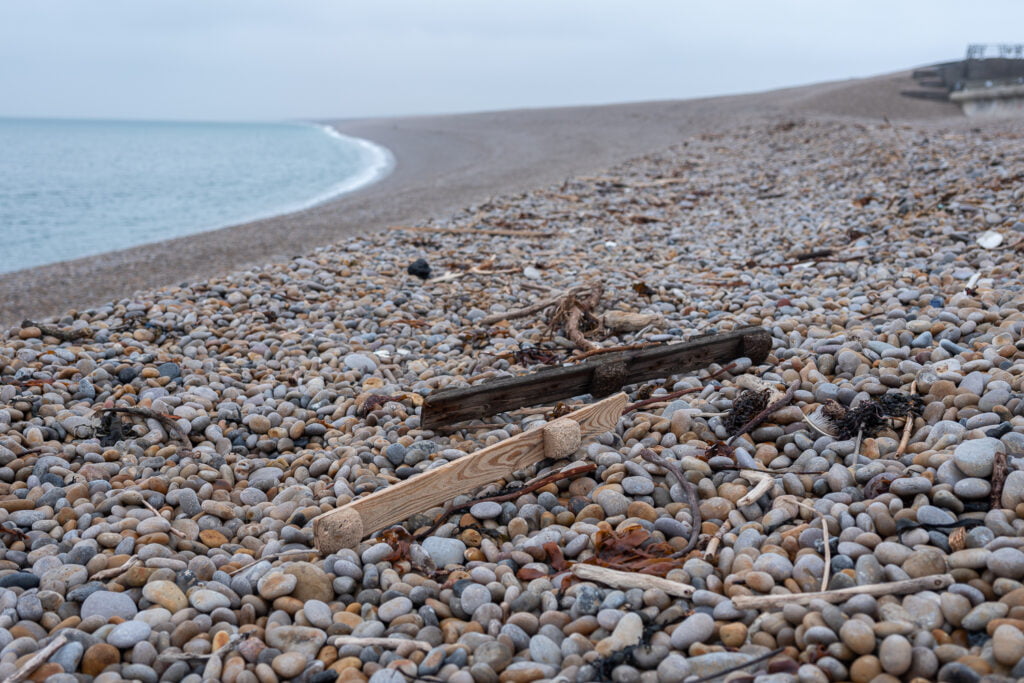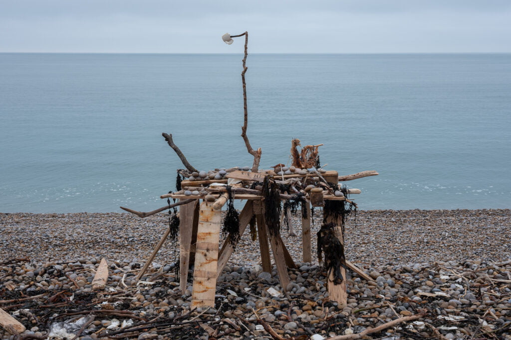 Another bitterly cold day, but a little brighter with initially sun and blue sky. Chesil Beach comes to its southern end at Portland, specifically at Chesil Cove and the small village of Chiswell. After storms, the curved steep bank of pebbles is often covered in driftwood and there were several structures there which had been made from strom-deposited detritis. Small fish had also been washed up, and a small fishing boat and its acoutrements was tethered to the wall some yards up the shingle. Looking back towards Portland and behind the small boat the cliifs rise beyond West Weares to Tout Quarry above, the location of the Sculpture Park.