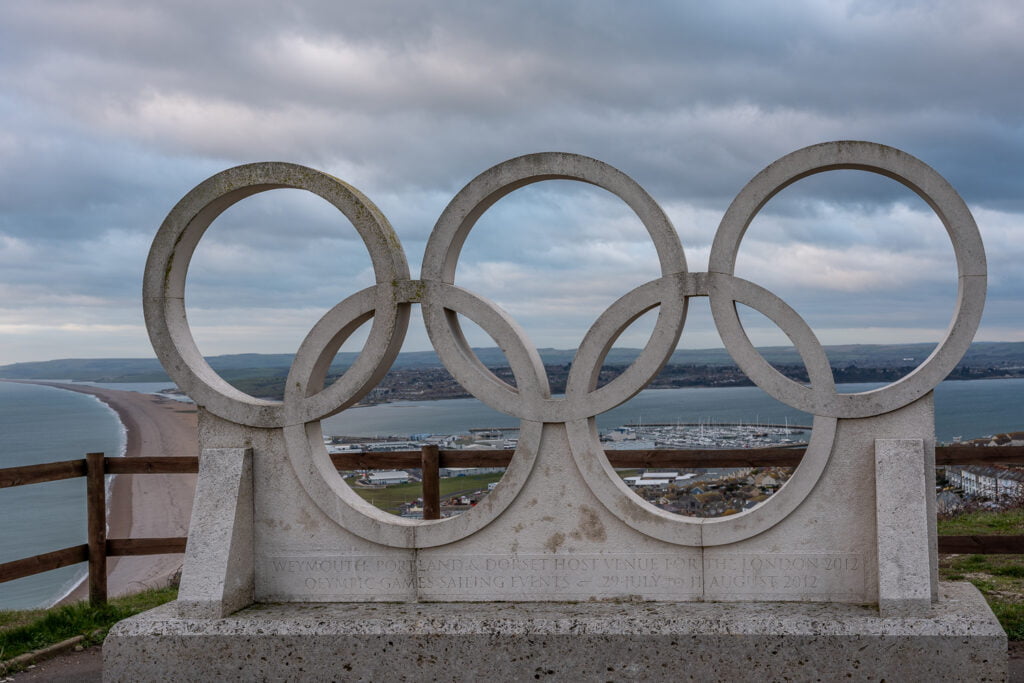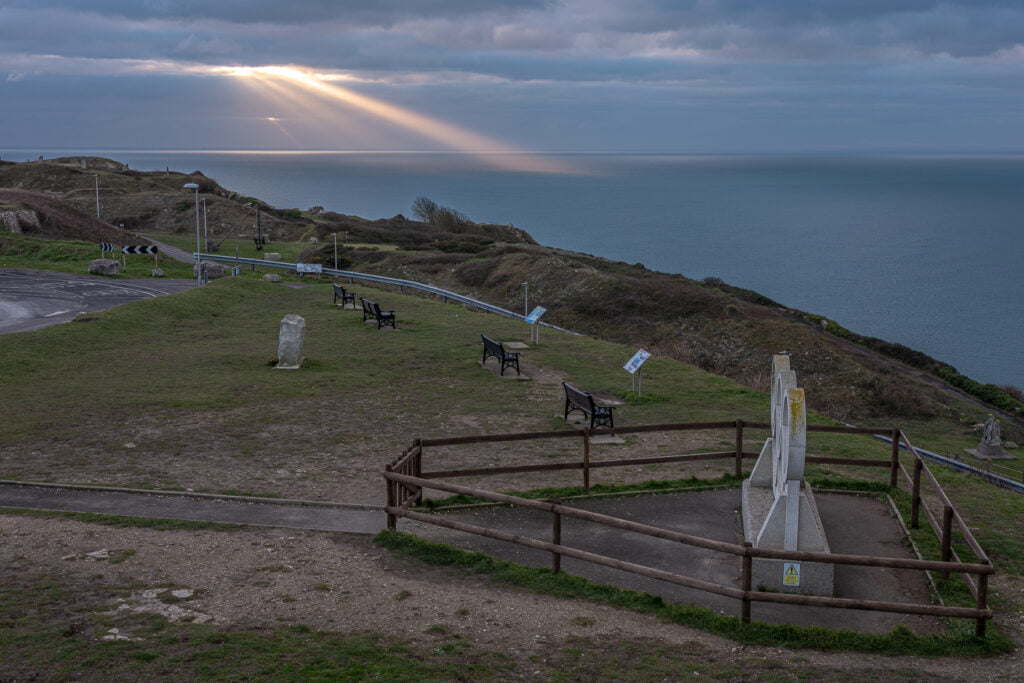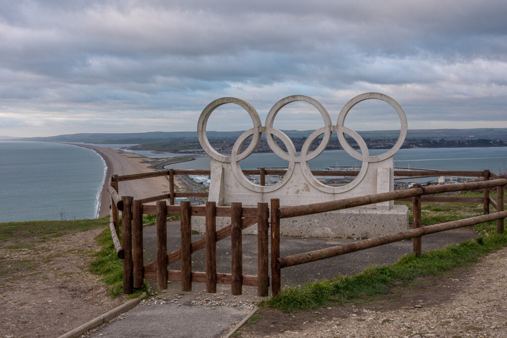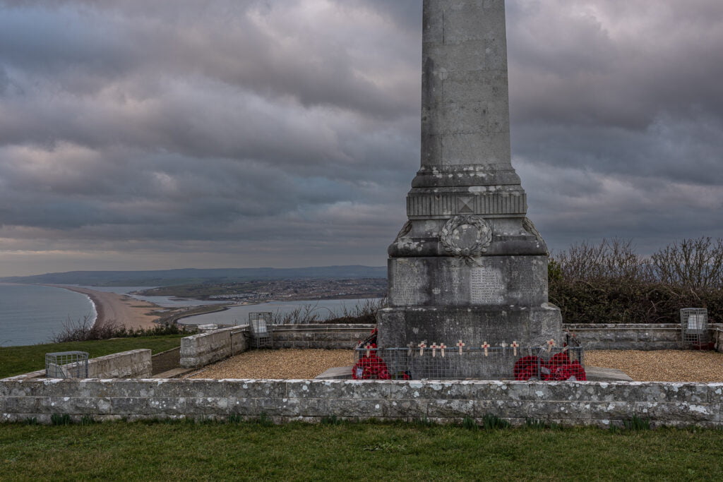 I spent the last part of the afternoon around The Heights Hotel and Cafe, photographing the changing skyscape looking back towards Weymouth, with the 2012 Olympic Rings, the War Memorial and the Memory Stones in the foreground.