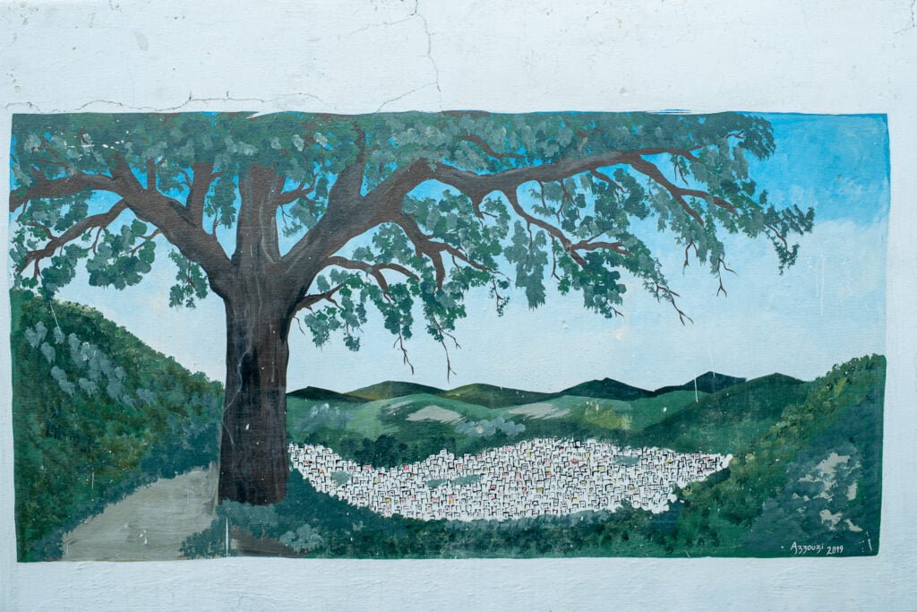 Ouezzane, some 50 miles south of Chefchaouen, is famous for its local olive productions, and the medina is painted green to both reflect that and also to reflect its spiritual, Sufi associations; green is the colour of paradise in the Quran. Many of its wall paintings depict large, sheltering olive trees above an African urban settlement.