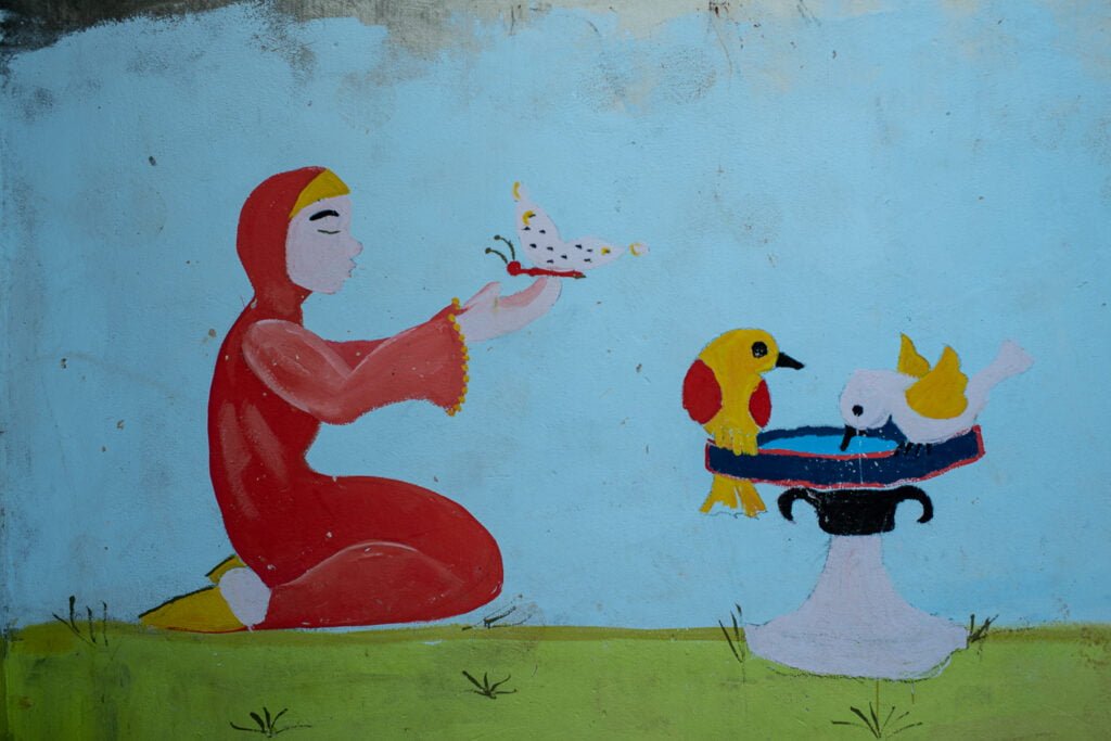 The three areas visited recently, Chefchaouen, Fez and Ouezzane, are significantly different towns and cities, and in these representations Chefchaouen, a once isolated northern town in the Rif mountains, has become a popular tourist destination. It is famous for its ubiquitous blue colour throughout its medina, depiction of its Riffian mountain culture through paintings and colourful useage of Spanish style ceramics . The local springs at Ras el Maa provide a plentiful water supply to the town and may explain why there is little depiction of waterways and rivers in its local street art.