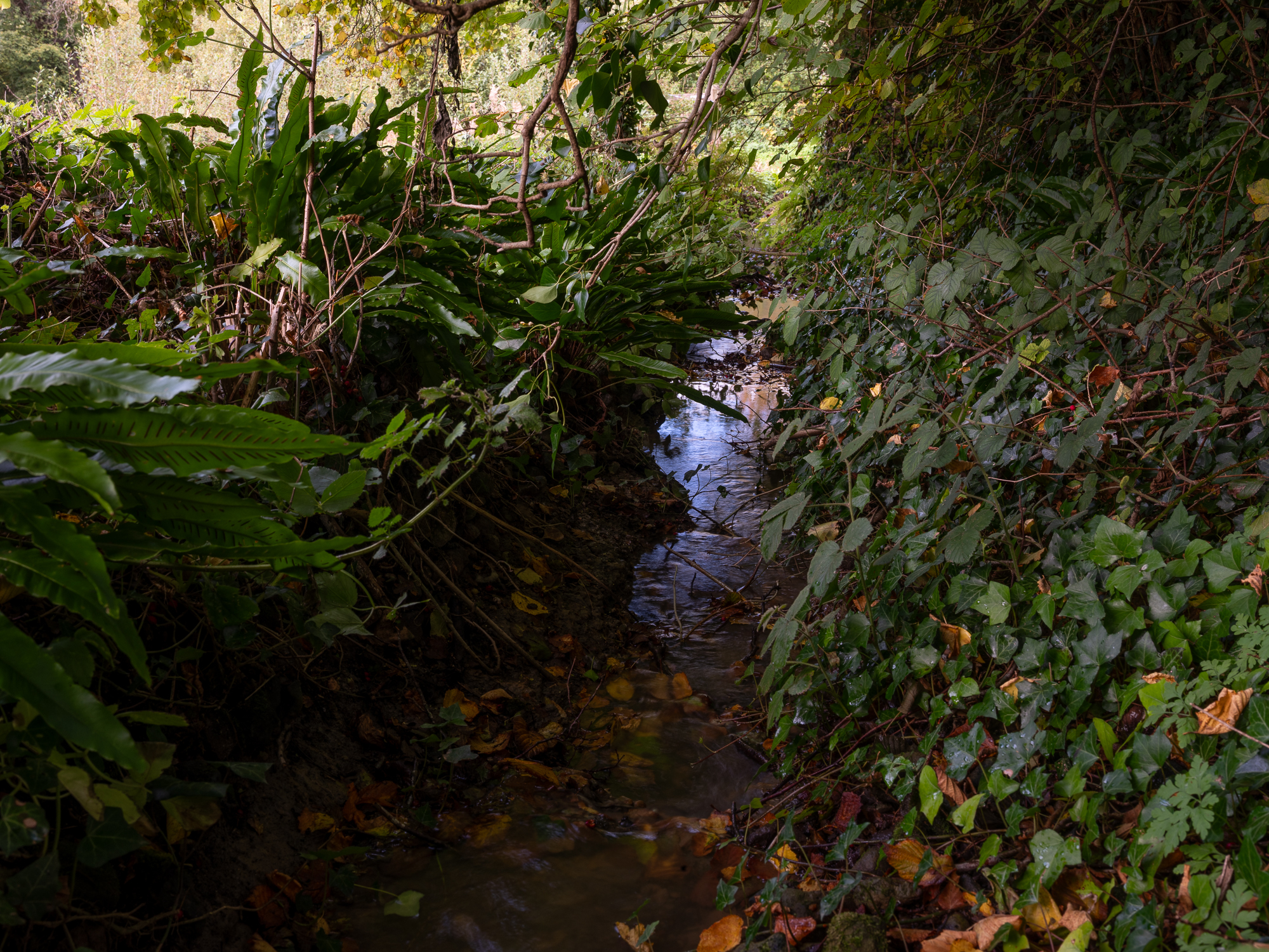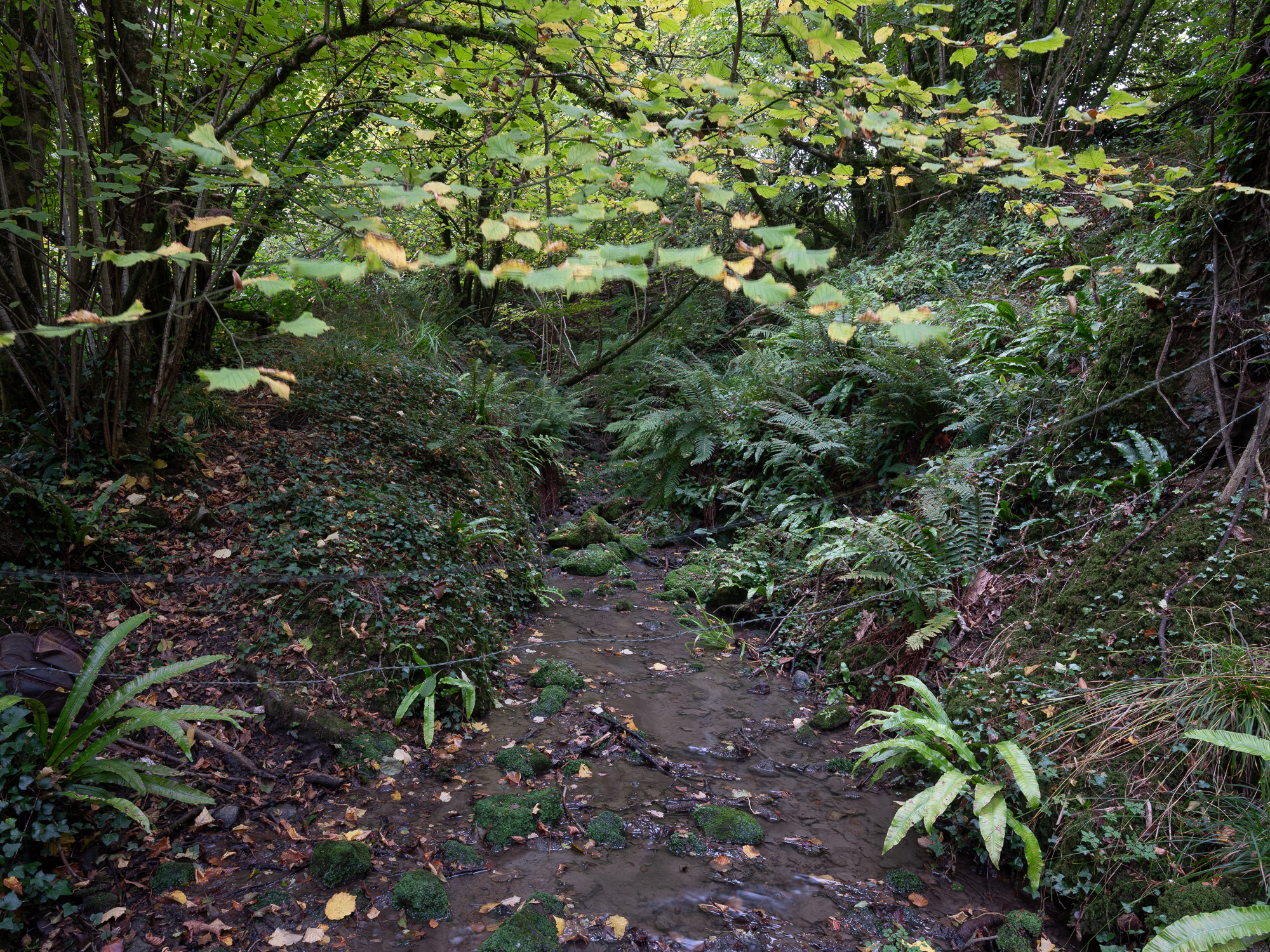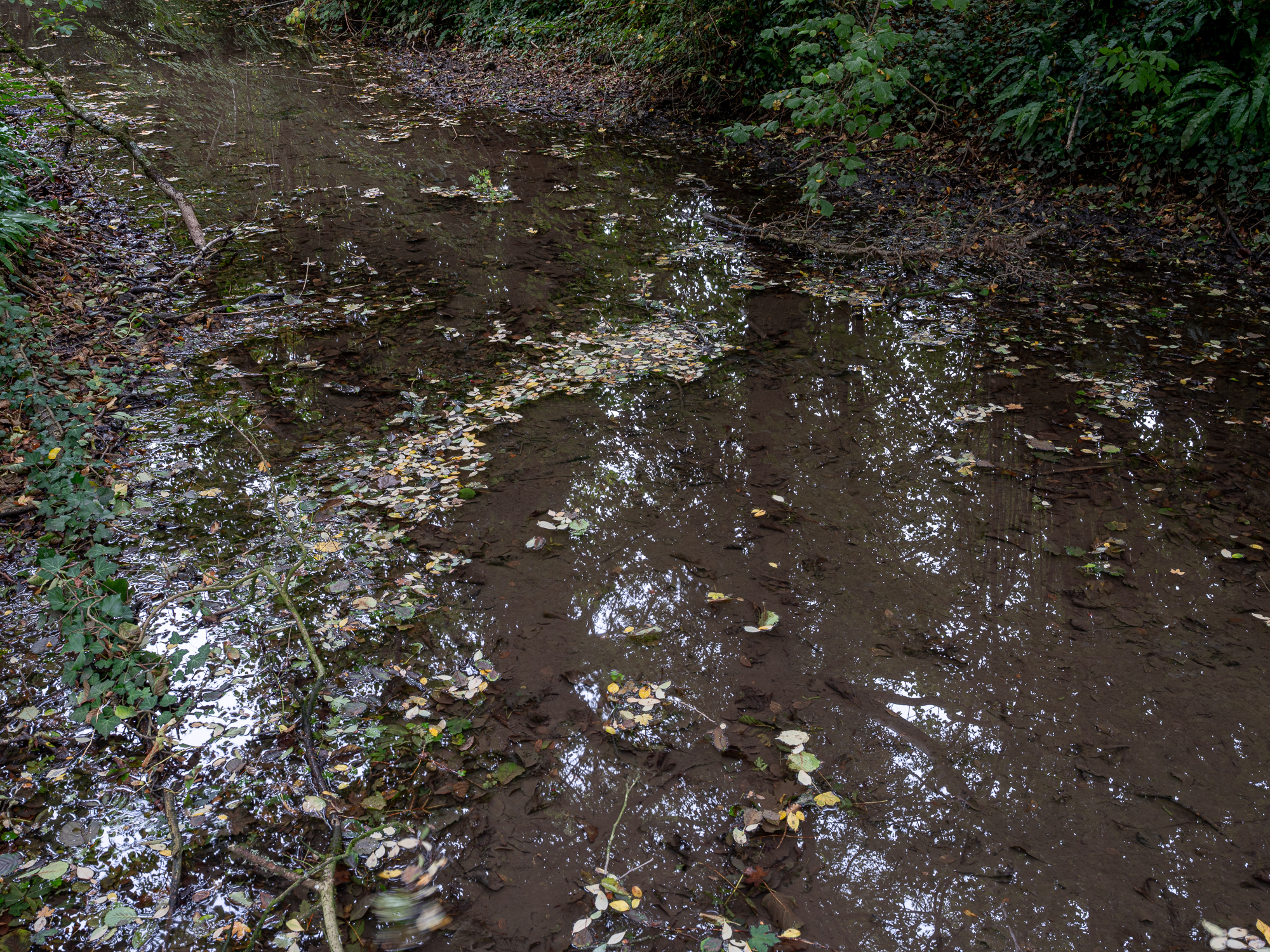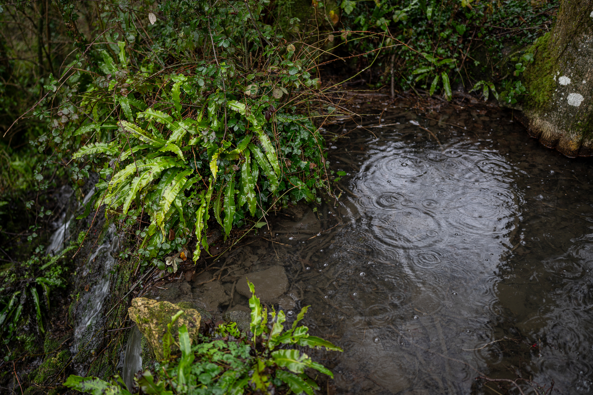 The man finished his washing and walked across the narrow road and entered a gate into a driveway where his car was parked.  The drive appeared to be at the head of a footpath which wound its way down into a some trees and undergrowth,  with the burbling channel of water from St Aldhelm’s Well running along beside it.  The woman began filling her bottles and I readied my camera for when she had finished her collection.  As she finished,  the man returned and also began having a conversation.  He said he owned the land nearby and,  with the water from the spring that fed St Alhelm’s Well,  there were other springs on his land,  and a series of ponds,  which together formed the head of the River Sheppey.  Intrigued,  I enquired whether he could show me these springs and ponds,  and he kindly said yes.
