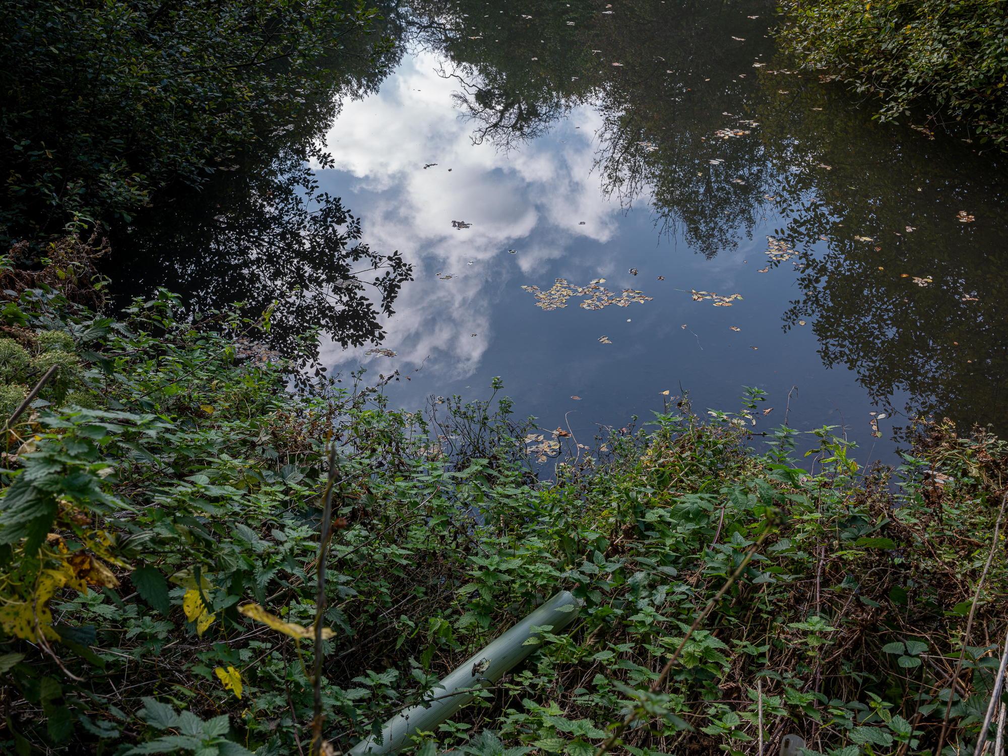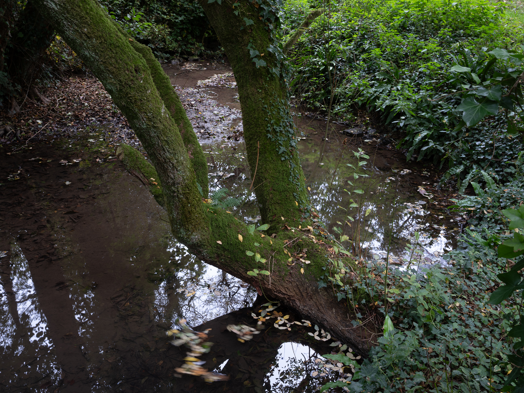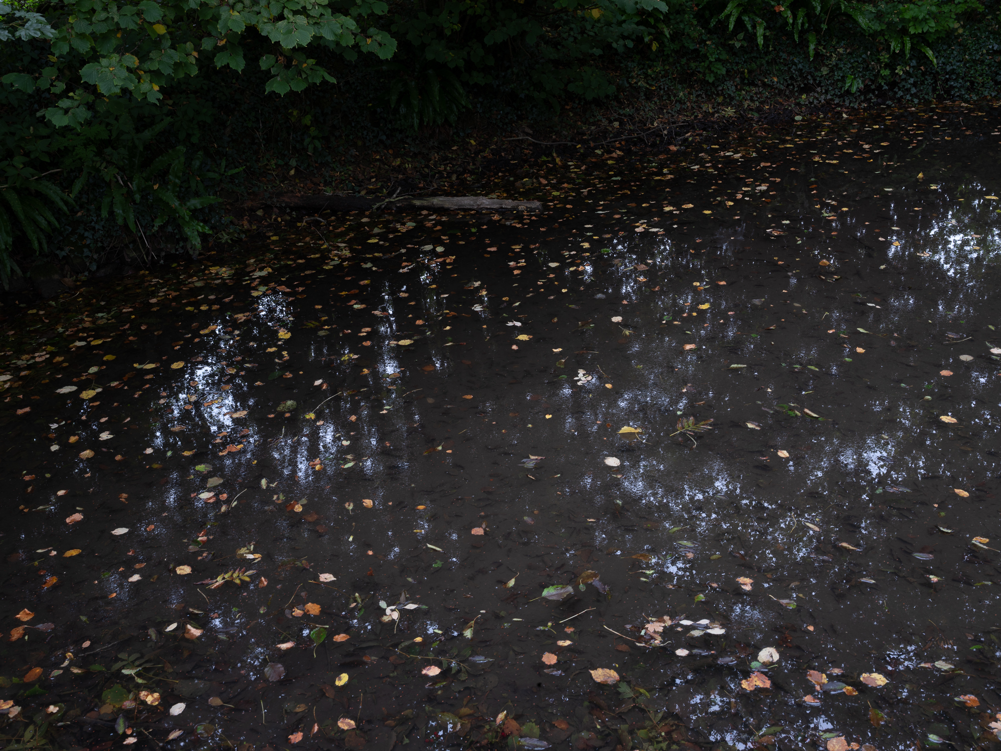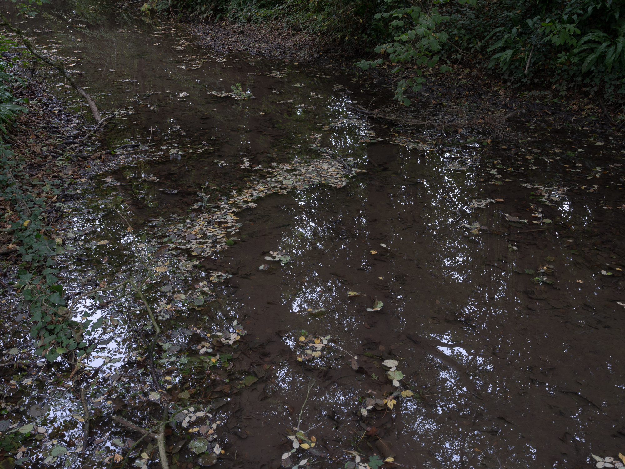 The man finished his washing and walked across the narrow road and entered a gate into a driveway where his car was parked.  The drive appeared to be at the head of a footpath which wound its way down into a some trees and undergrowth,  with the burbling channel of water from St Aldhelm’s Well running along beside it.  The woman began filling her bottles and I readied my camera for when she had finished her collection.  As she finished,  the man returned and also began having a conversation.  He said he owned the land nearby and,  with the water from the spring that fed St Alhelm’s Well,  there were other springs on his land,  and a series of ponds,  which together formed the head of the River Sheppey.  Intrigued,  I enquired whether he could show me these springs and ponds,  and he kindly said yes.