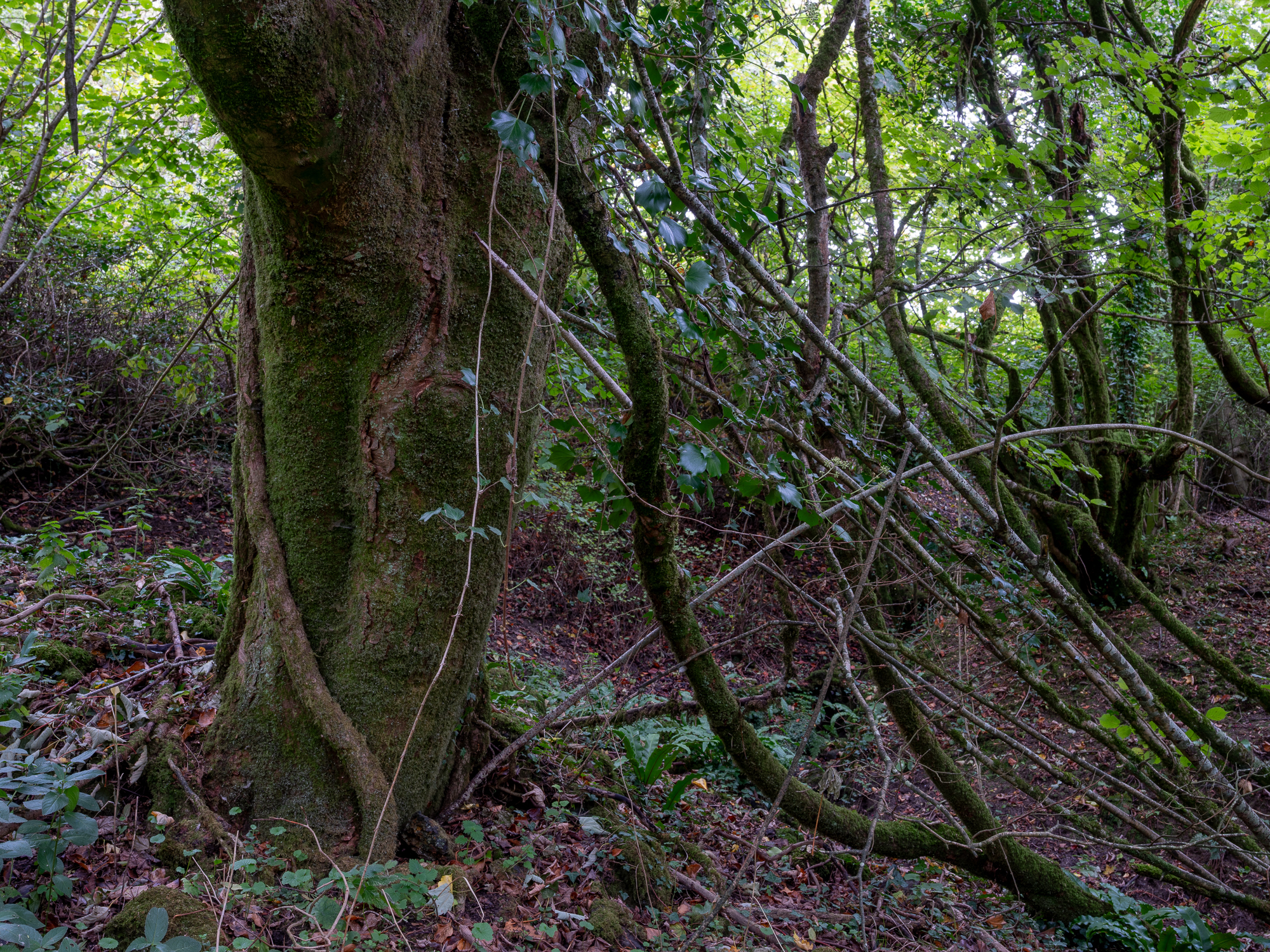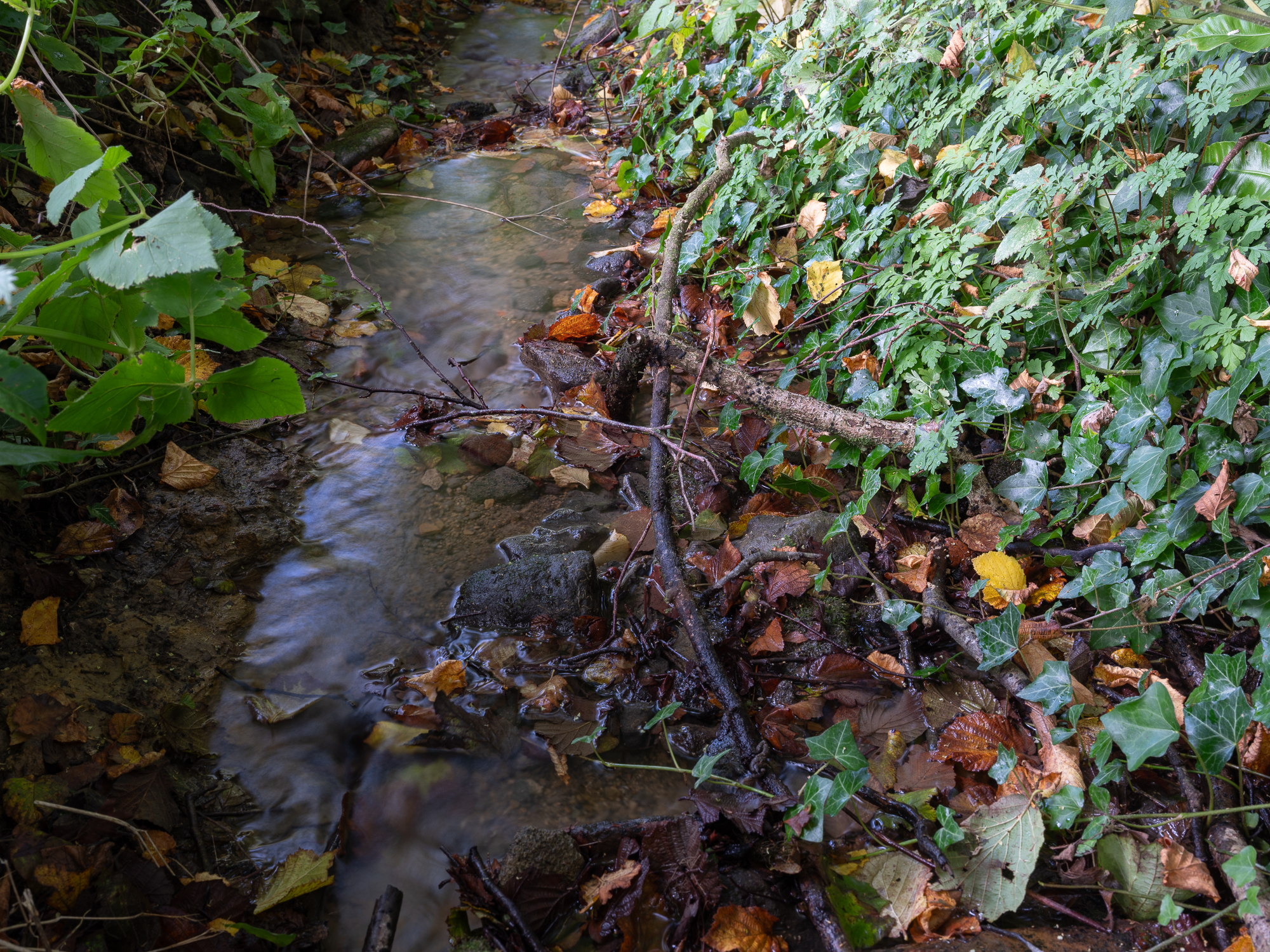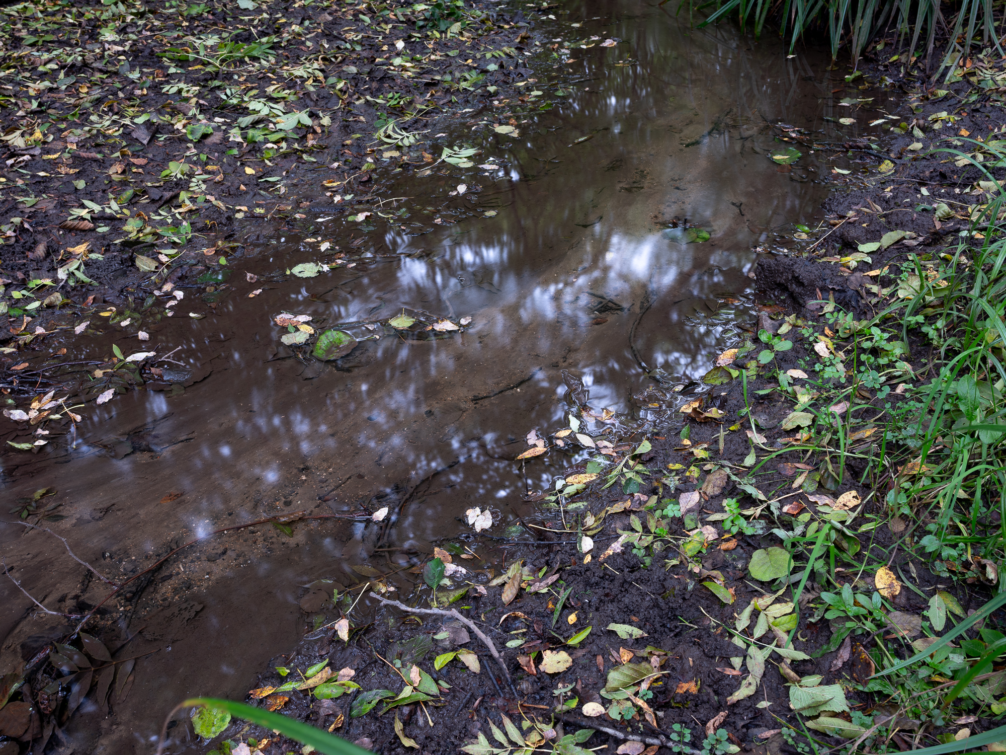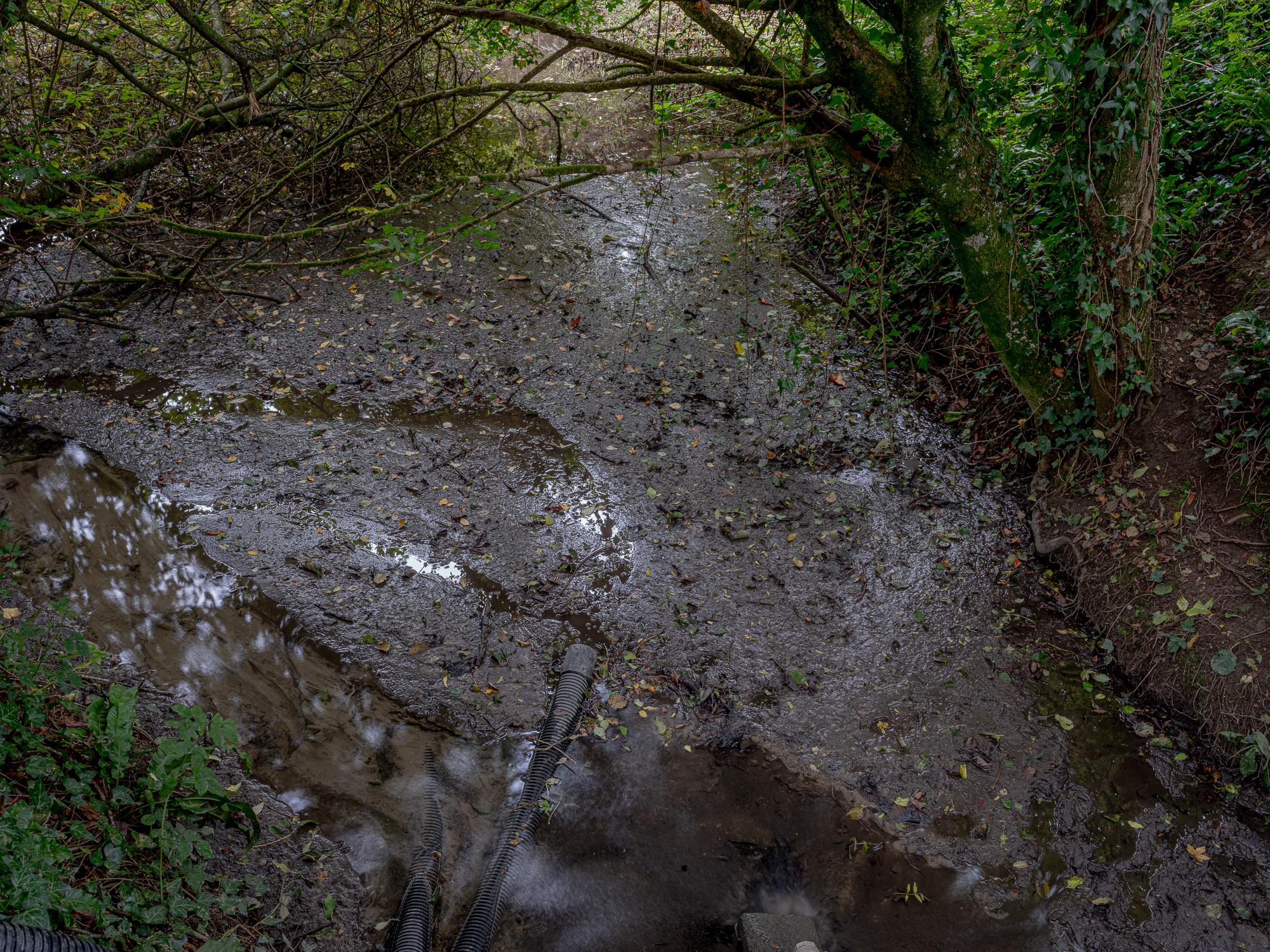 The man finished his washing and walked across the narrow road and entered a gate into a driveway where his car was parked.  The drive appeared to be at the head of a footpath which wound its way down into a some trees and undergrowth,  with the burbling channel of water from St Aldhelm’s Well running along beside it.  The woman began filling her bottles and I readied my camera for when she had finished her collection.  As she finished,  the man returned and also began having a conversation.  He said he owned the land nearby and,  with the water from the spring that fed St Alhelm’s Well,  there were other springs on his land,  and a series of ponds,  which together formed the head of the River Sheppey.  Intrigued,  I enquired whether he could show me these springs and ponds,  and he kindly said yes.