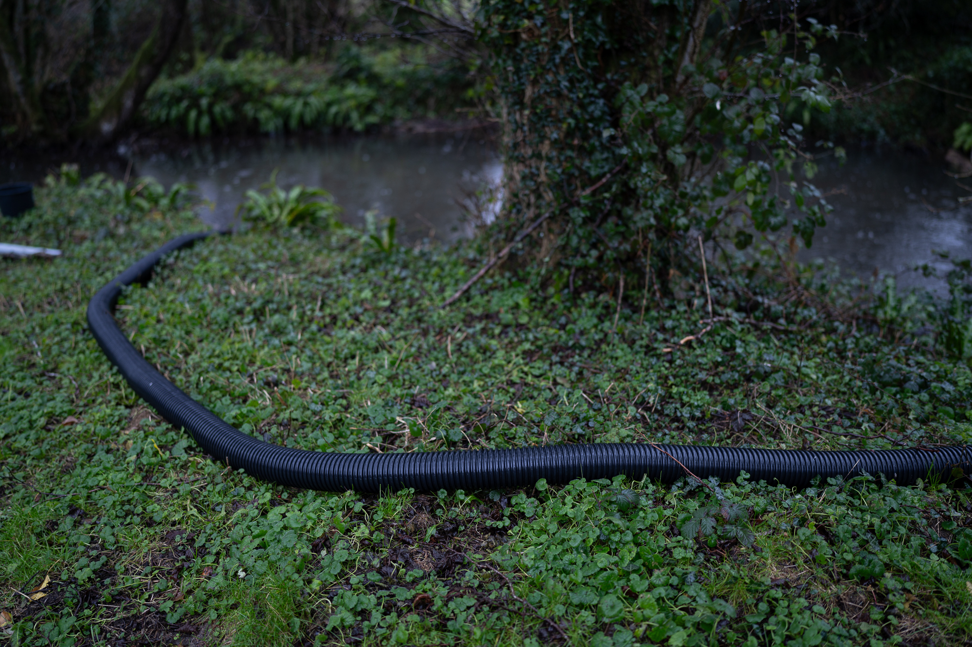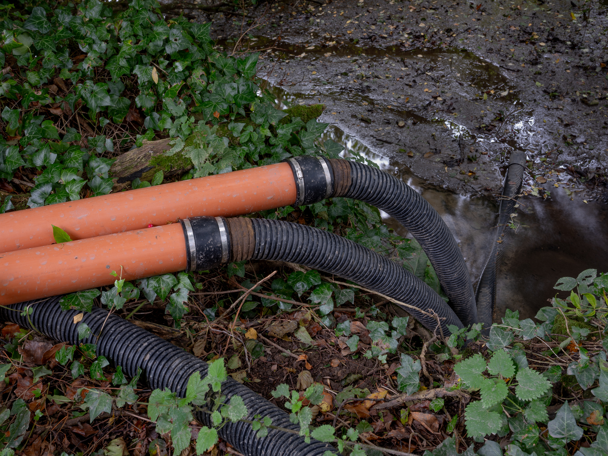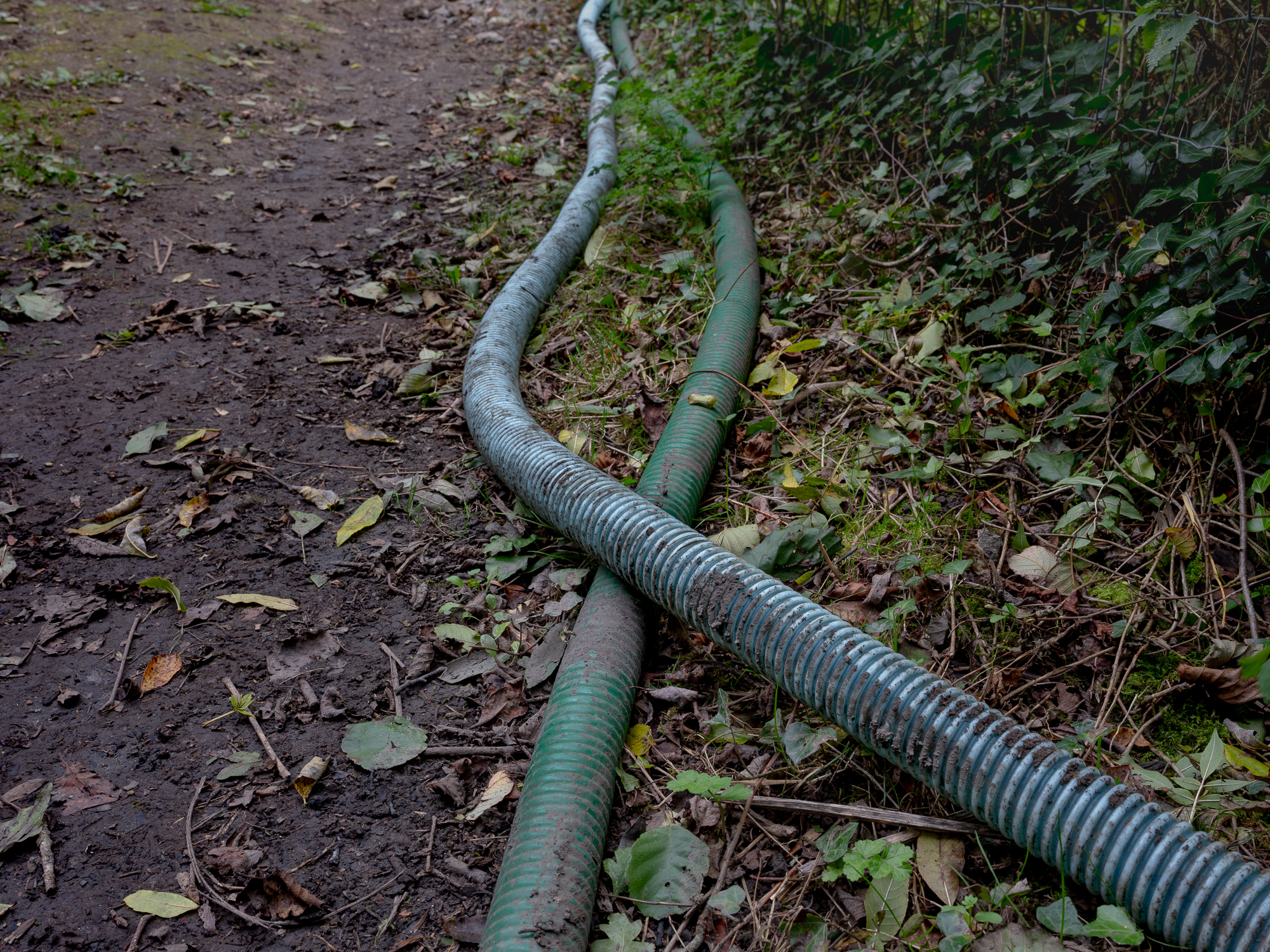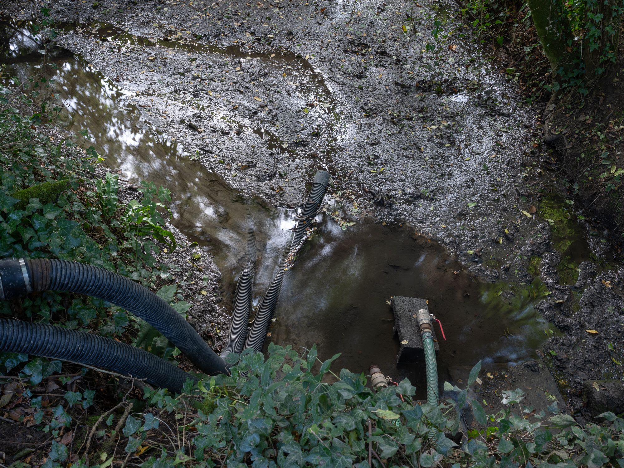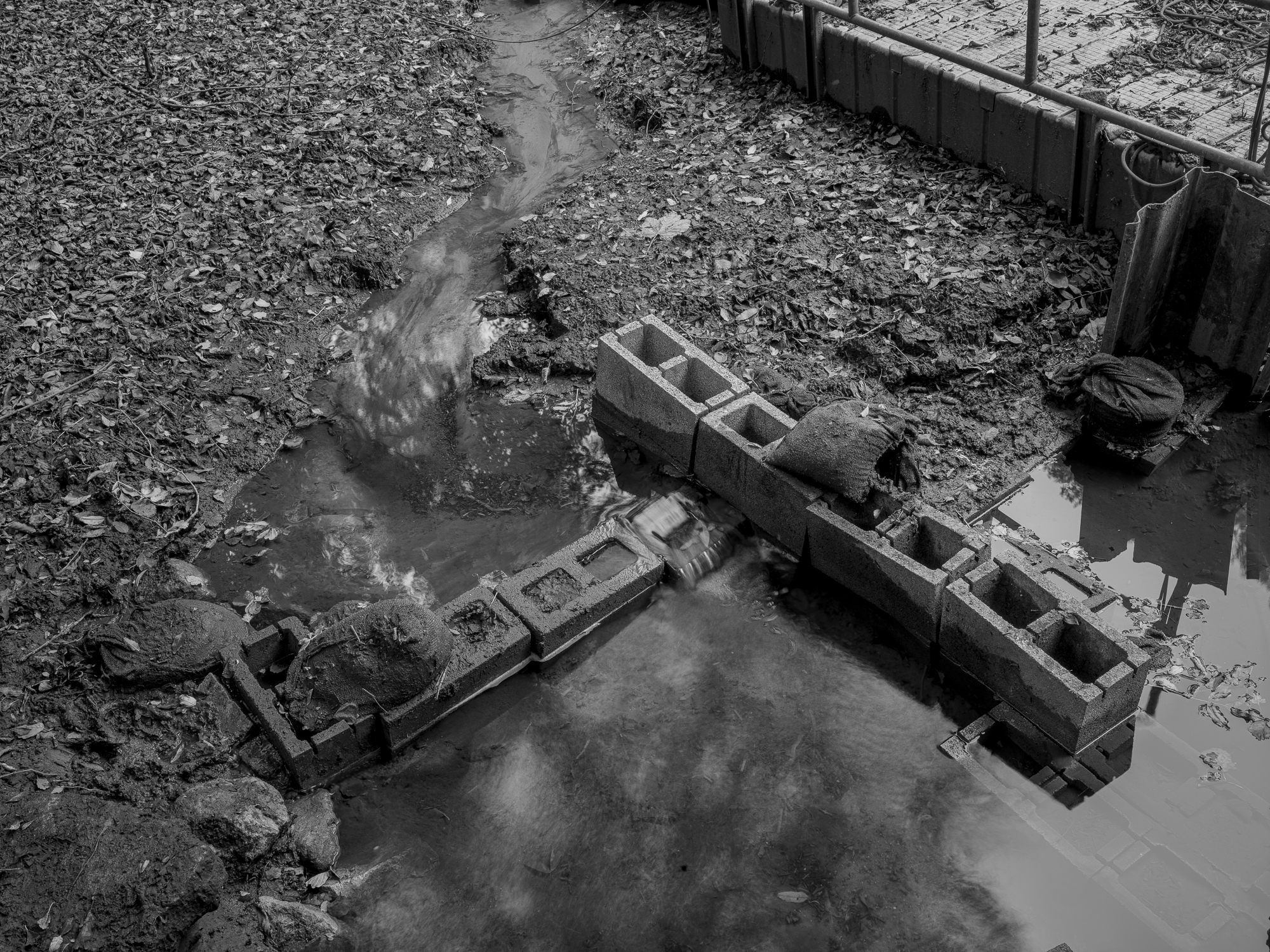 The image above shows what is left of the industrial buildings.  In an effort to clean the mud and the silt from the ponds, David has set up a filtration system using straw to separate the silt  ( below).