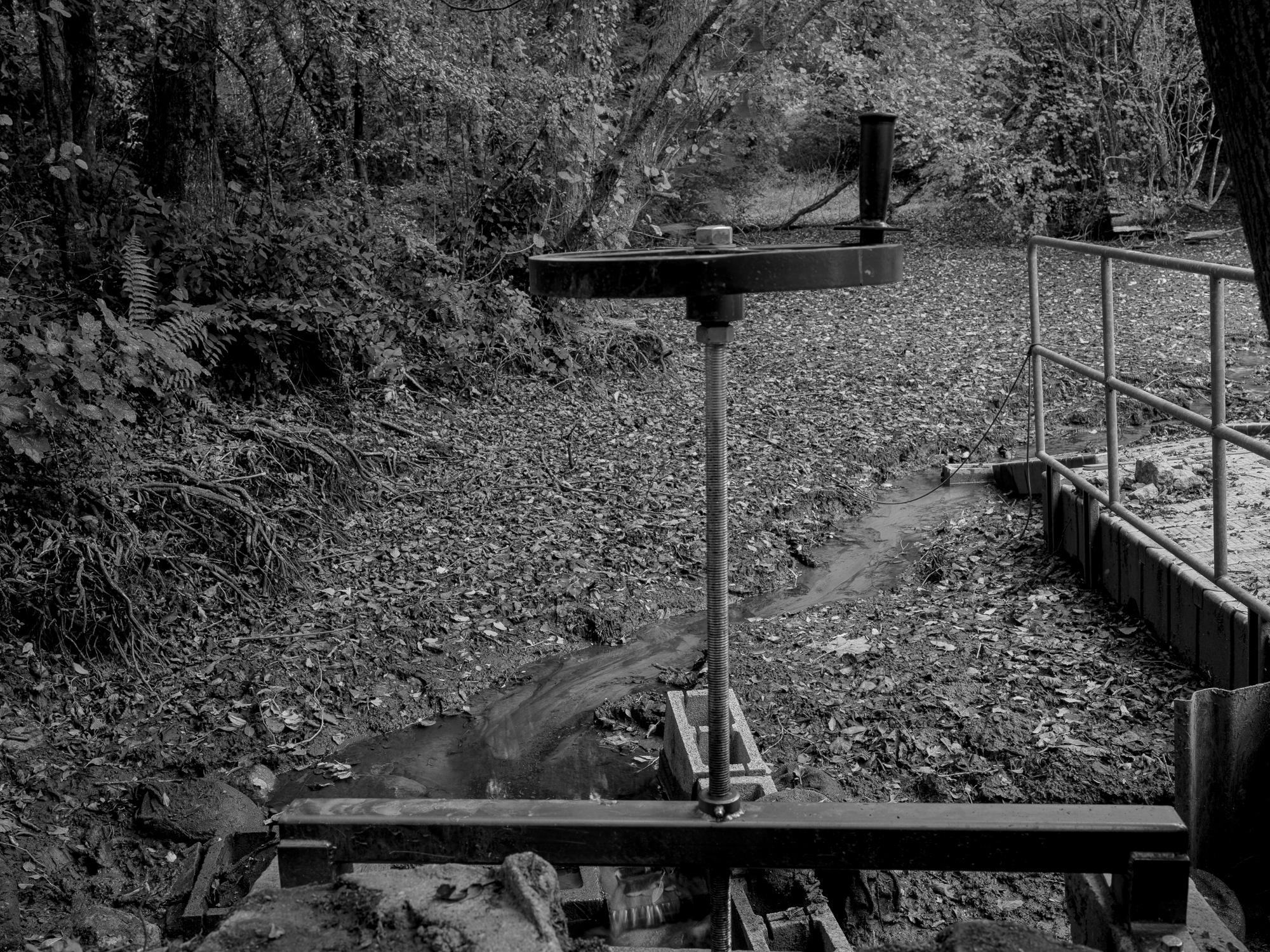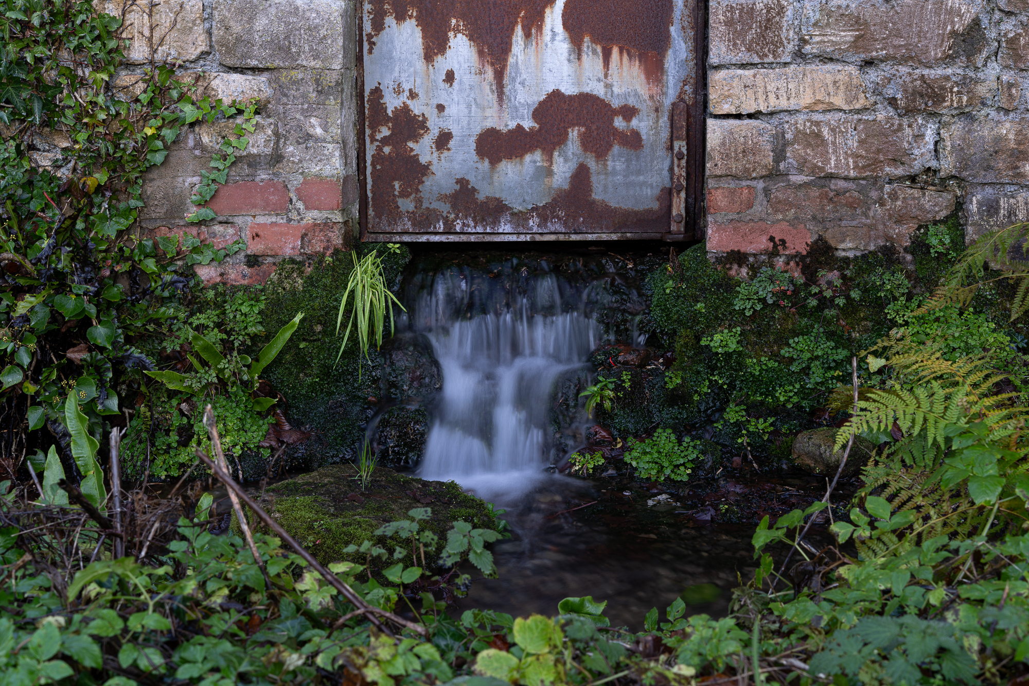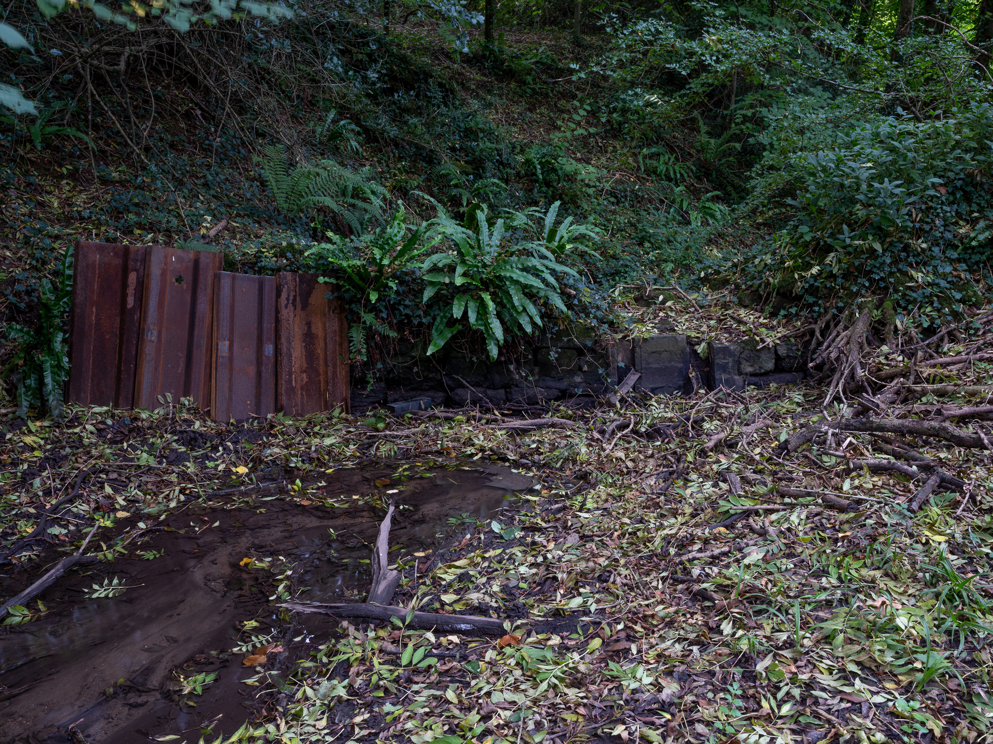 The second pond has a drainage hole which David has restored and has also supported by attaching a metal cap ( below,  bottom of image ),  which prevents blockage by leaves and branches,  and this leads by culvert firstly and then by freeflowing down a channel to where it formerly propelled a mill wheel,  no longer in situ.  This in turn drove the grinding stones and possibly the bellow/forge machinery which fabricated and sharpened  the blades.