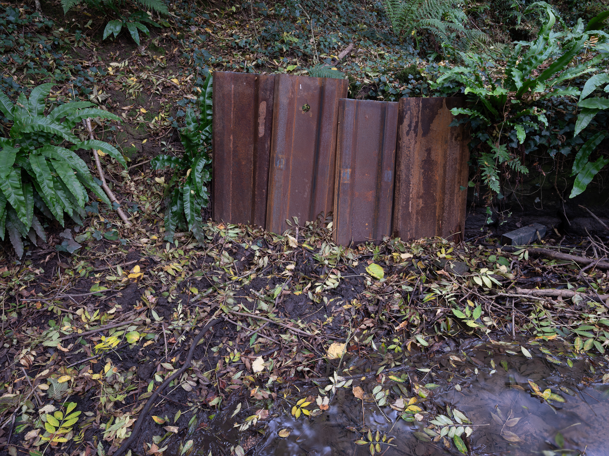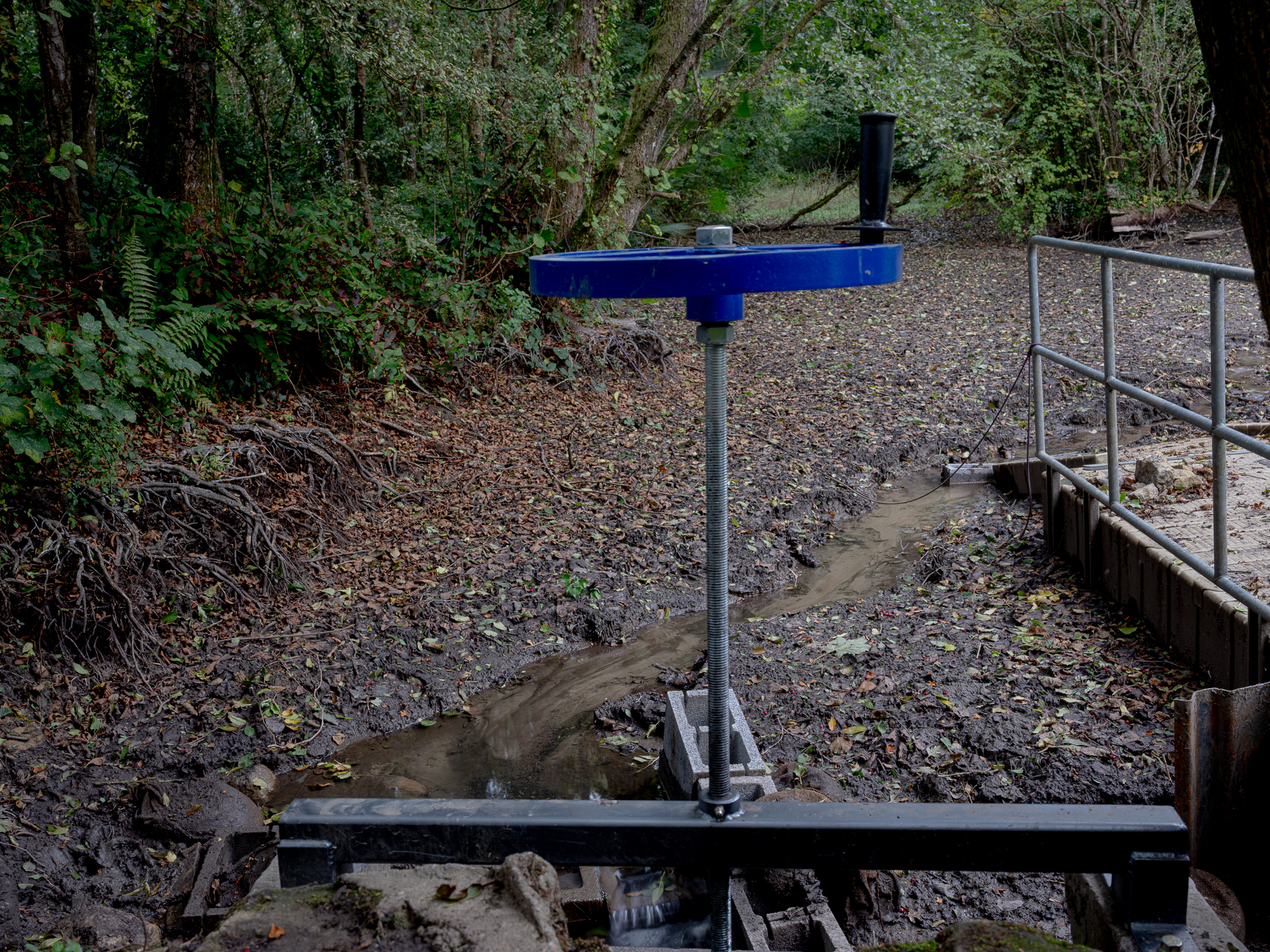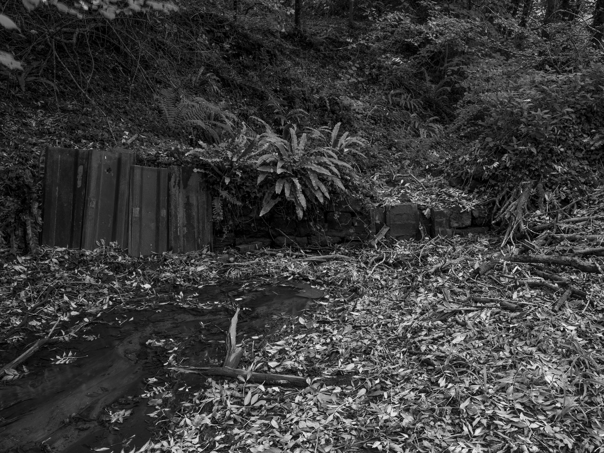 The second pond has a drainage hole which David has restored and has also supported by attaching a metal cap ( below,  bottom of image ),  which prevents blockage by leaves and branches,  and this leads by culvert firstly and then by freeflowing down a channel to where it formerly propelled a mill wheel,  no longer in situ.  This in turn drove the grinding stones and possibly the bellow/forge machinery which fabricated and sharpened  the blades.