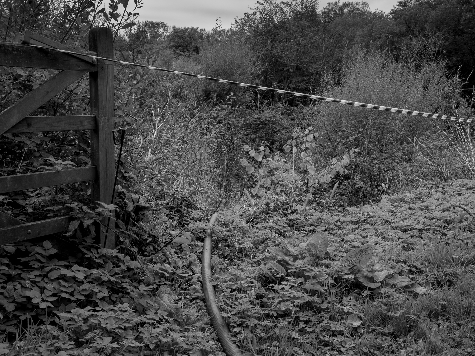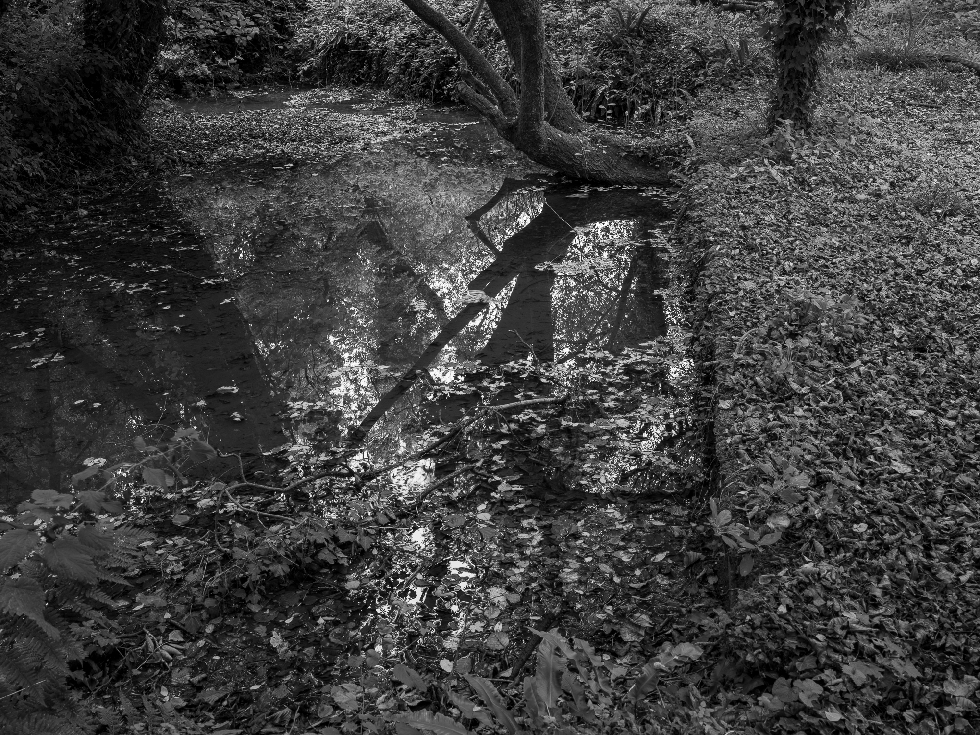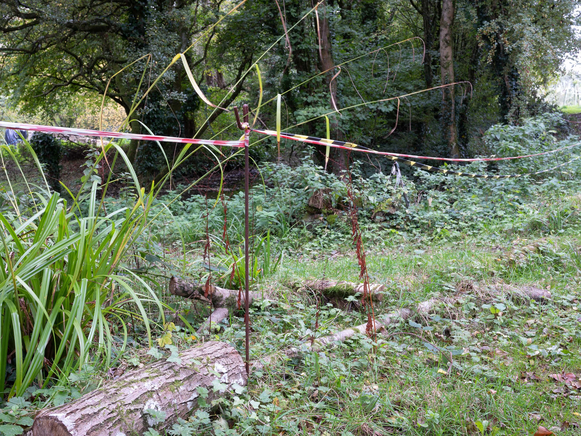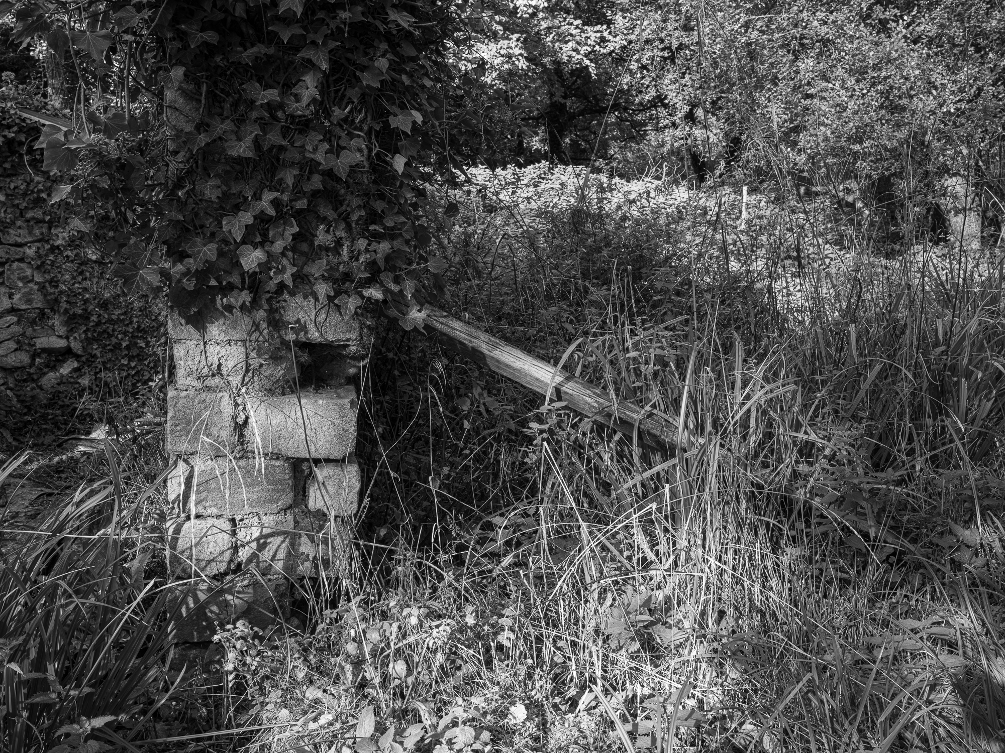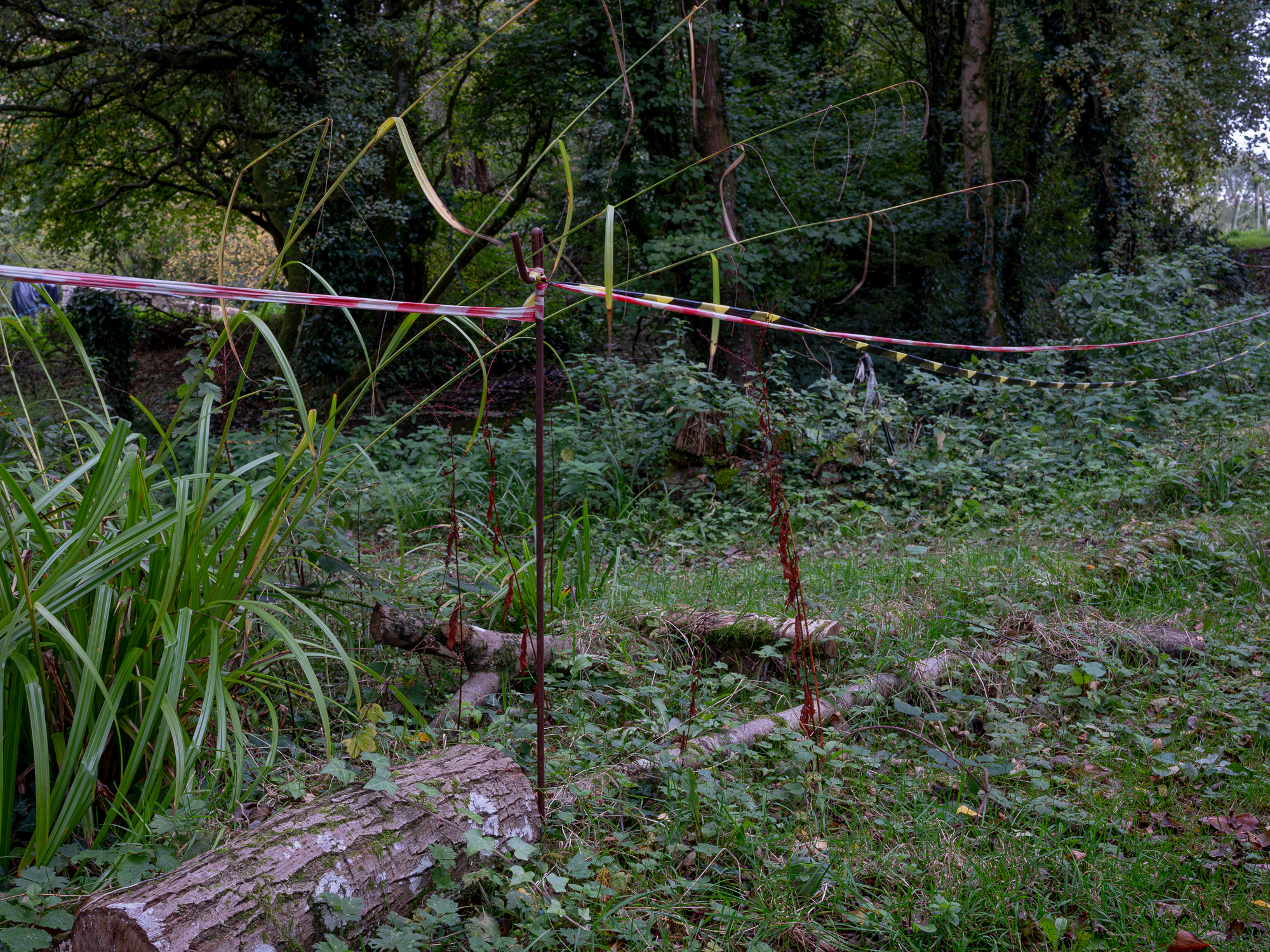 I have concentrated on how I see the landscape;  the trees,  the water,  the gates,  the tape which David uses to guide walkers through it,  the ruins of the forge,  the emergent river,  the weirs,  the foliage,  the syphon-pipes David uses,  the waterfall at the heart of the water system,  David’s incipient orchard…all of which are deconstructions which eventually I can re-construct to form a composite landscape which suits my vision.  I am increasingly of an opinion that those desconstructions vary from visit to visit;  although there is much visual overlap,  i see new things on every visit.  Whether it is me changing or the landscape changing with David’s efforts is an interesting discussion.  I am sure it is both.