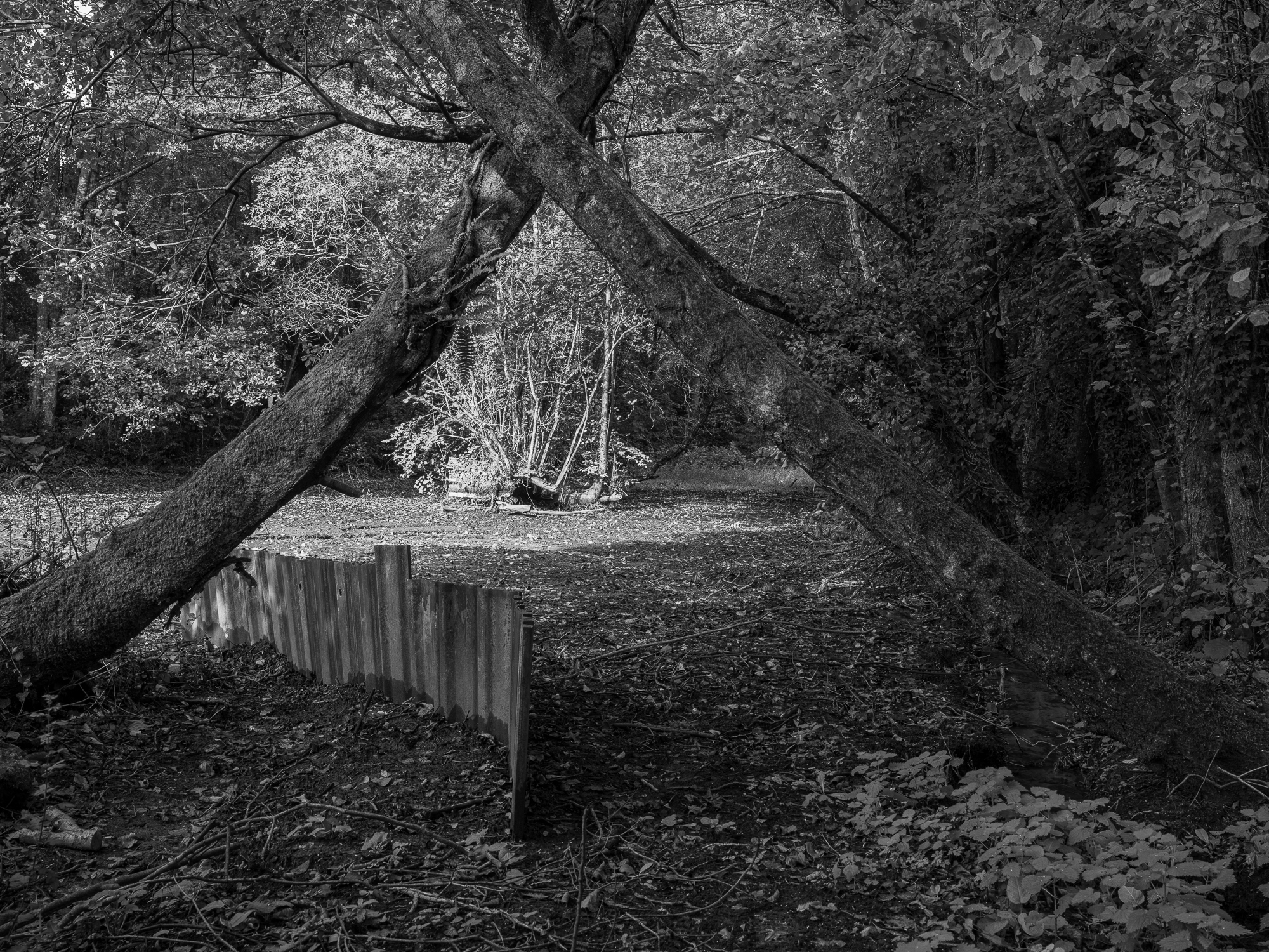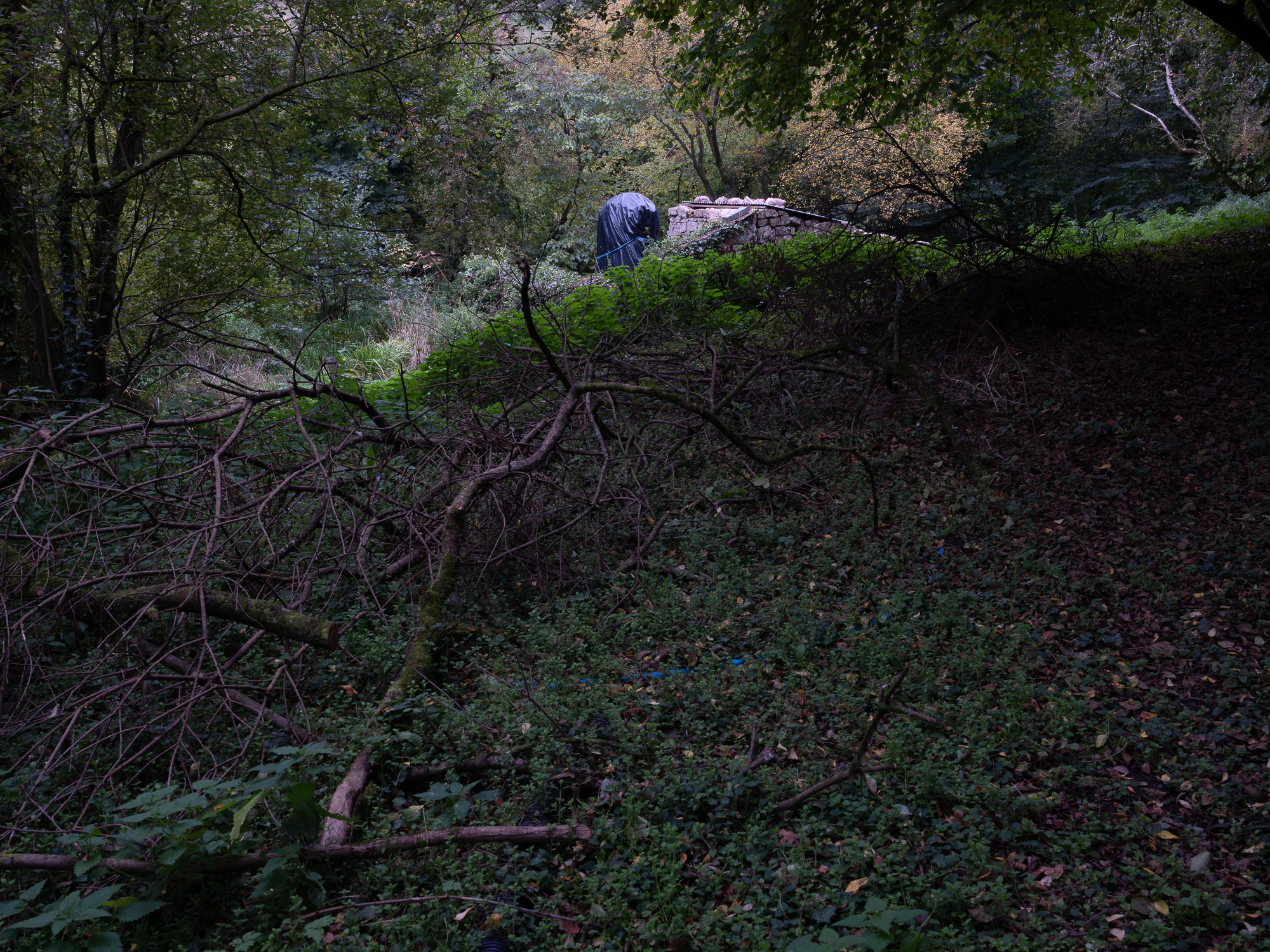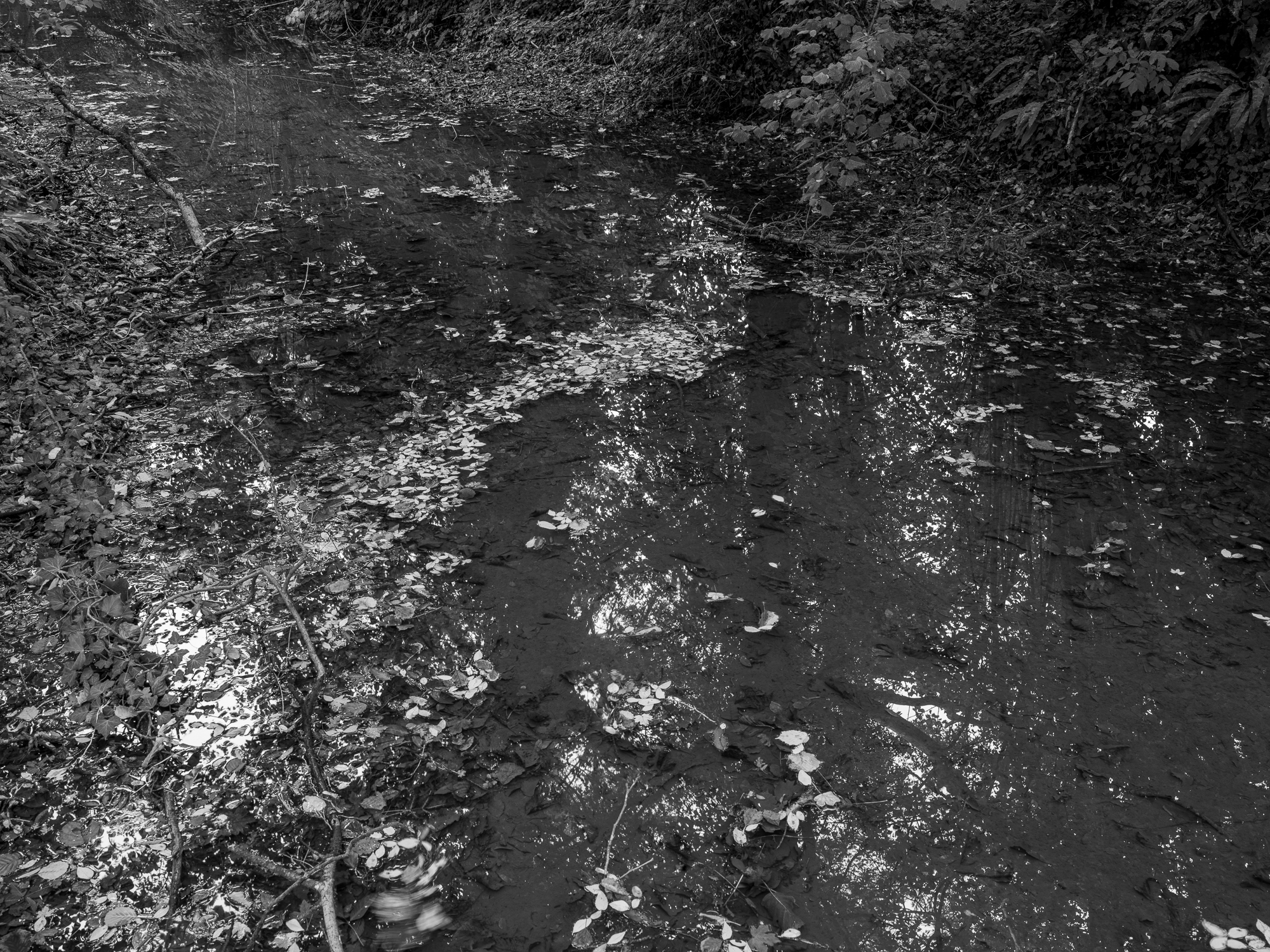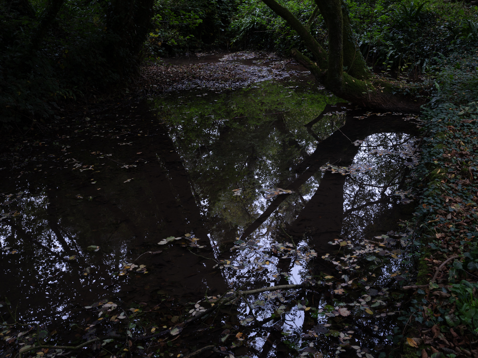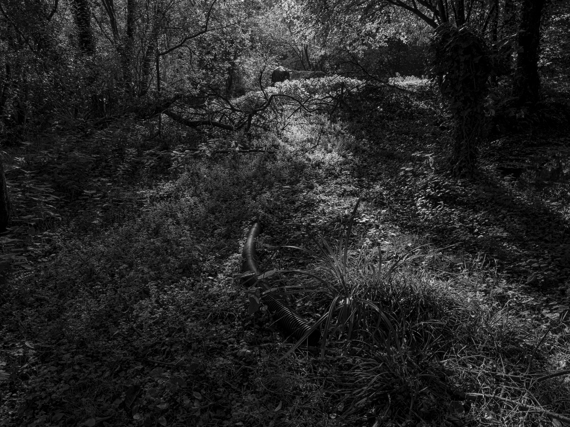 I have concentrated on how I see the landscape;  the trees,  the water,  the gates,  the tape which David uses to guide walkers through it,  the ruins of the forge,  the emergent river,  the weirs,  the foliage,  the syphon-pipes David uses,  the waterfall at the heart of the water system,  David’s incipient orchard…all of which are deconstructions which eventually I can re-construct to form a composite landscape which suits my vision.  I am increasingly of an opinion that those desconstructions vary from visit to visit;  although there is much visual overlap,  i see new things on every visit.  Whether it is me changing or the landscape changing with David’s efforts is an interesting discussion.  I am sure it is both.