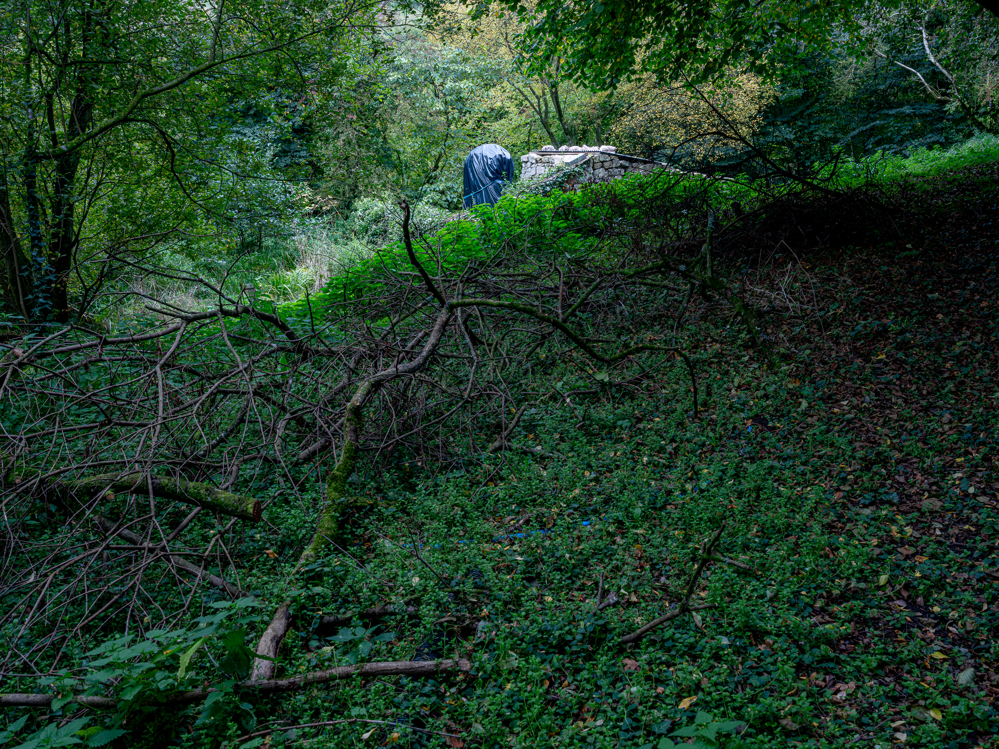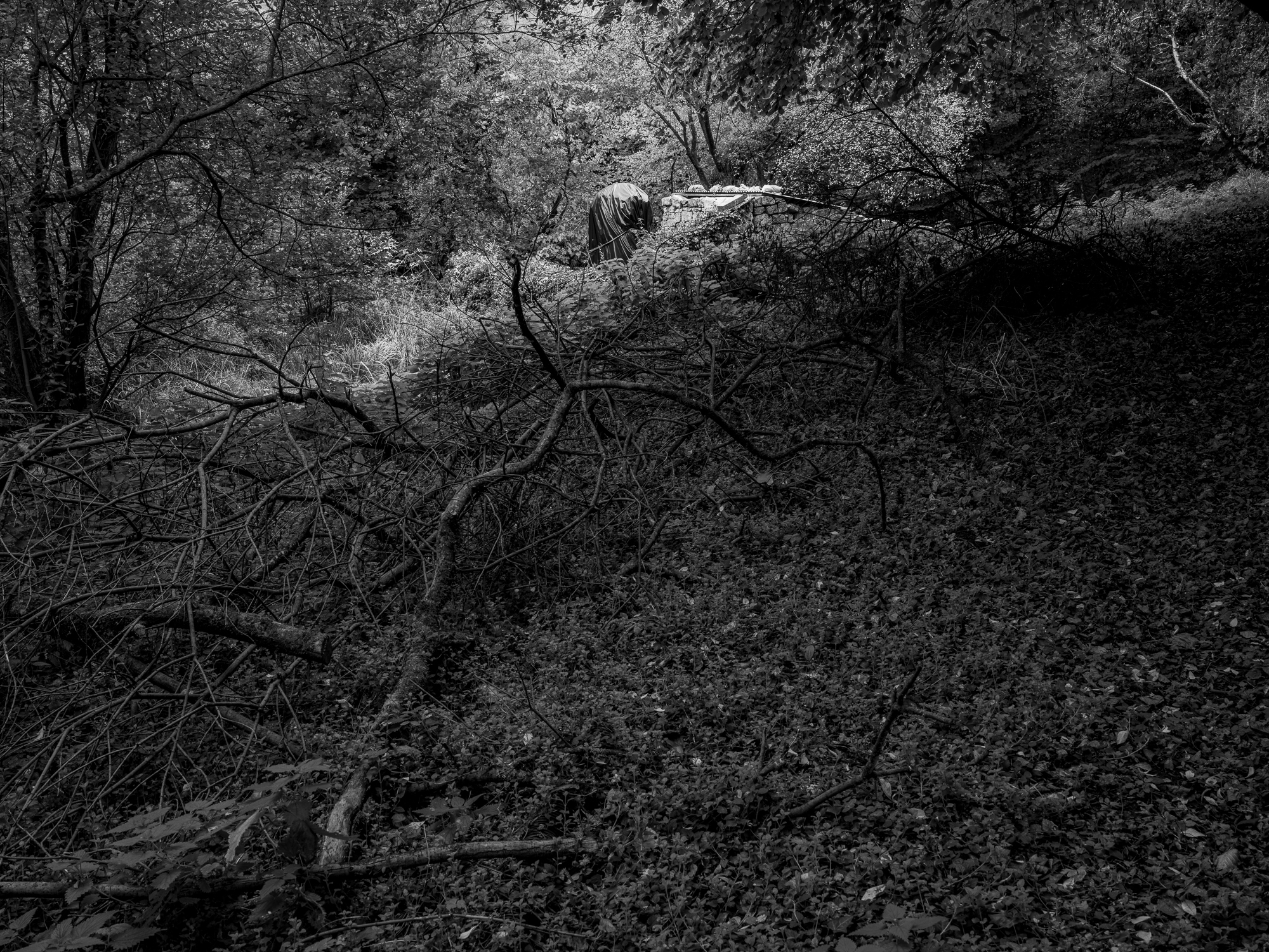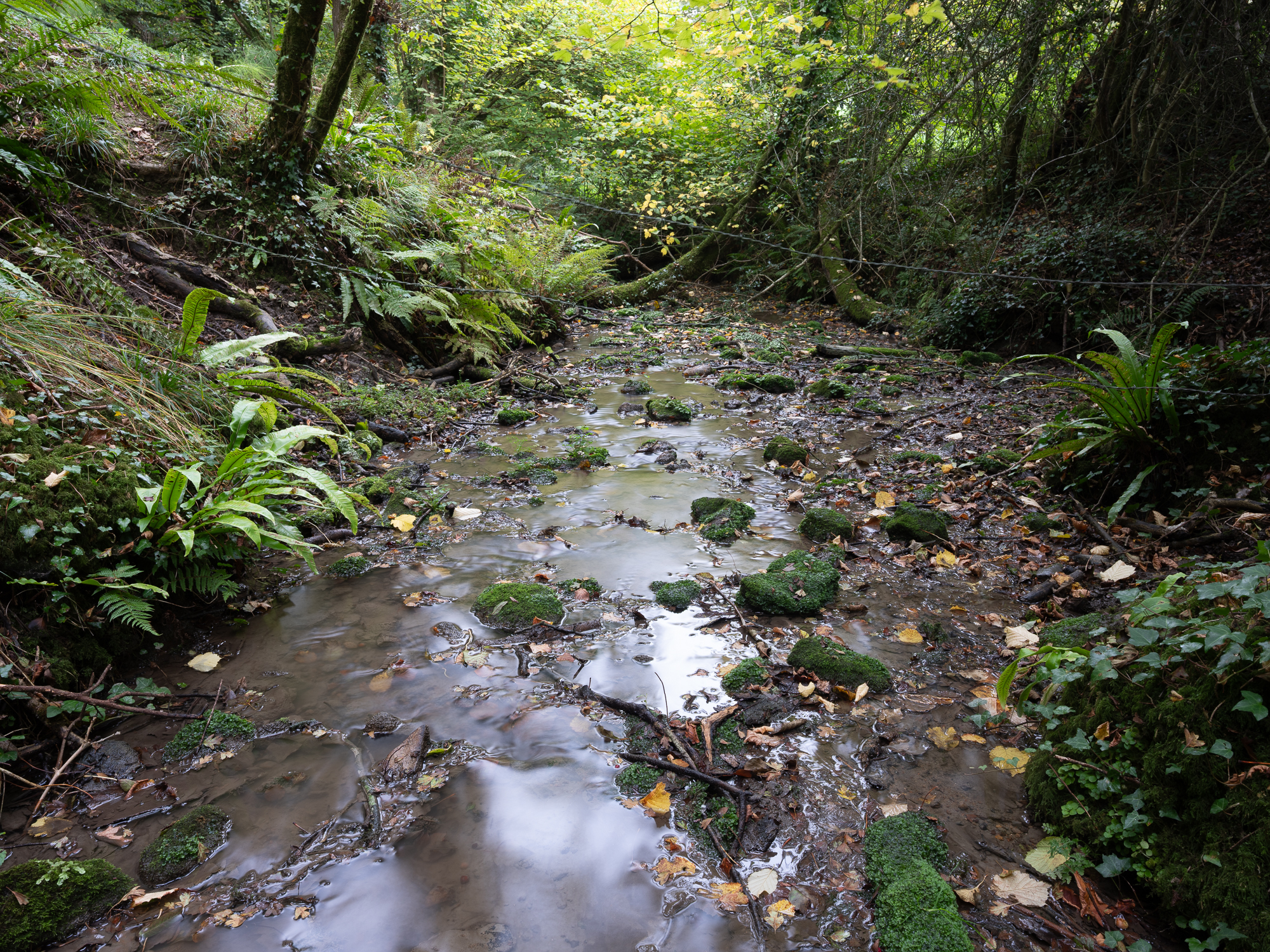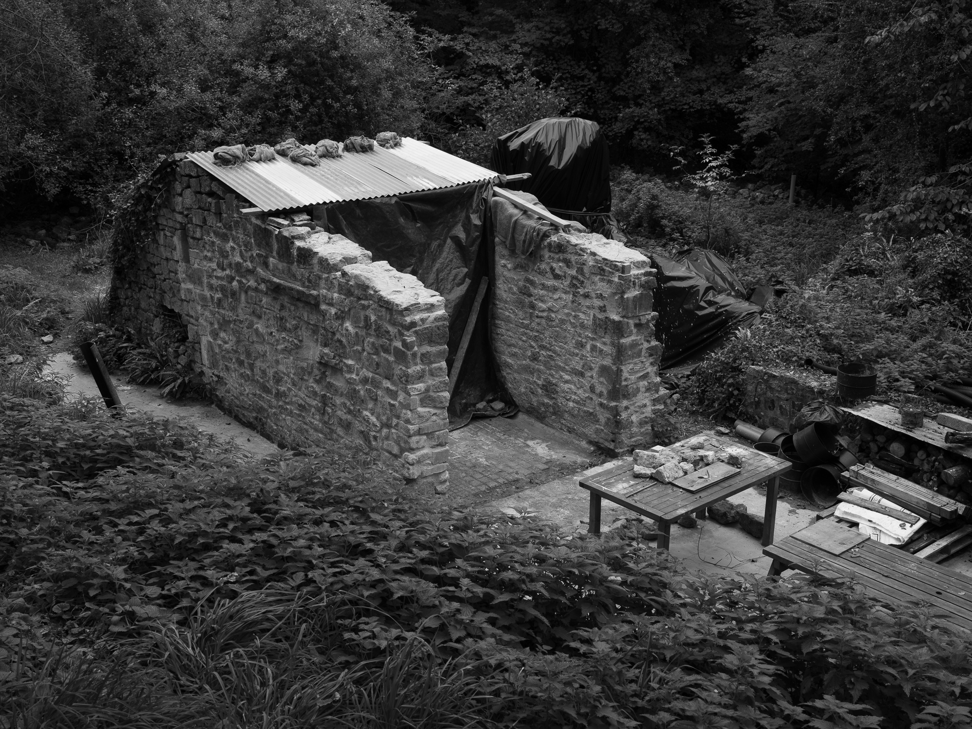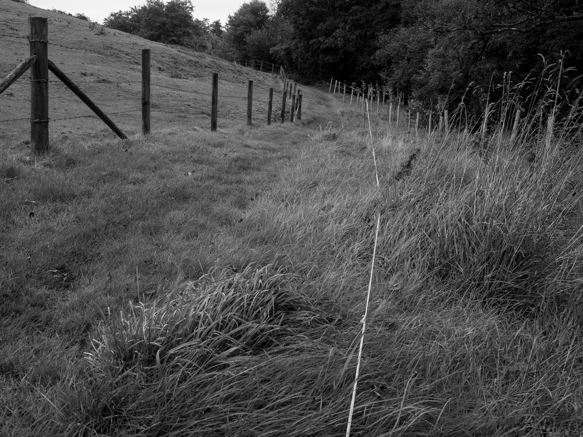 I have concentrated on how I see the landscape;  the trees,  the water,  the gates,  the tape which David uses to guide walkers through it,  the ruins of the forge,  the emergent river,  the weirs,  the foliage,  the syphon-pipes David uses,  the waterfall at the heart of the water system,  David’s incipient orchard…all of which are deconstructions which eventually I can re-construct to form a composite landscape which suits my vision.  I am increasingly of an opinion that those desconstructions vary from visit to visit;  although there is much visual overlap,  i see new things on every visit.  Whether it is me changing or the landscape changing with David’s efforts is an interesting discussion.  I am sure it is both.