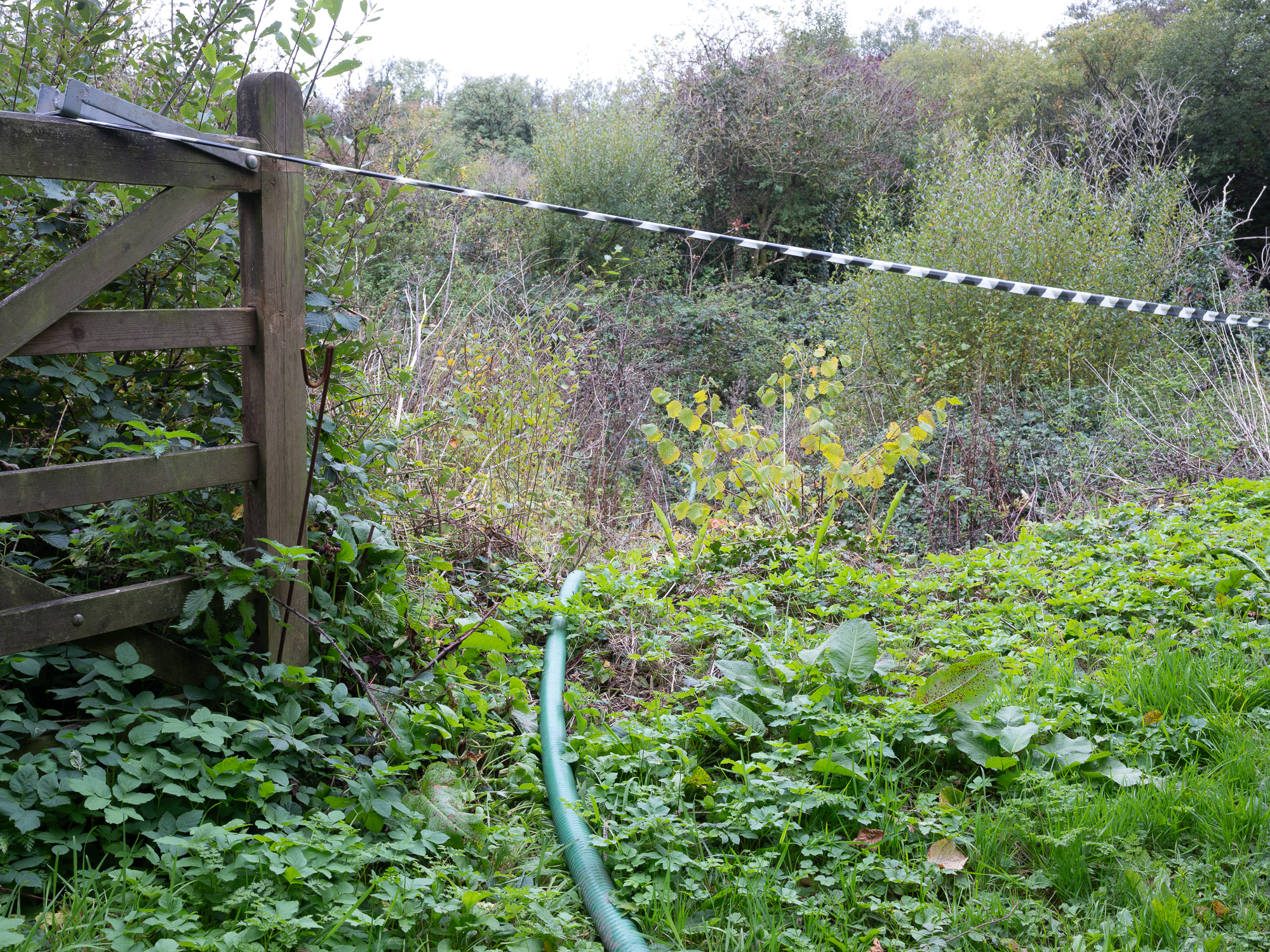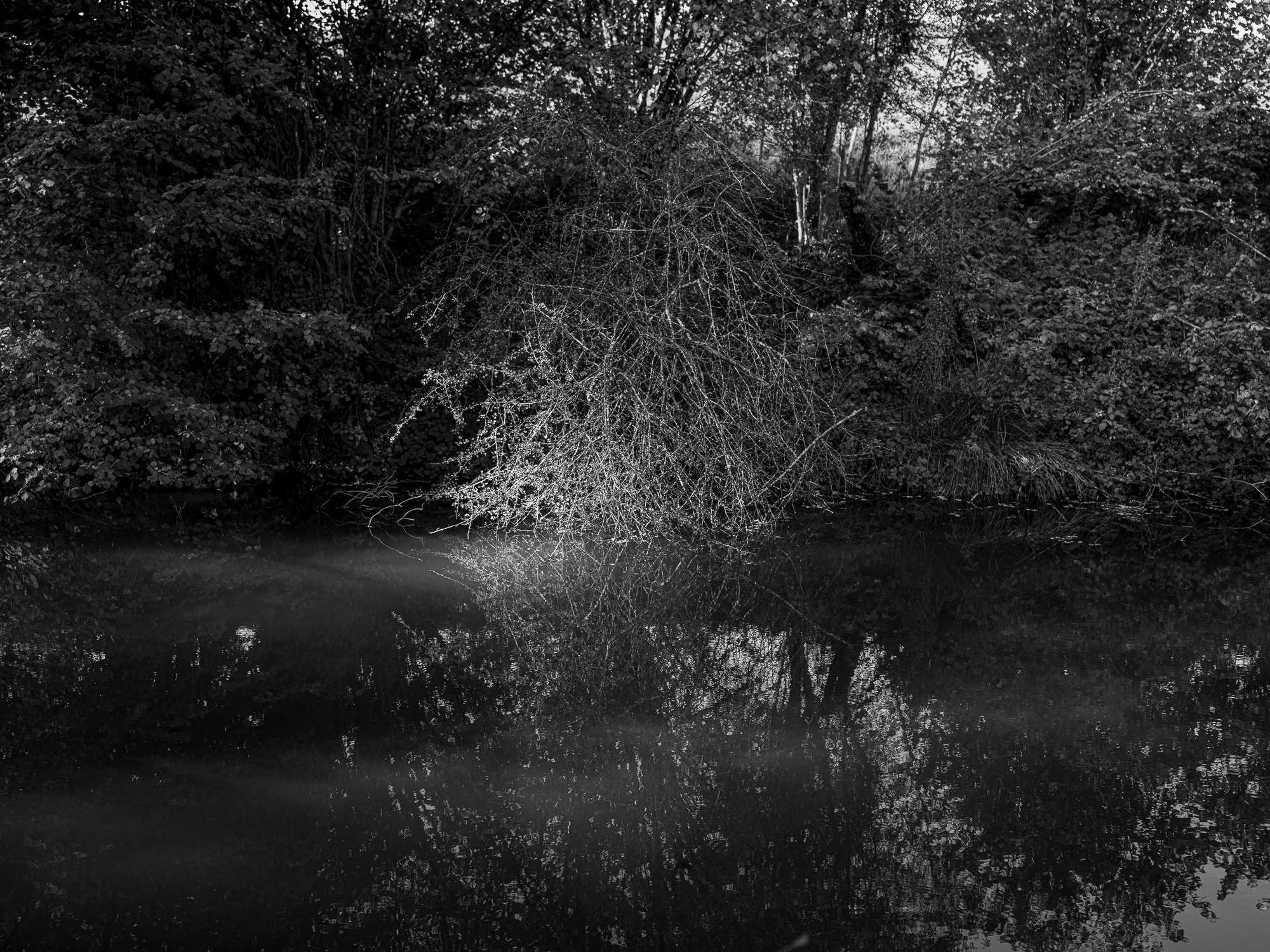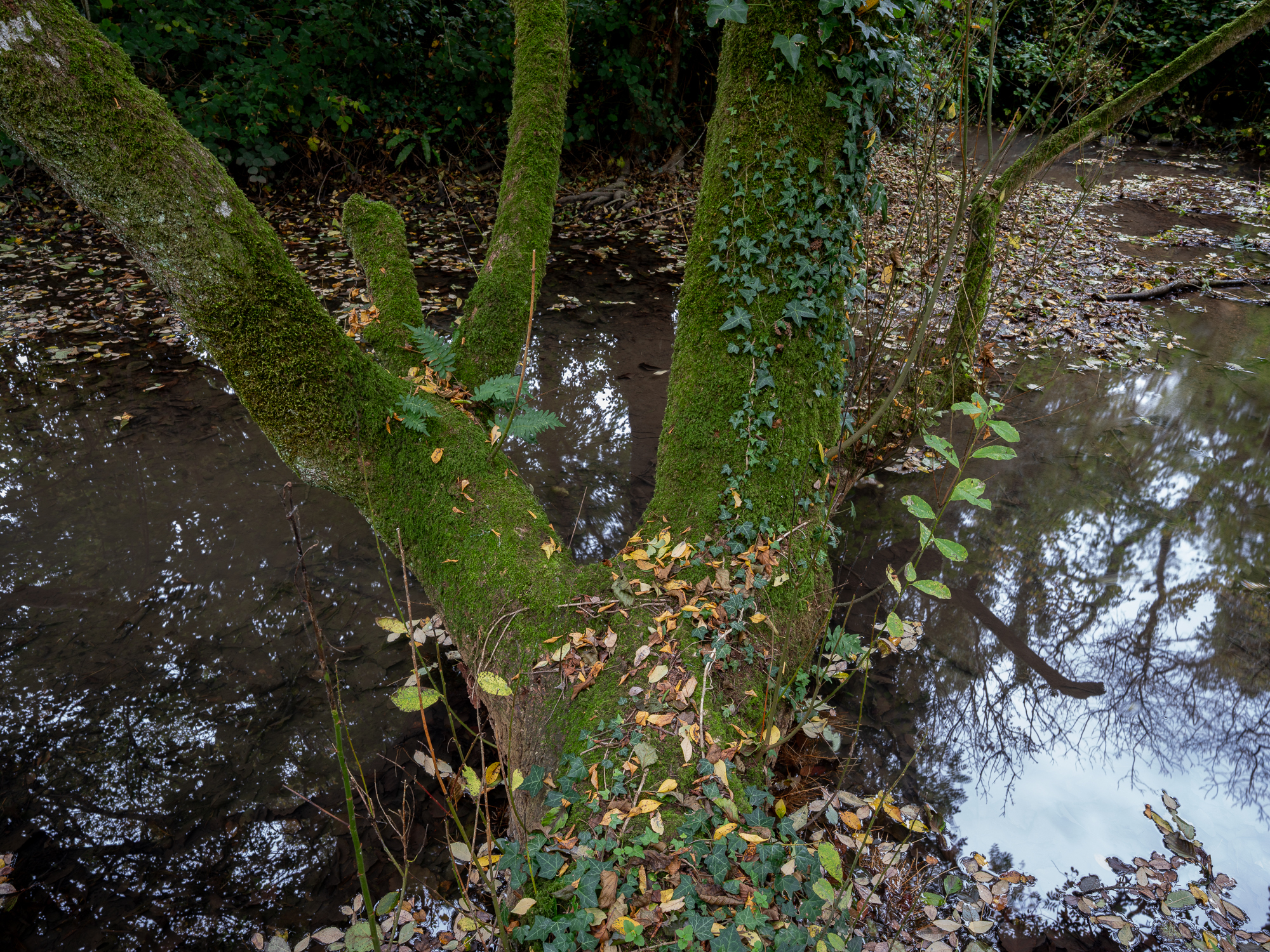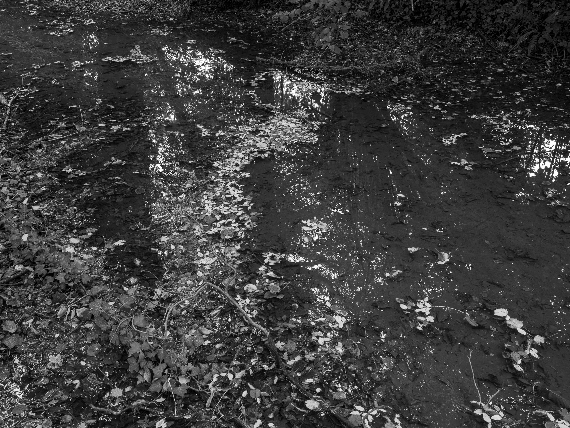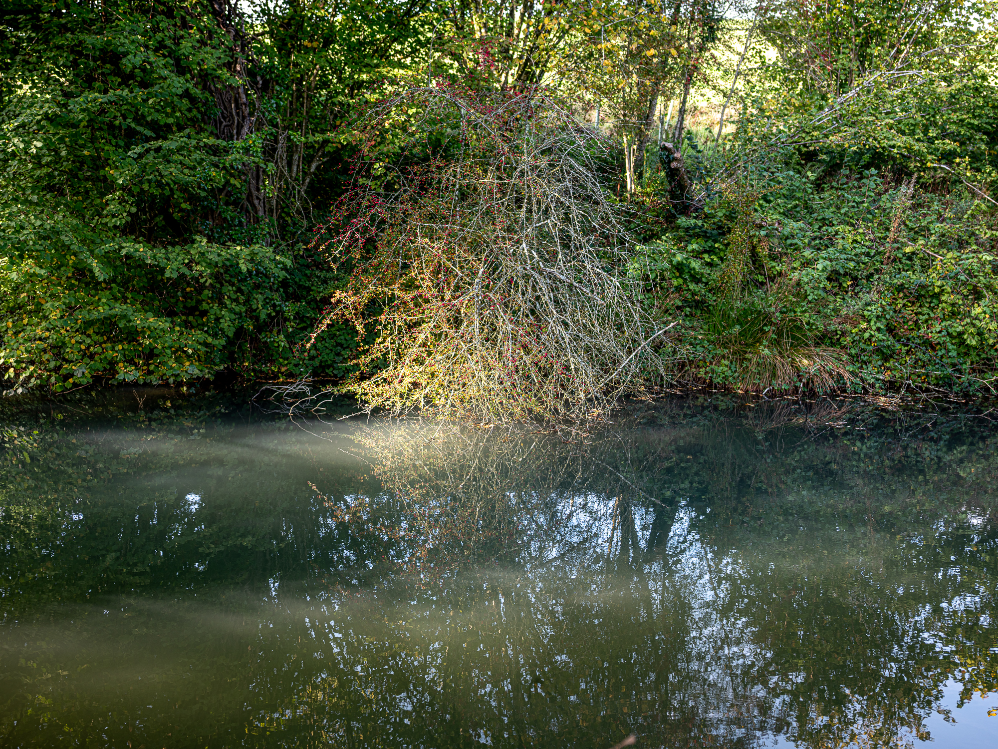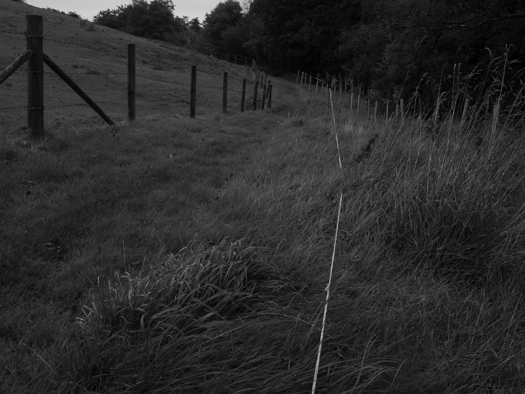 I have concentrated on how I see the landscape;  the trees,  the water,  the gates,  the tape which David uses to guide walkers through it,  the ruins of the forge,  the emergent river,  the weirs,  the foliage,  the syphon-pipes David uses,  the waterfall at the heart of the water system,  David’s incipient orchard…all of which are deconstructions which eventually I can re-construct to form a composite landscape which suits my vision.  I am increasingly of an opinion that those desconstructions vary from visit to visit;  although there is much visual overlap,  i see new things on every visit.  Whether it is me changing or the landscape changing with David’s efforts is an interesting discussion.  I am sure it is both.