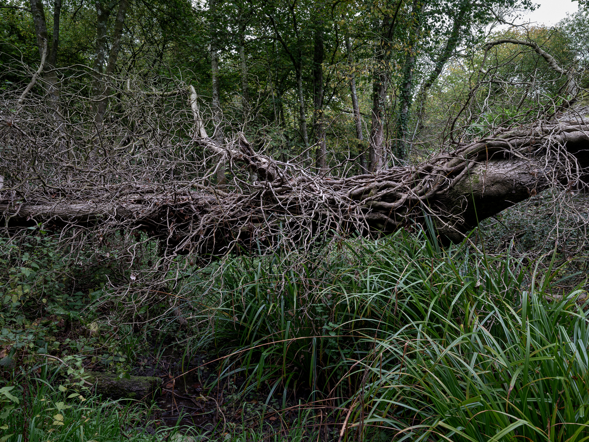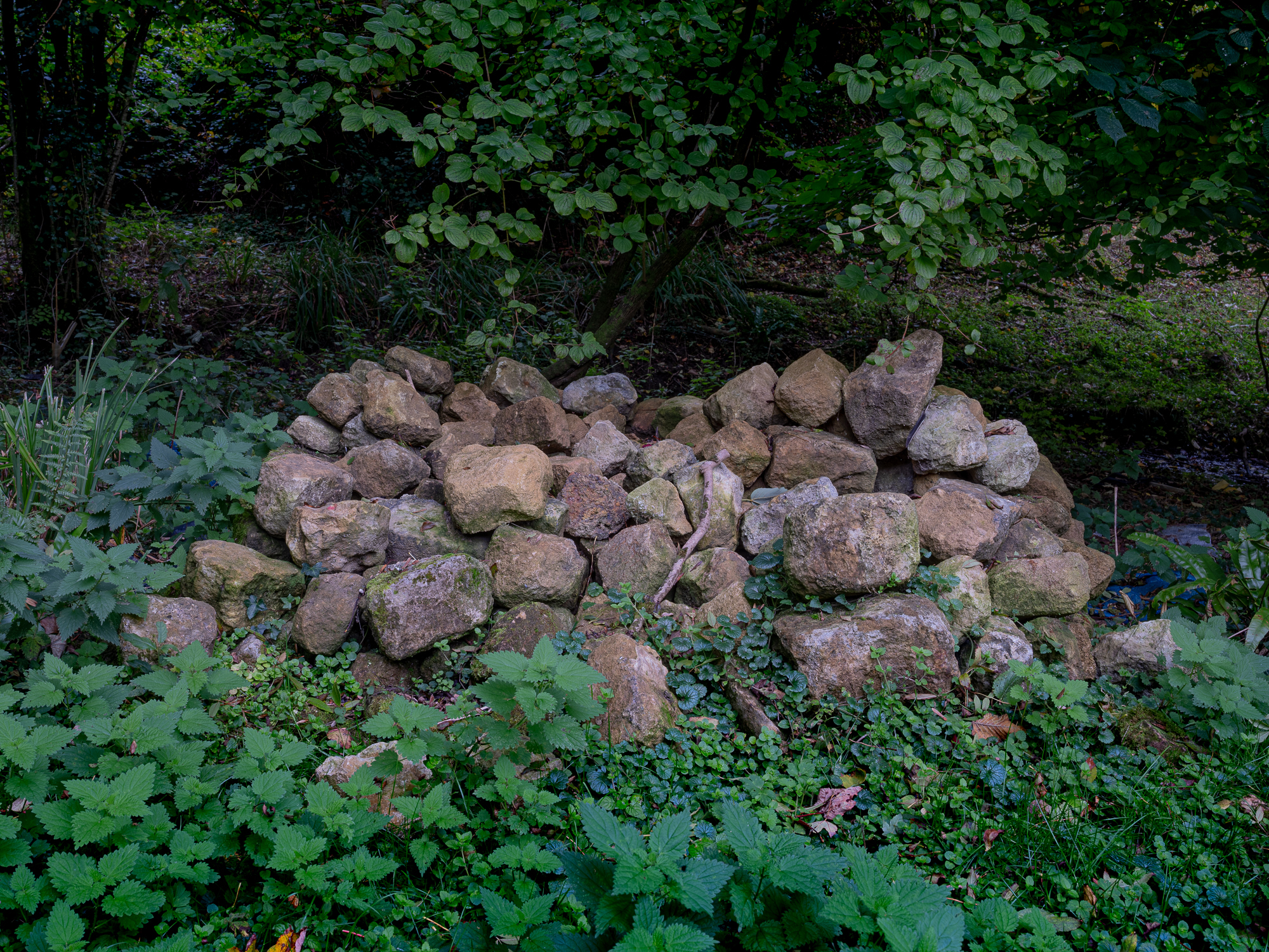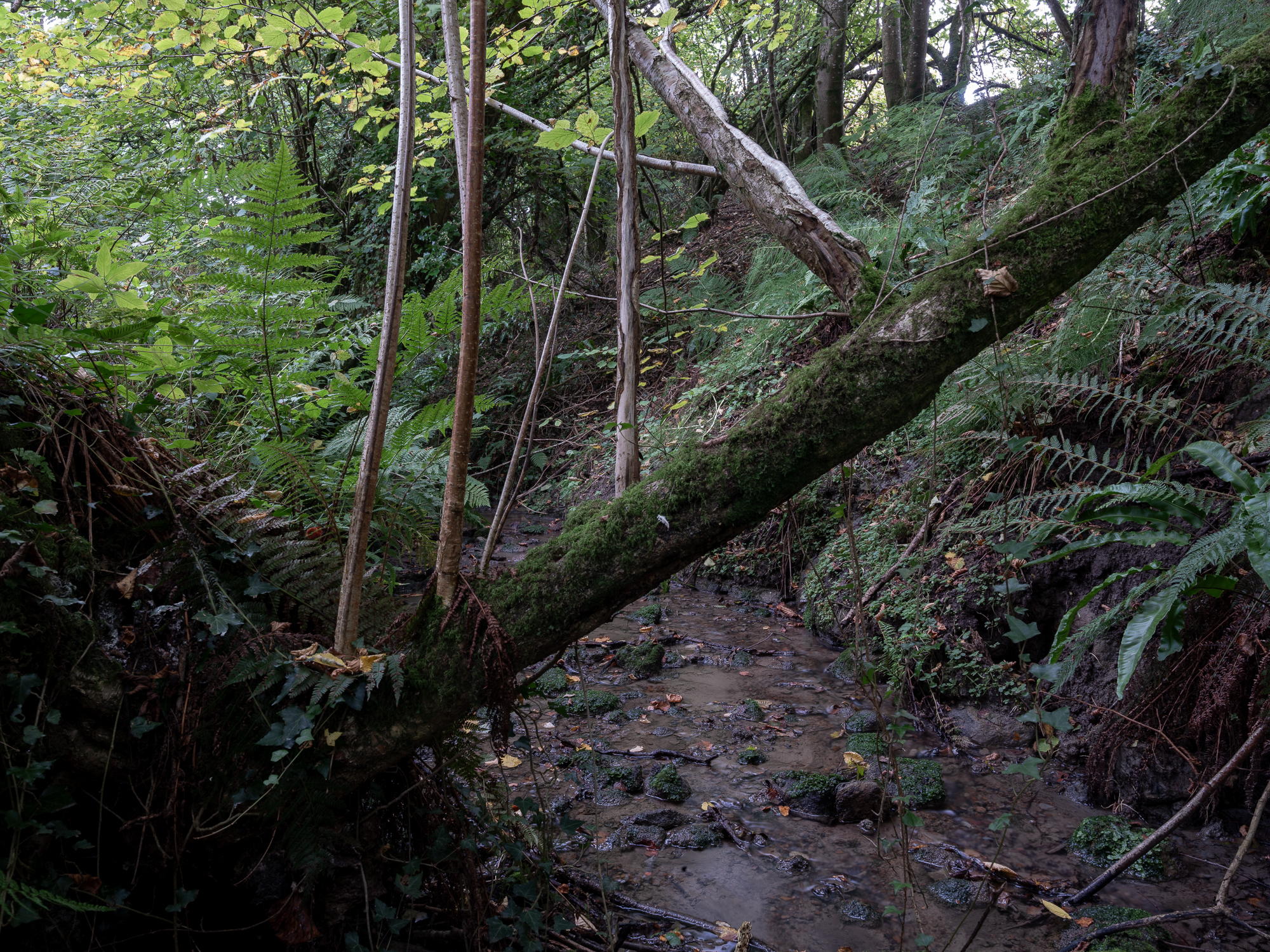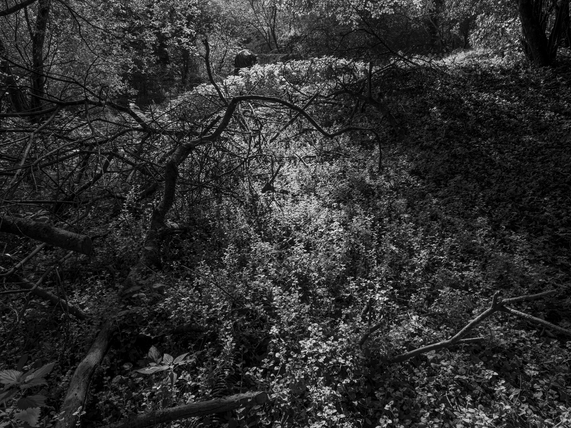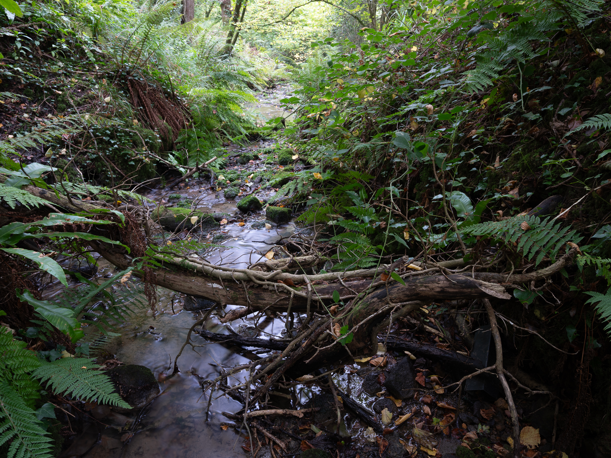I have concentrated on how I see the landscape;  the trees,  the water,  the gates,  the tape which David uses to guide walkers through it,  the ruins of the forge,  the emergent river,  the weirs,  the foliage,  the syphon-pipes David uses,  the waterfall at the heart of the water system,  David’s incipient orchard…all of which are deconstructions which eventually I can re-construct to form a composite landscape which suits my vision.  I am increasingly of an opinion that those desconstructions vary from visit to visit;  although there is much visual overlap,  i see new things on every visit.  Whether it is me changing or the landscape changing with David’s efforts is an interesting discussion.  I am sure it is both.