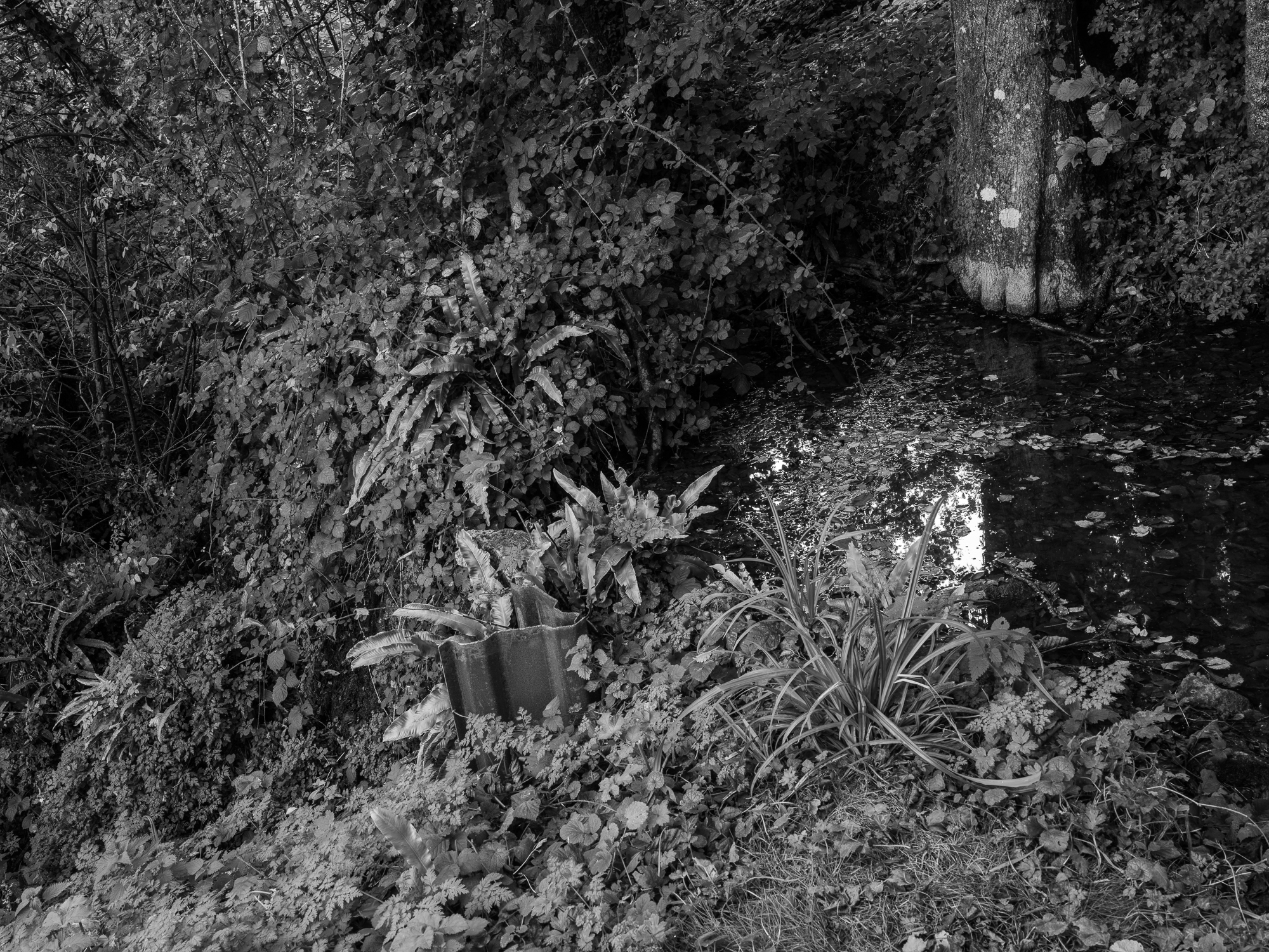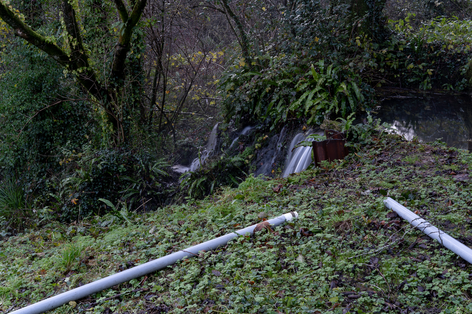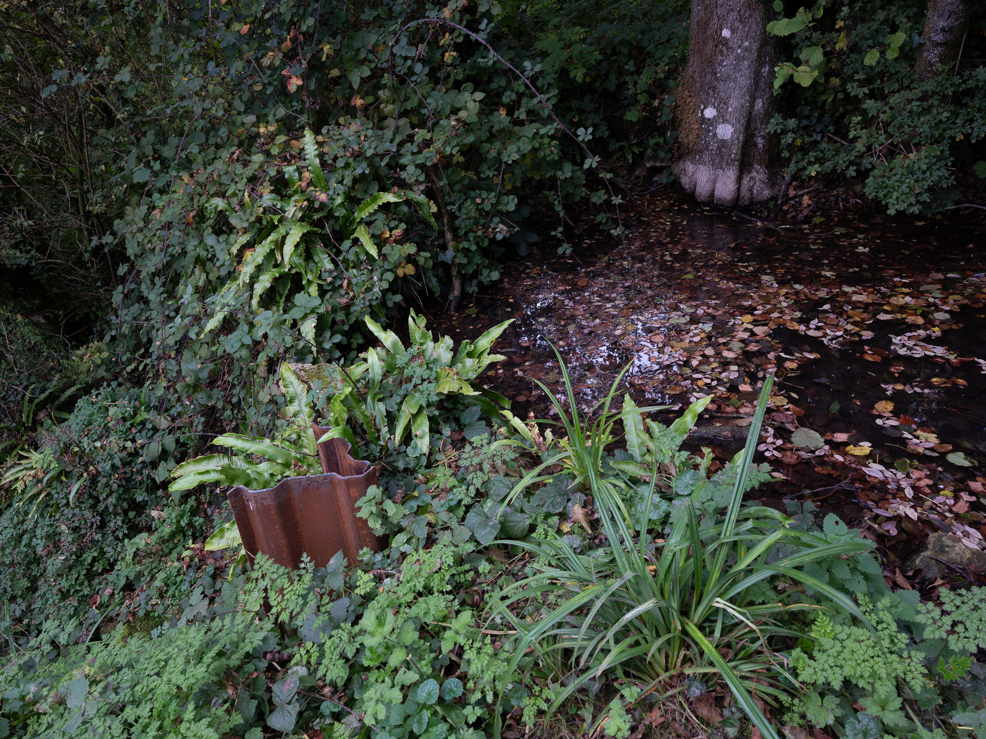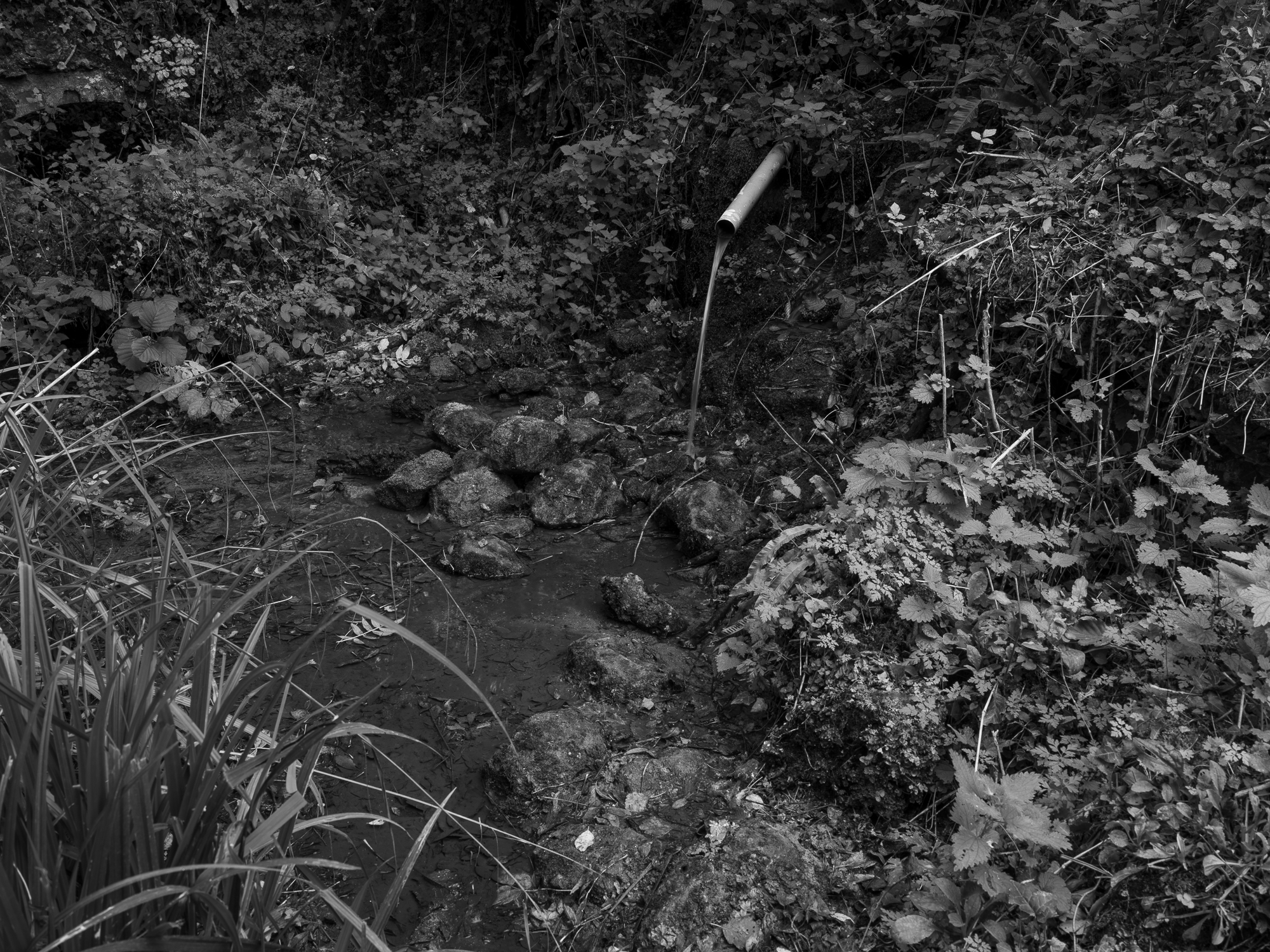 The first part of this submission features photographs of people collecting the spring water for their personal use. The  ‘water gatherers’,  as I have called them, are braving the cold weather of January and February, with their water collected in plastic and glass containers. These photographs were taken with a Nikon DSLR camera and a medium format digital camera.  The second series of images follows the water course from the spring through man-made culverts, streams, waterfalls and ponds until it leaves the owners land beneath the double strands of barbed wire which delineate the boundary. The series concludes with the spring again, and a photograph of orchids which have been left as an offering.
