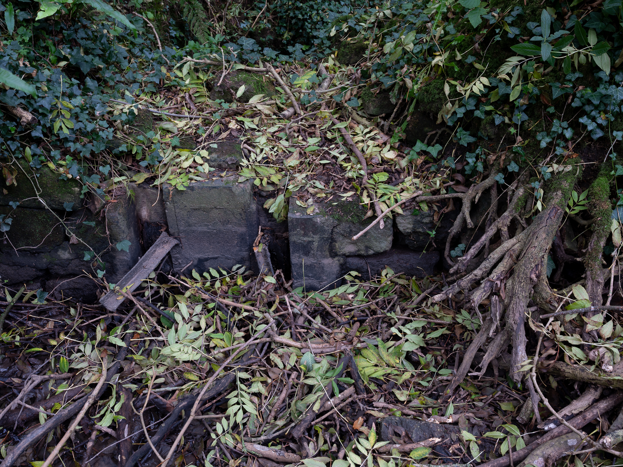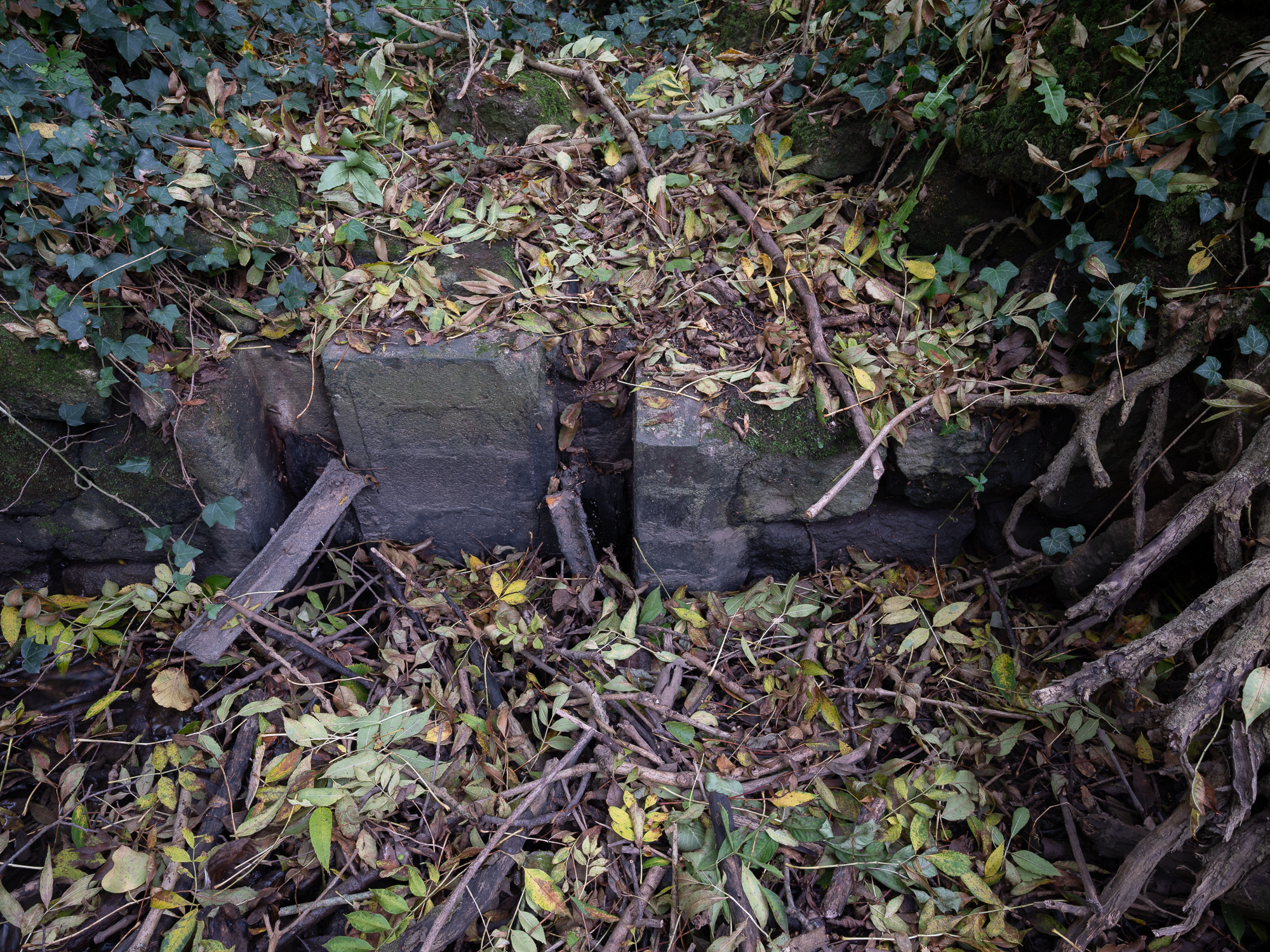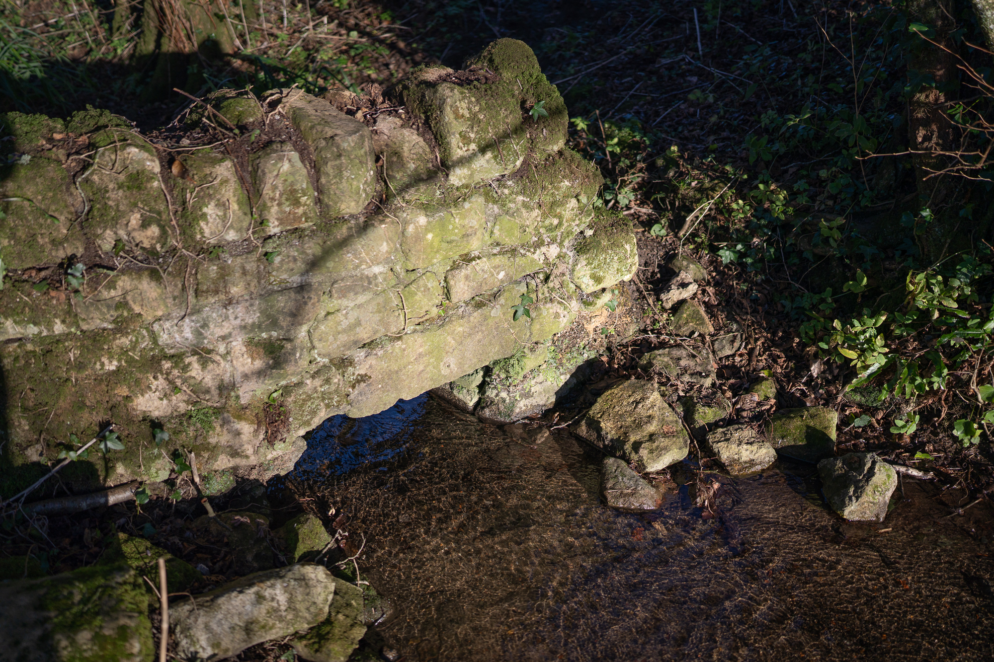 The remains of the feed to a water wheel on the site of the edge tool works at Doulting. Note the brick ‘voussoir’ arch in the centre of the picture.