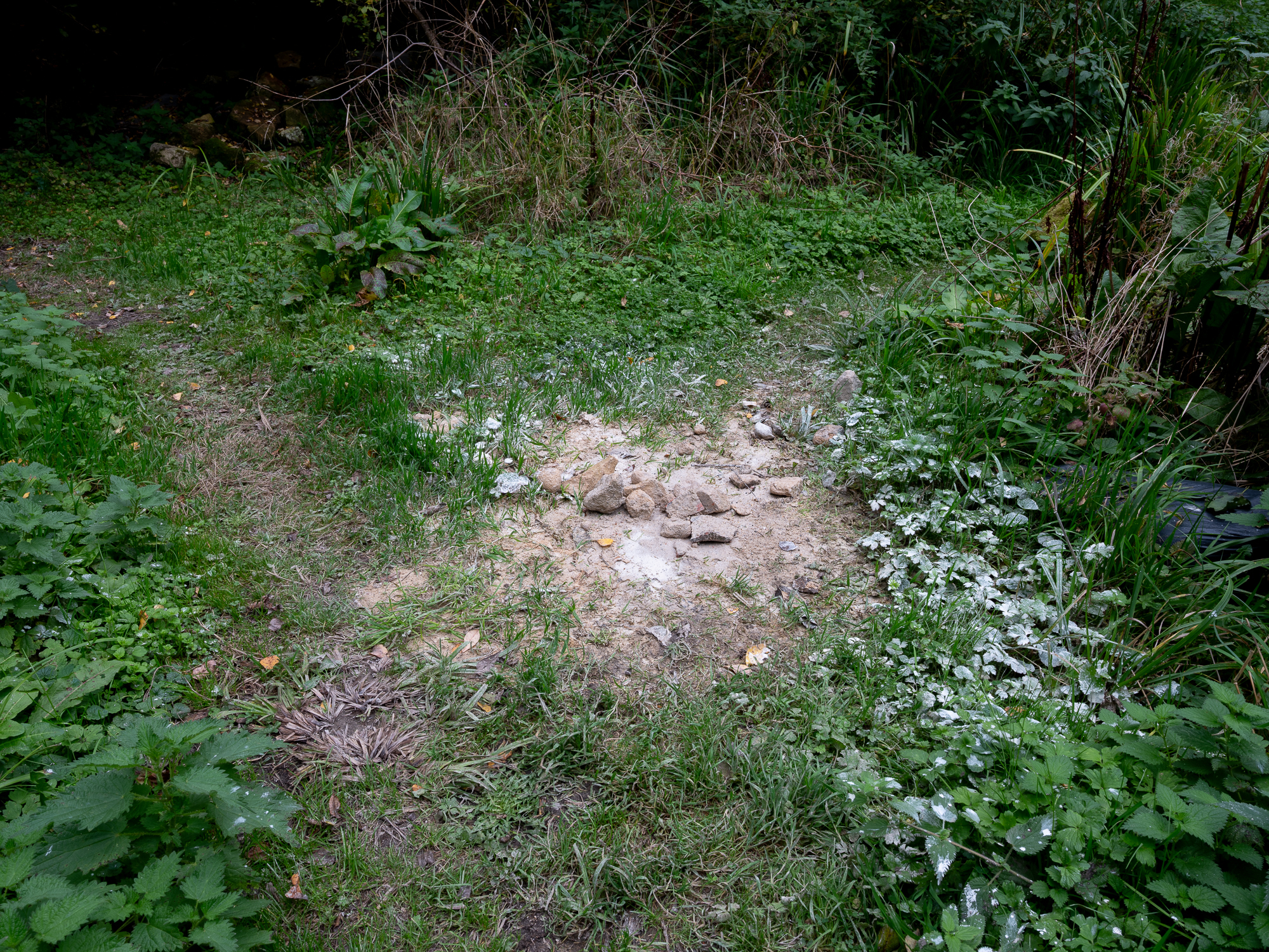 He next pointed out the secondary spring ( below ),  currently dried up,  which again produced a greater flow in the autumn and winter months.  It is interesting to contrast these 2 springs with the spring which feeds St Aldhelm’s well,  which has never been known to lose its flow.