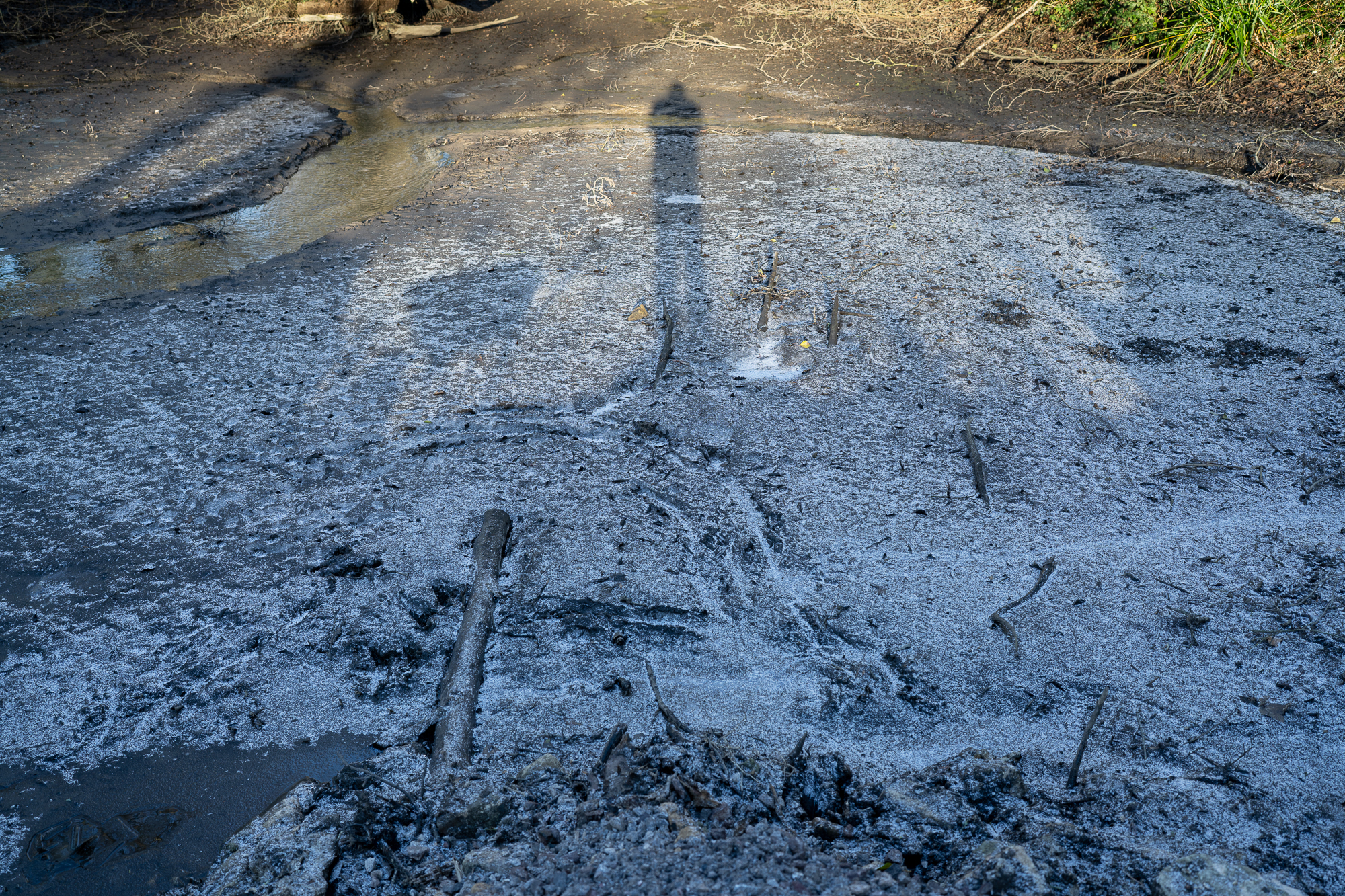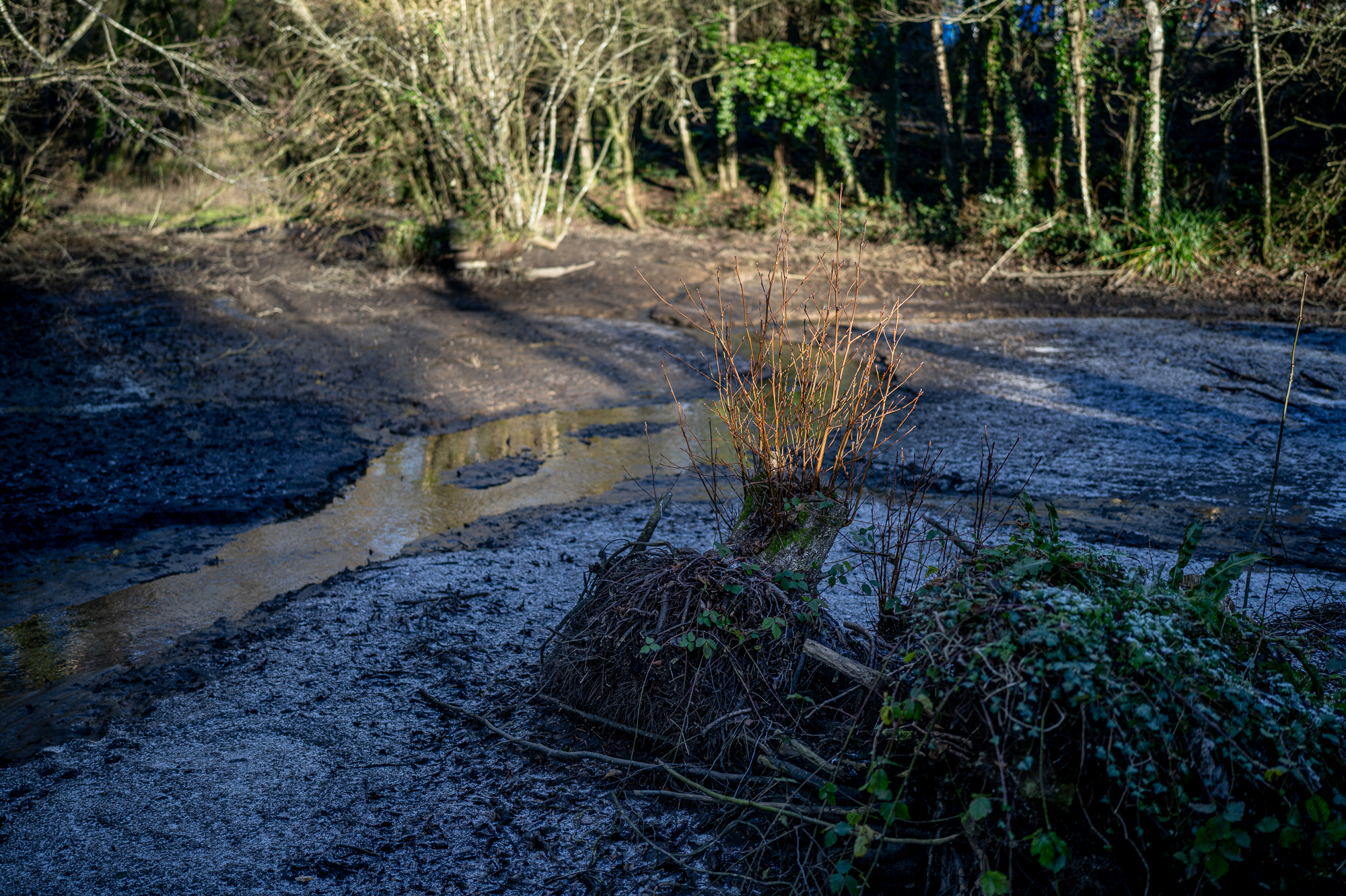 I have been returning to St Aldhelm’s Well and the ponds beyond intermittently since the summer.  I include those images below in a series of galleries.  The weather has been varied,  including very dull days.  Today there has been frost and bright sunshine,  and it was a pleasure making more photographs.  The owner of the ponds,  David Entwisle,   has been busy restoring them,  and i met him today dredging the first pond by hand.  Here is a portrait.
