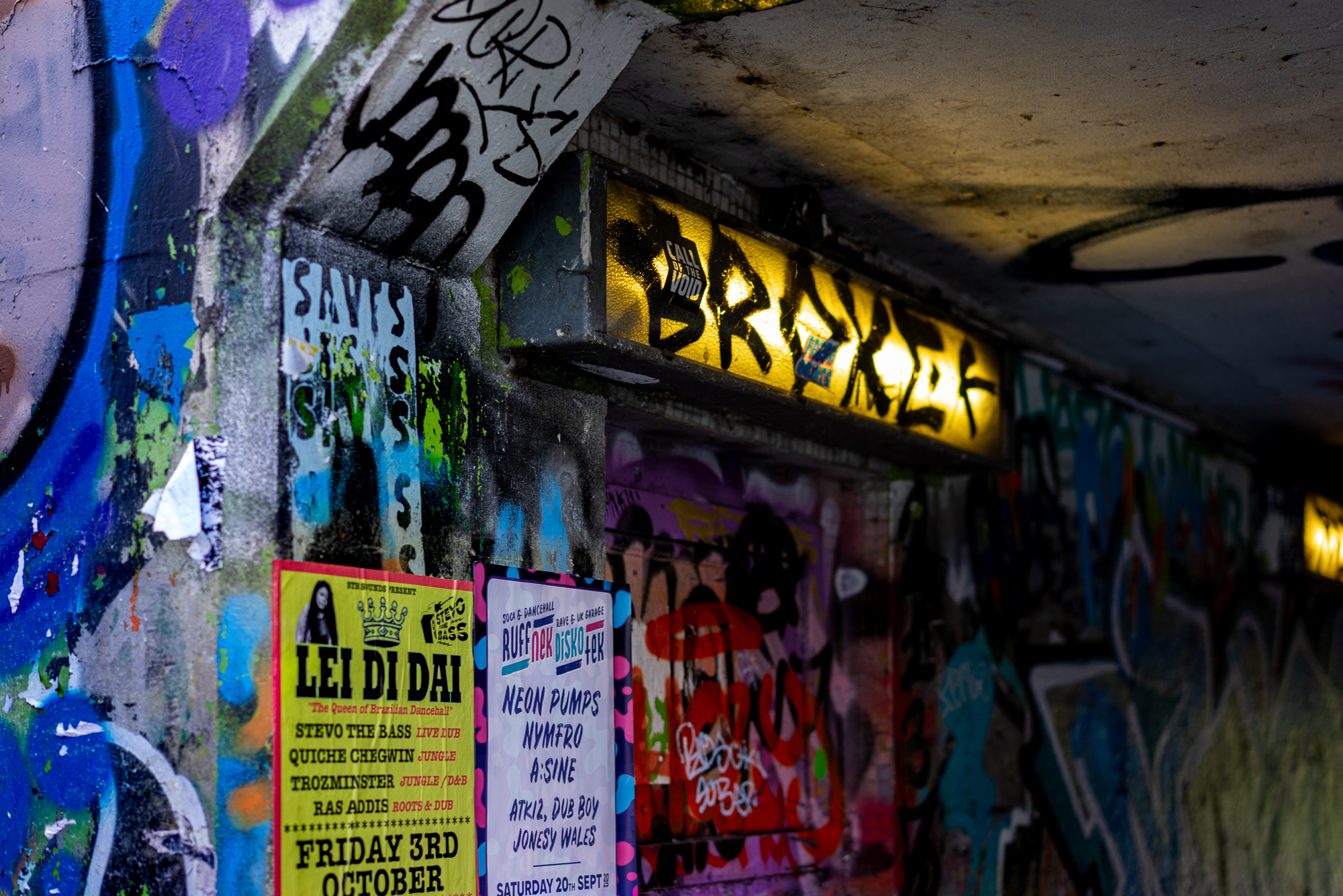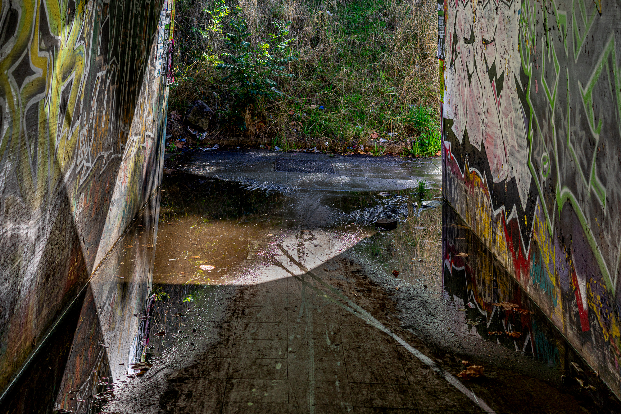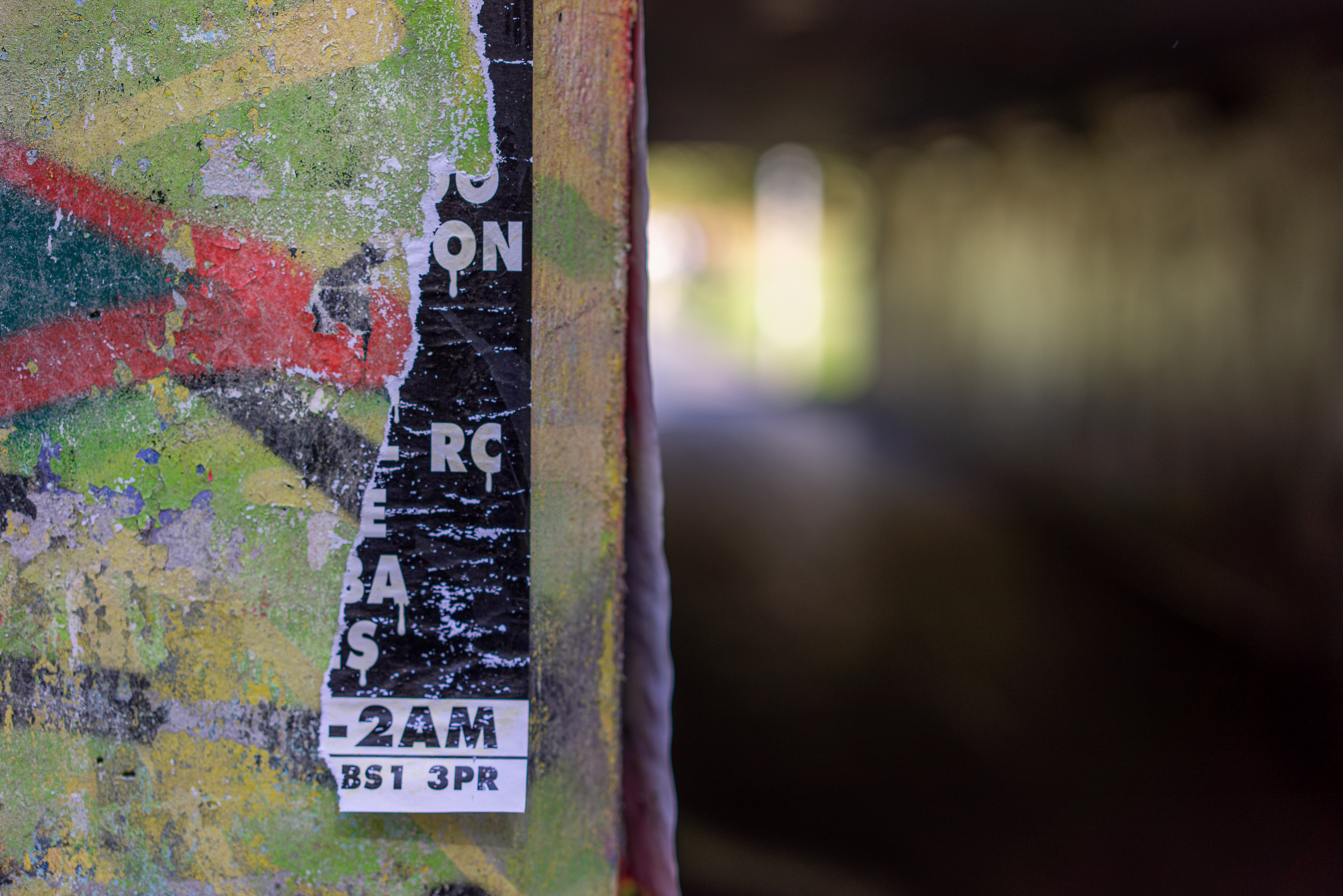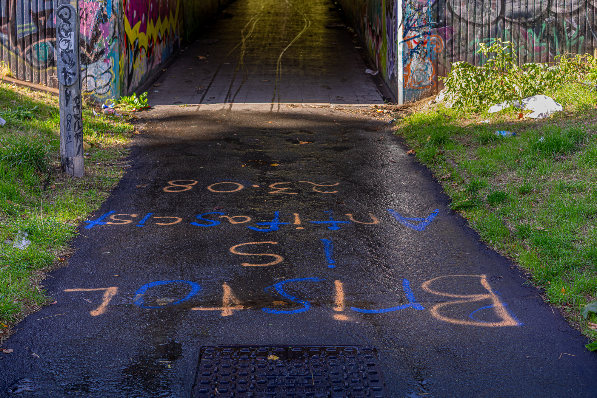 The underpass under Lawrence Hill roundabout is one of the largest in Bristol. Much graffiti has been painted on its walkways and tunnels, and posters stuck to its walls. Also it is possible to find items deposited, things like cups, cans and bottles but also sometimes more personal and substantial items such as handbags and articles of clothing. These items can be found on the ground beside the graffited walls but also sometimes wedged in between the handrails which trail around the underpass. The handrails are multi-coloured and often reflect the spray paint of the walls behind.