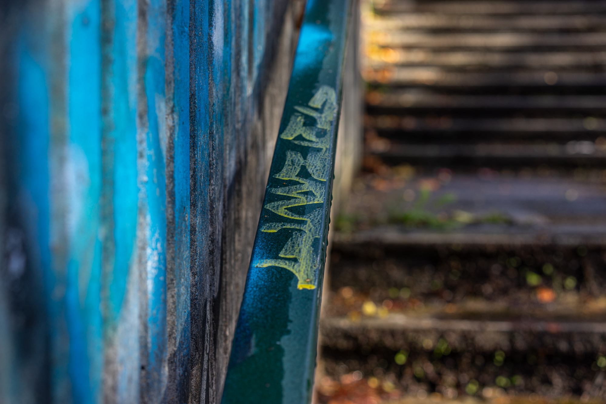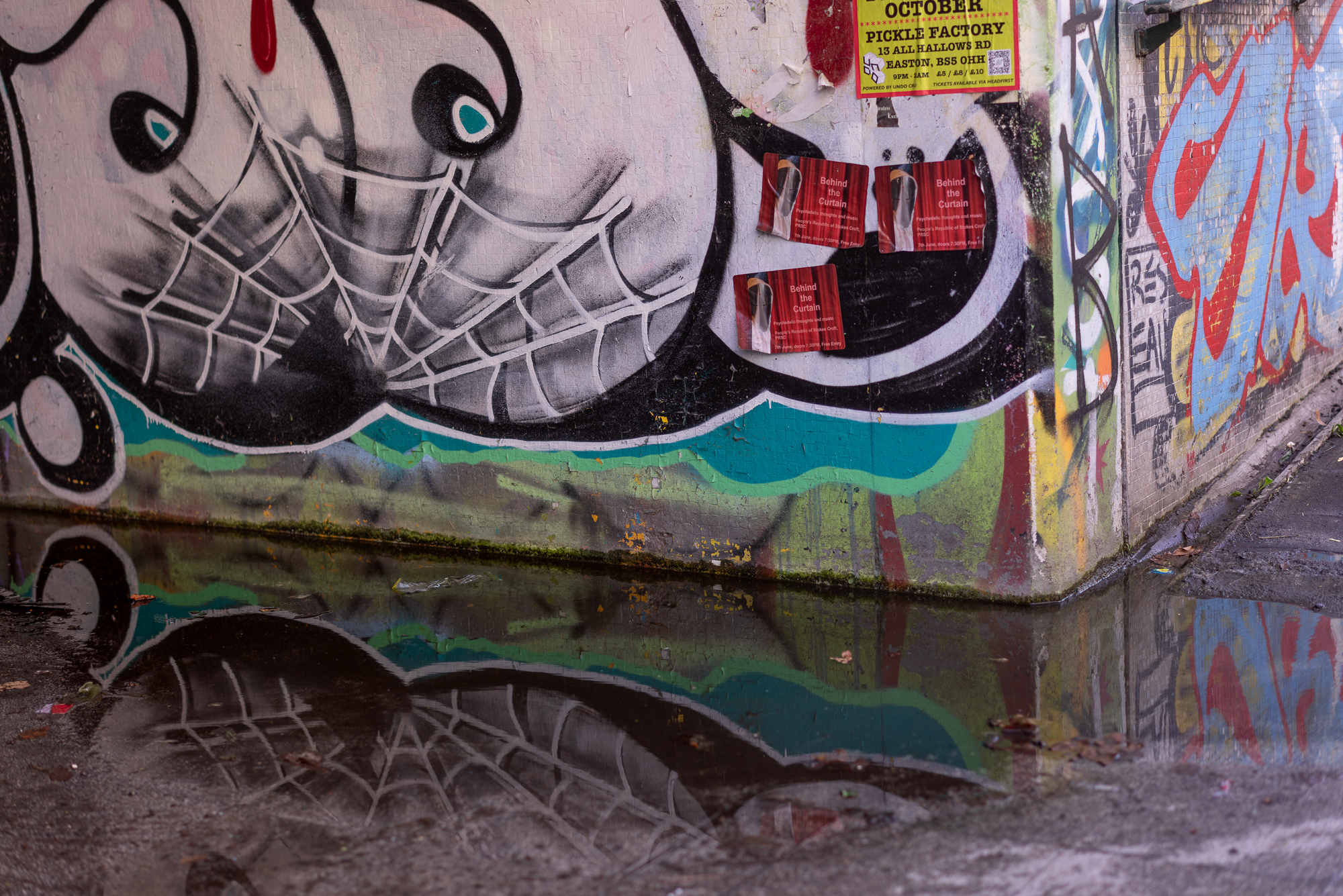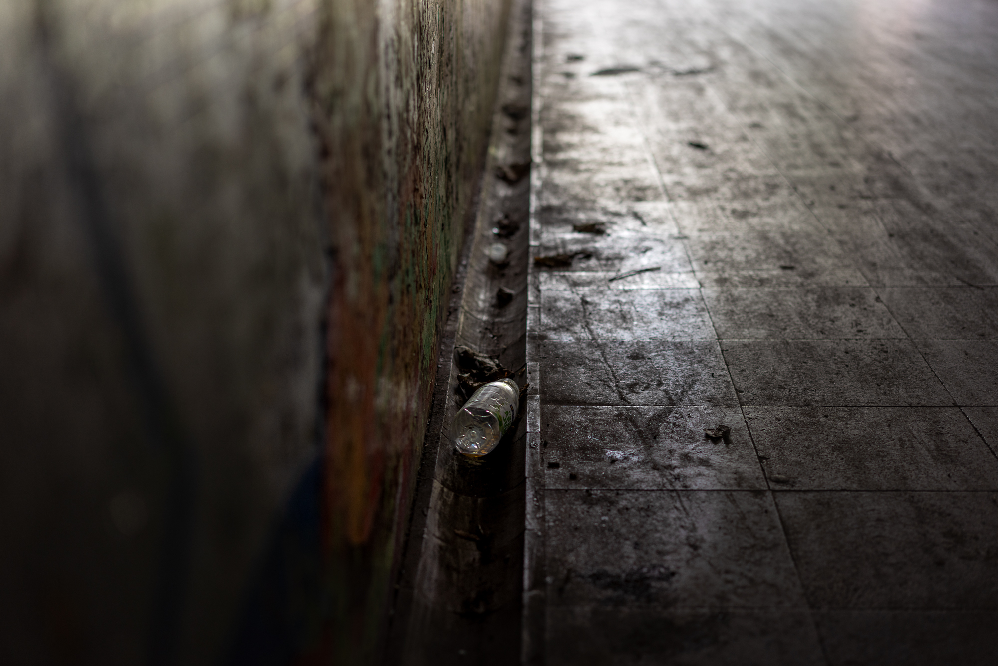 The underpass under Lawrence Hill roundabout is one of the largest in Bristol. Much graffiti has been painted on its walkways and tunnels, and posters stuck to its walls. Also it is possible to find items deposited, things like cups, cans and bottles but also sometimes more personal and substantial items such as handbags and articles of clothing. These items can be found on the ground beside the graffited walls but also sometimes wedged in between the handrails which trail around the underpass. The handrails are multi-coloured and often reflect the spray paint of the walls behind.