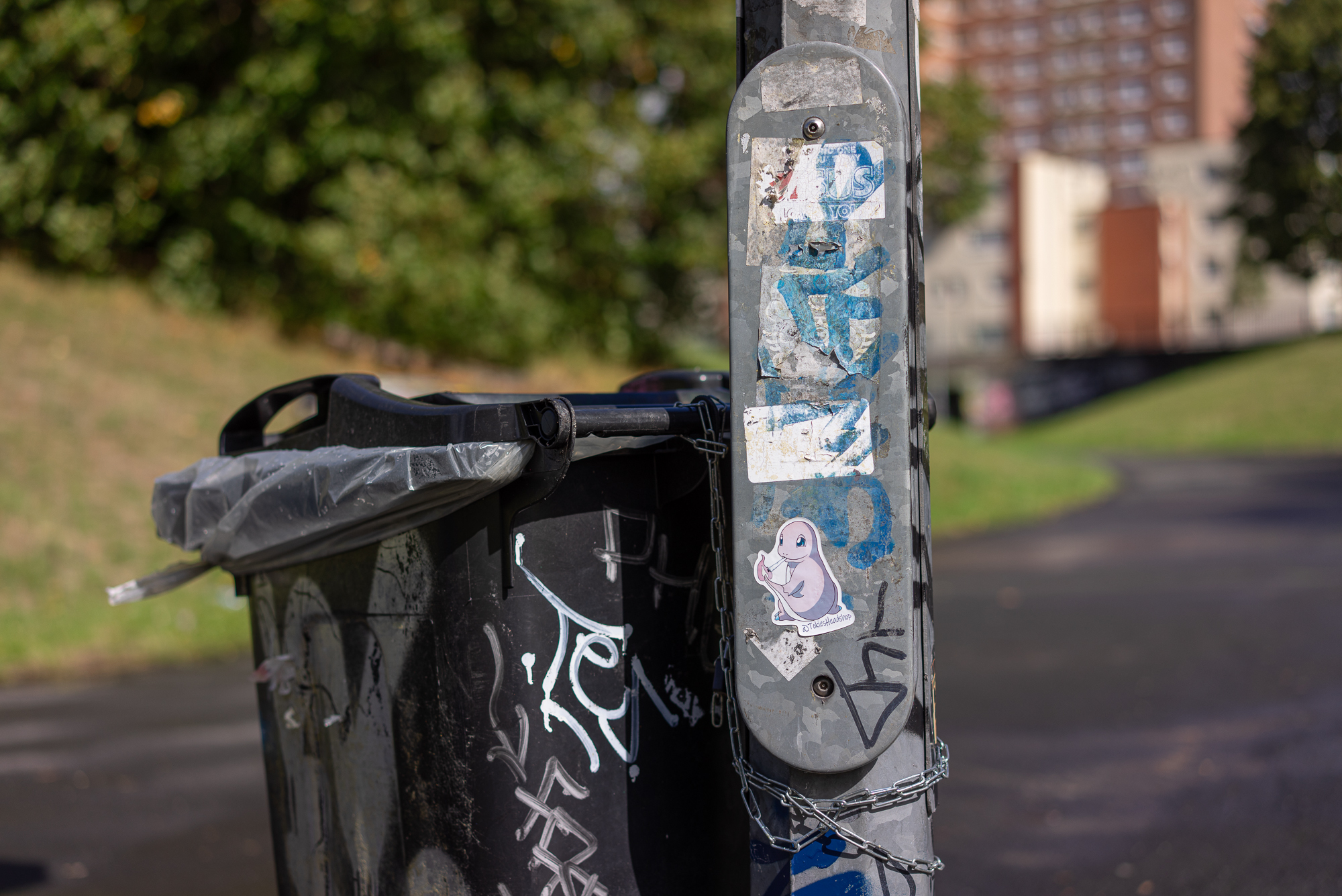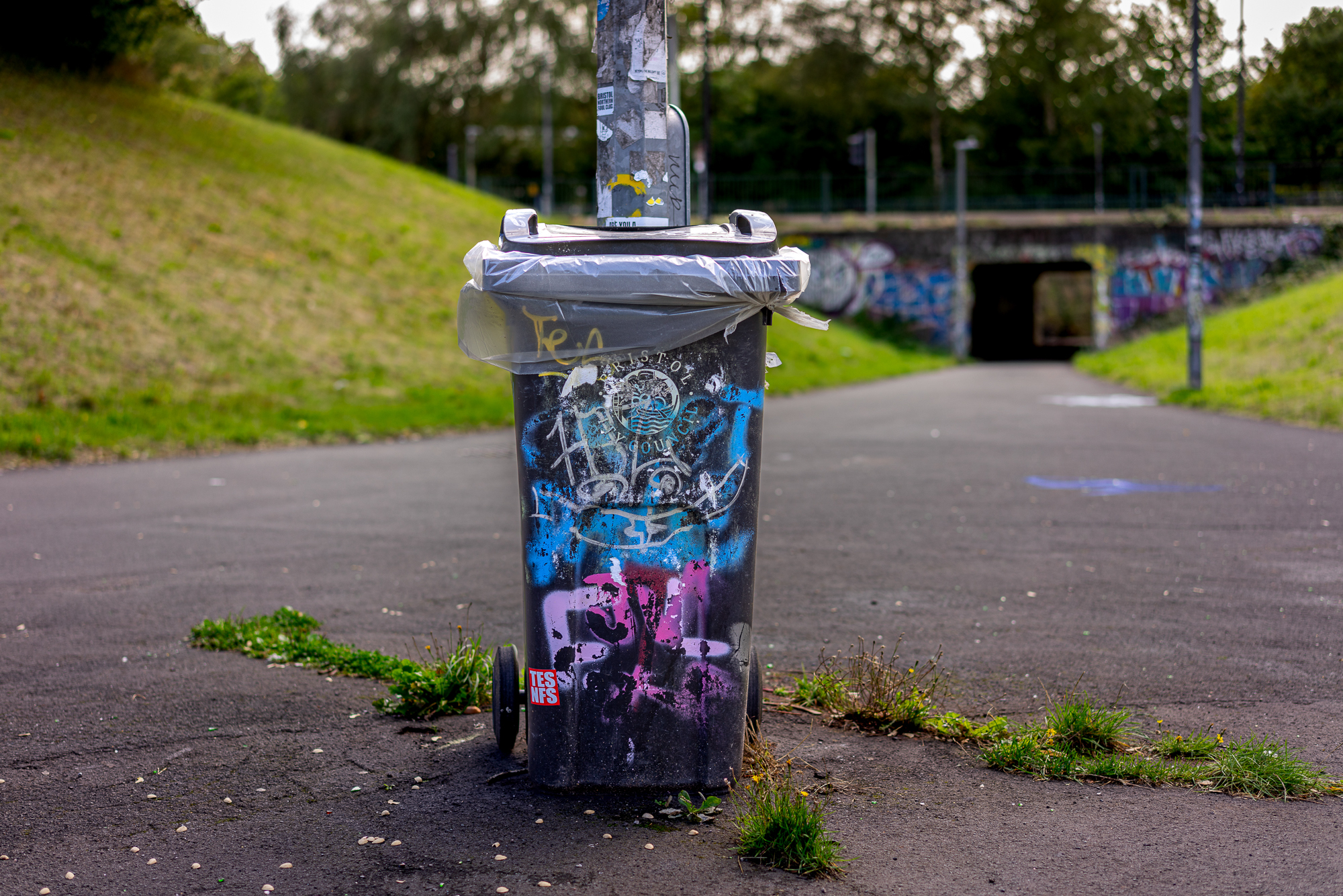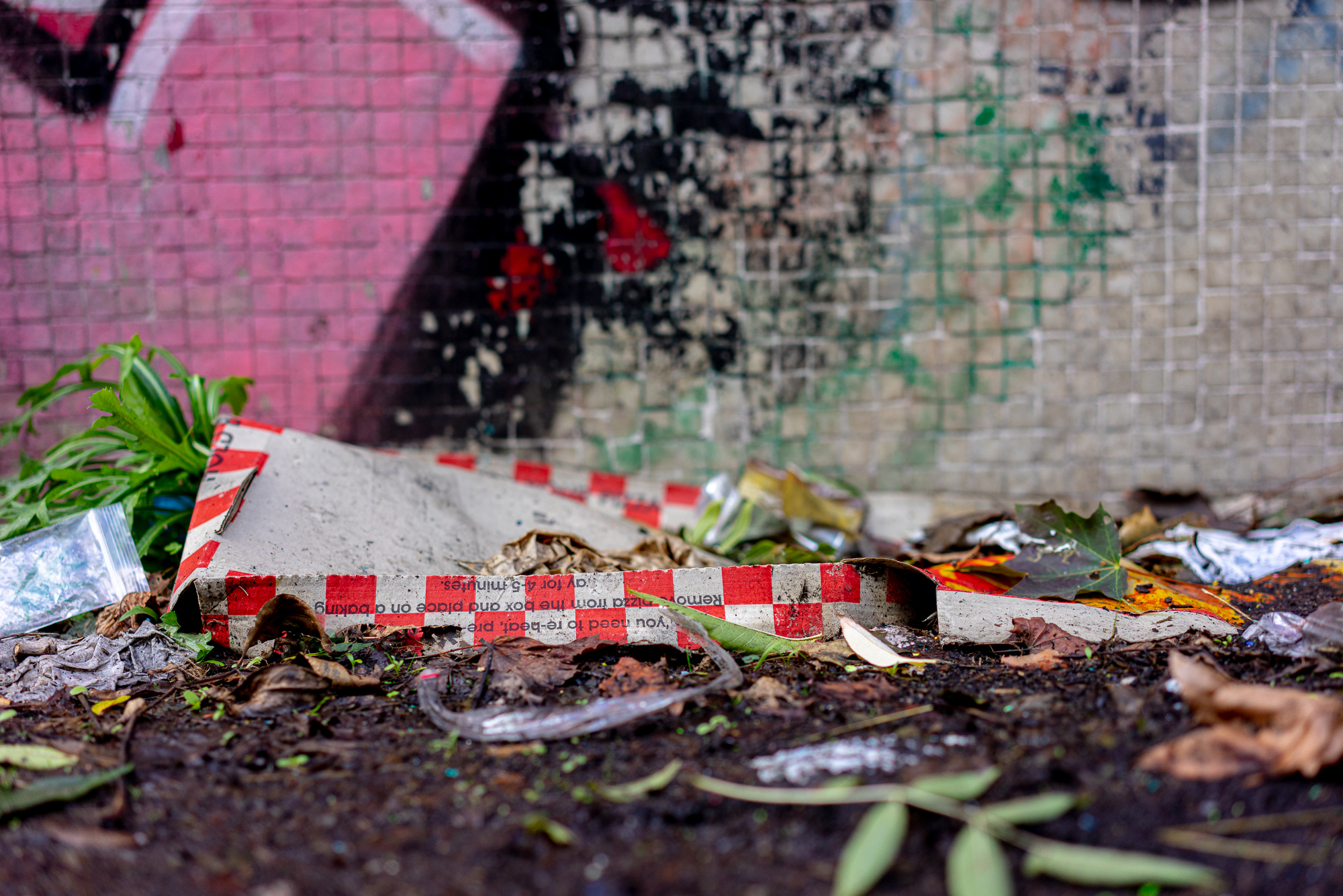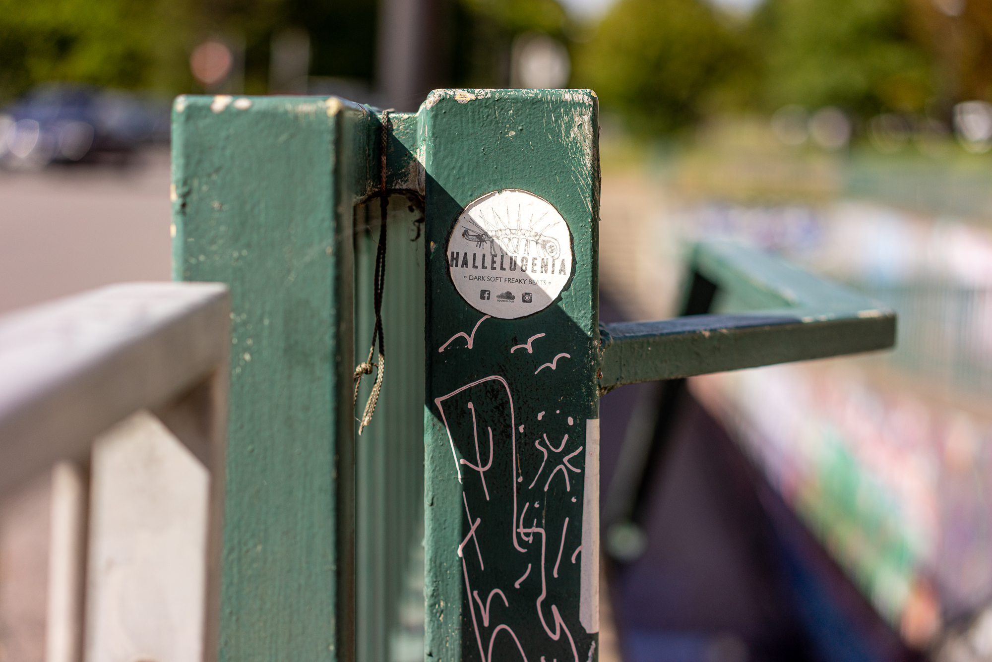 The underpass under Lawrence Hill roundabout is one of the largest in Bristol. Much graffiti has been painted on its walkways and tunnels, and posters stuck to its walls. Also it is possible to find items deposited, things like cups, cans and bottles but also sometimes more personal and substantial items such as handbags and articles of clothing. These items can be found on the ground beside the graffited walls but also sometimes wedged in between the handrails which trail around the underpass. The handrails are multi-coloured and often reflect the spray paint of the walls behind.