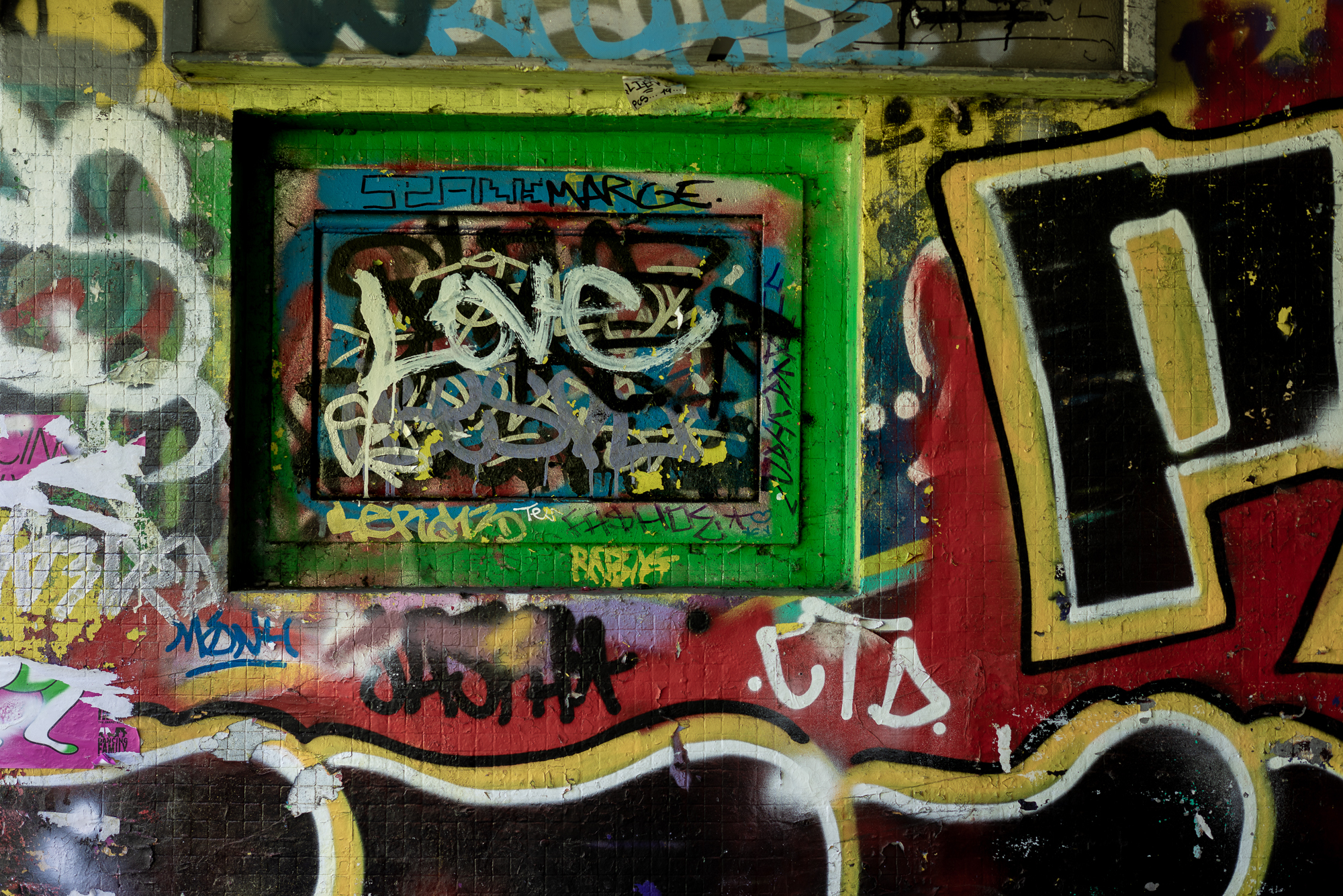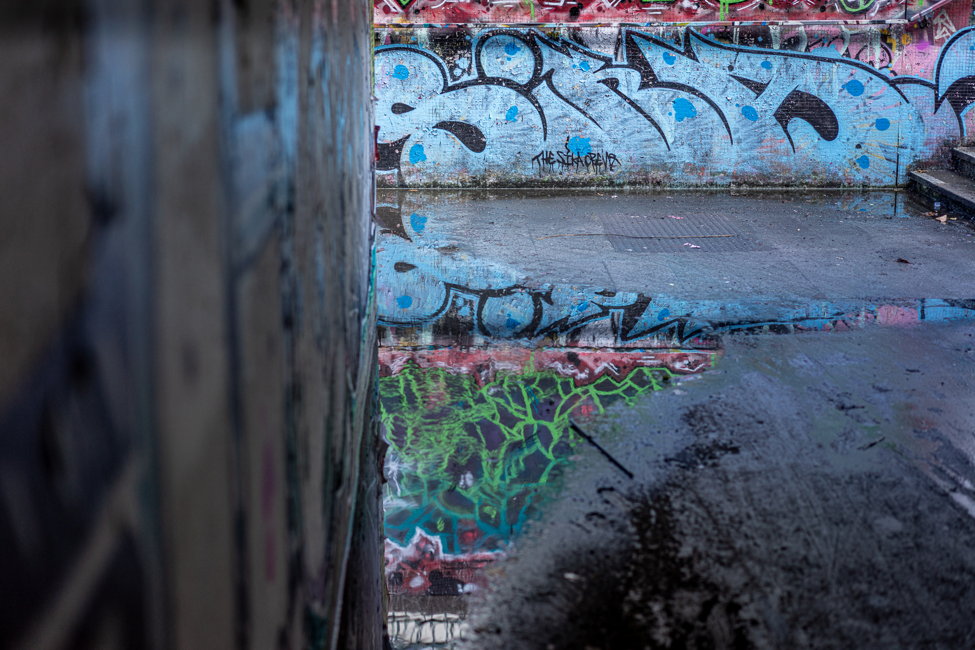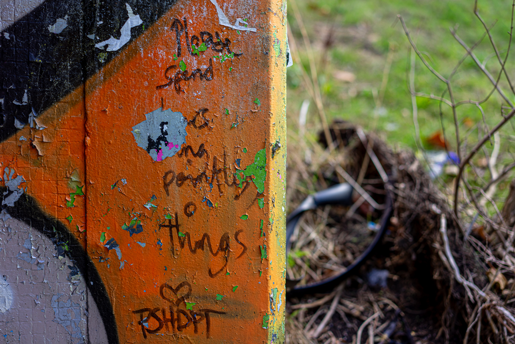 I returned to the Underpass today before visiting the Martin Parr Foundation for talks by Magnum photographers Jim Goldberg and Alessandra Sanguinetti. There were fewer deposited objects today, just clothing, some cans and a pizza box. I enjoy the personal items, I derive a better sense of attachment to people who use the underpass. The graffiti and written words seem more distant to me, like hieroglyphics, a different language, statements I struggle to understand. I guess connection is important….