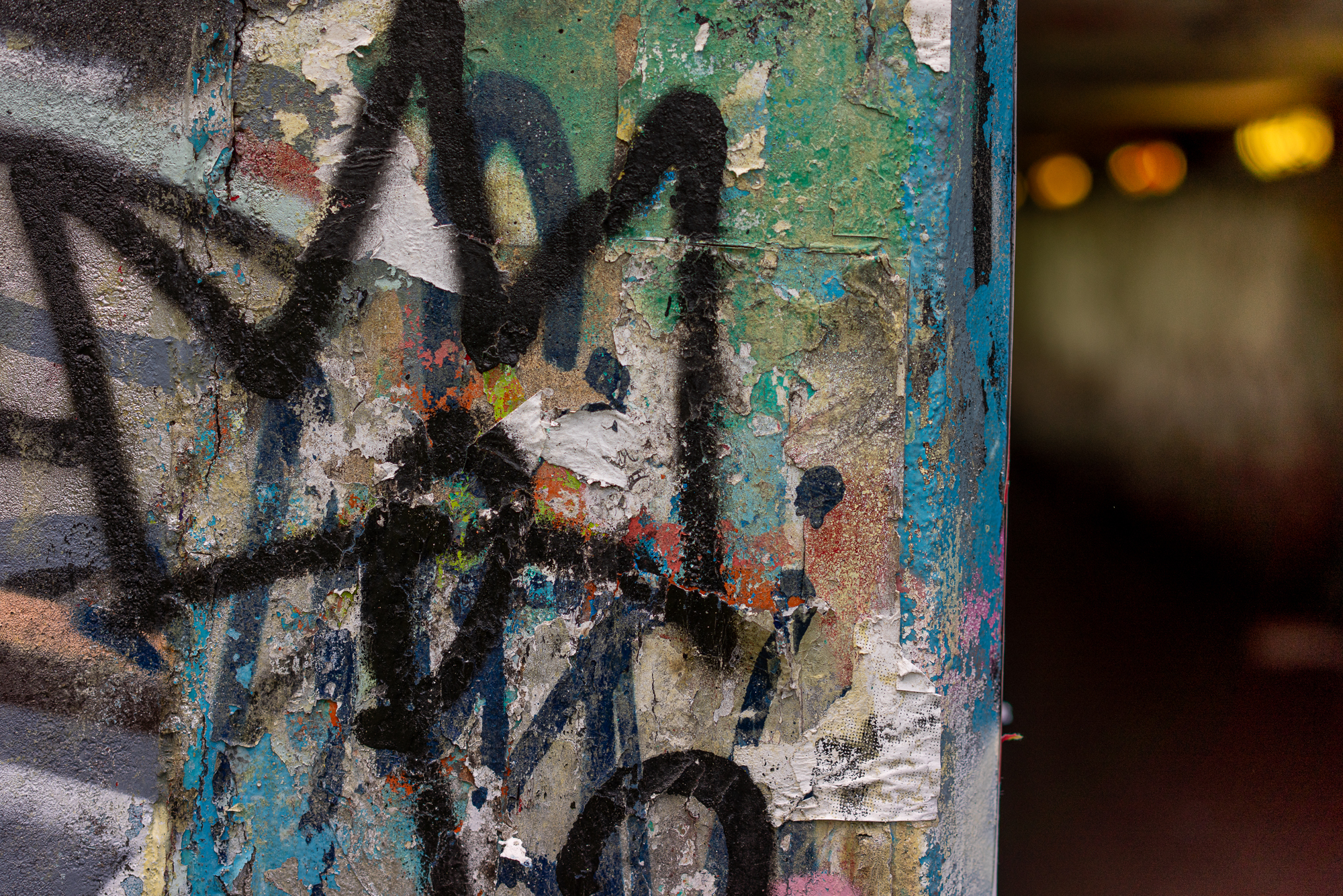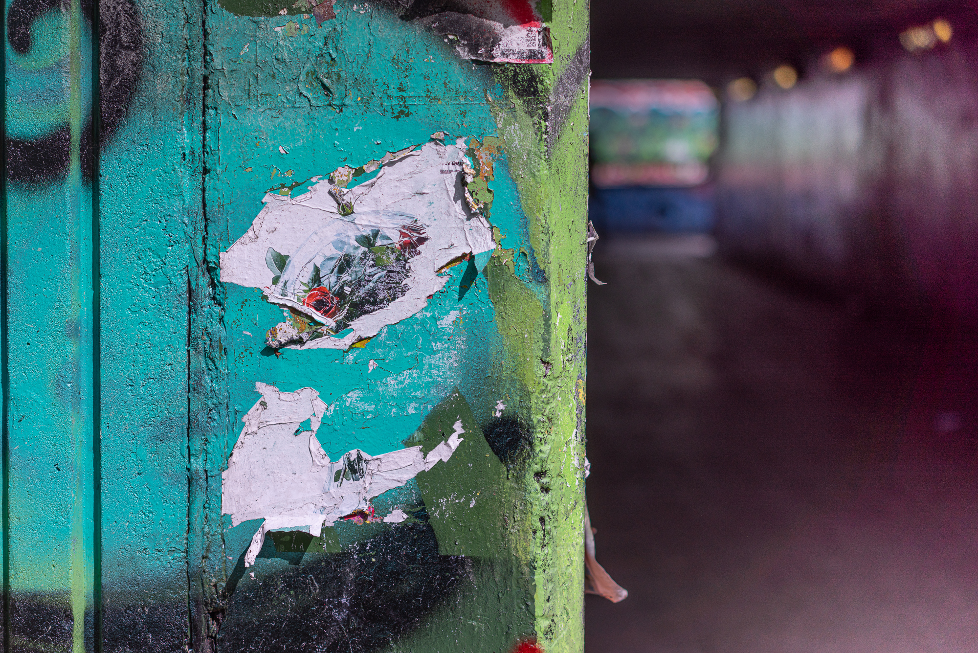 Posters advertising a variety of events can be found throughout the underpass, but smaller more obscure notifications are posted on the lamp-posts throughout. Some of these seem surreal, almost coded. I enjoy the way the posters degrade; elsewhere in my blog I have described graffiti as being a palimpsest, layers of archived material which can allow earlier material to be discerned. As posters degrade and tear earlier objects become visible.