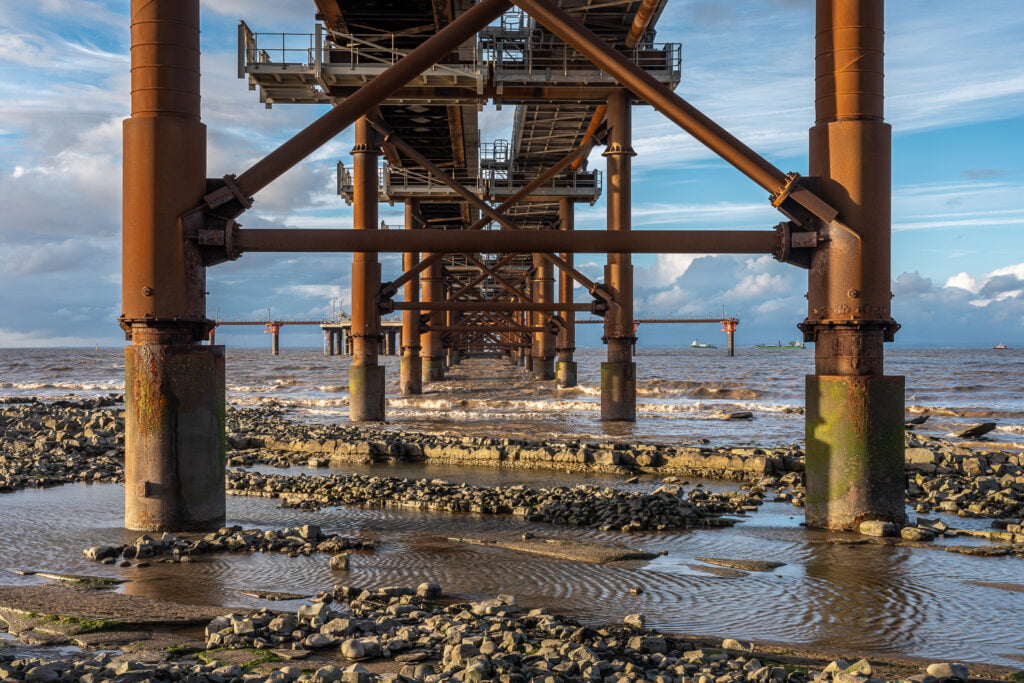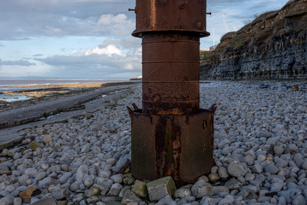 The beach adjacent to the building site of Hinkley C nuclear power station is reached by following a non-signposted one way road until it leads to a muddy track, and then by driving along the track until parking beside an articulated bouy at the track’ end. Walk through the gateway, over an undulating hill and along a path to the coast path which bifurcates just above the beach, the left path leading to Minehead and the hills of Exmoor and the right hand path down towards the beach . A long rusting metal pier stretches out into the sea,. Just beyond the pier a collection of silver towering construction cranes fabricate the new nuclear building.